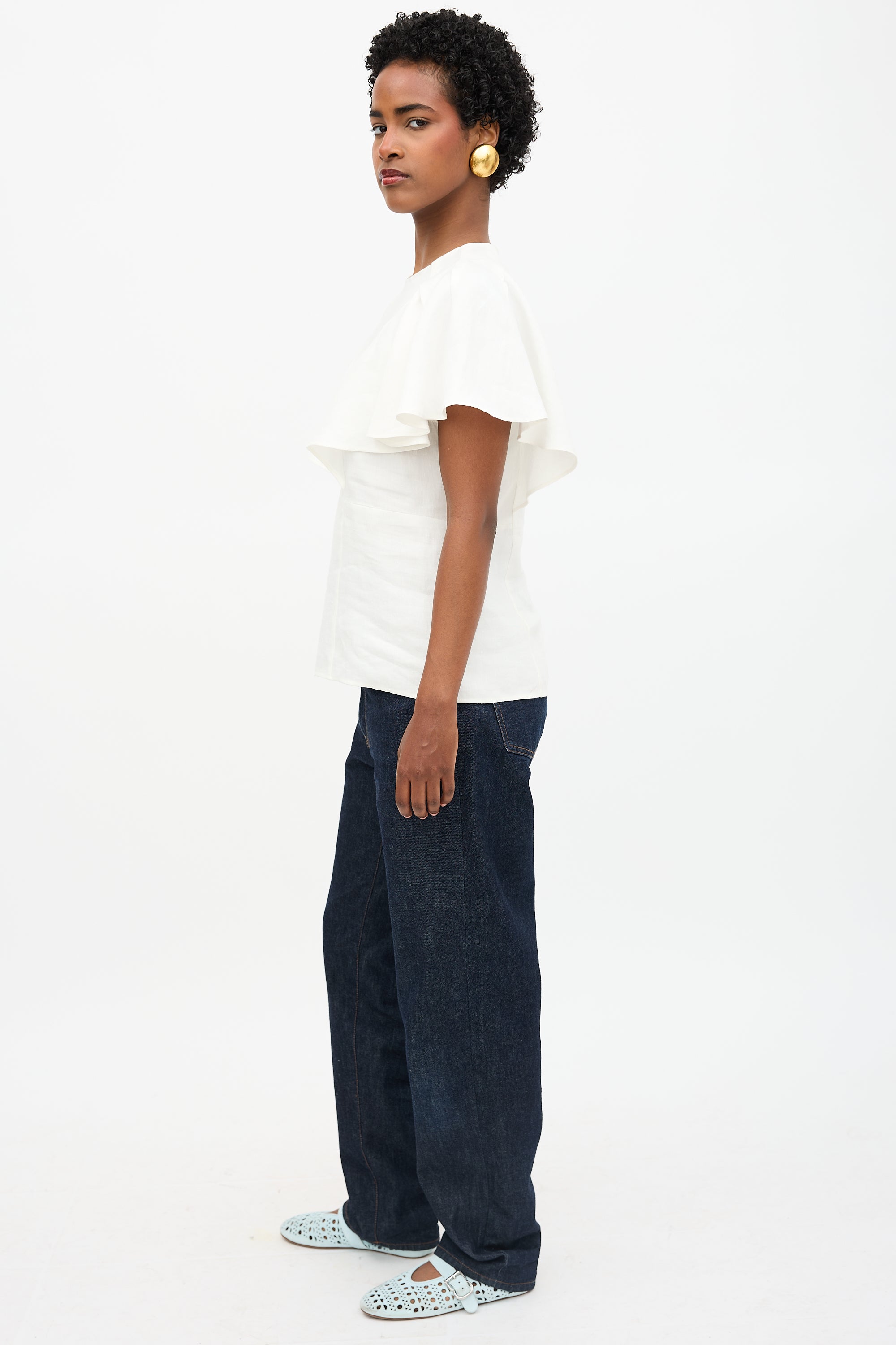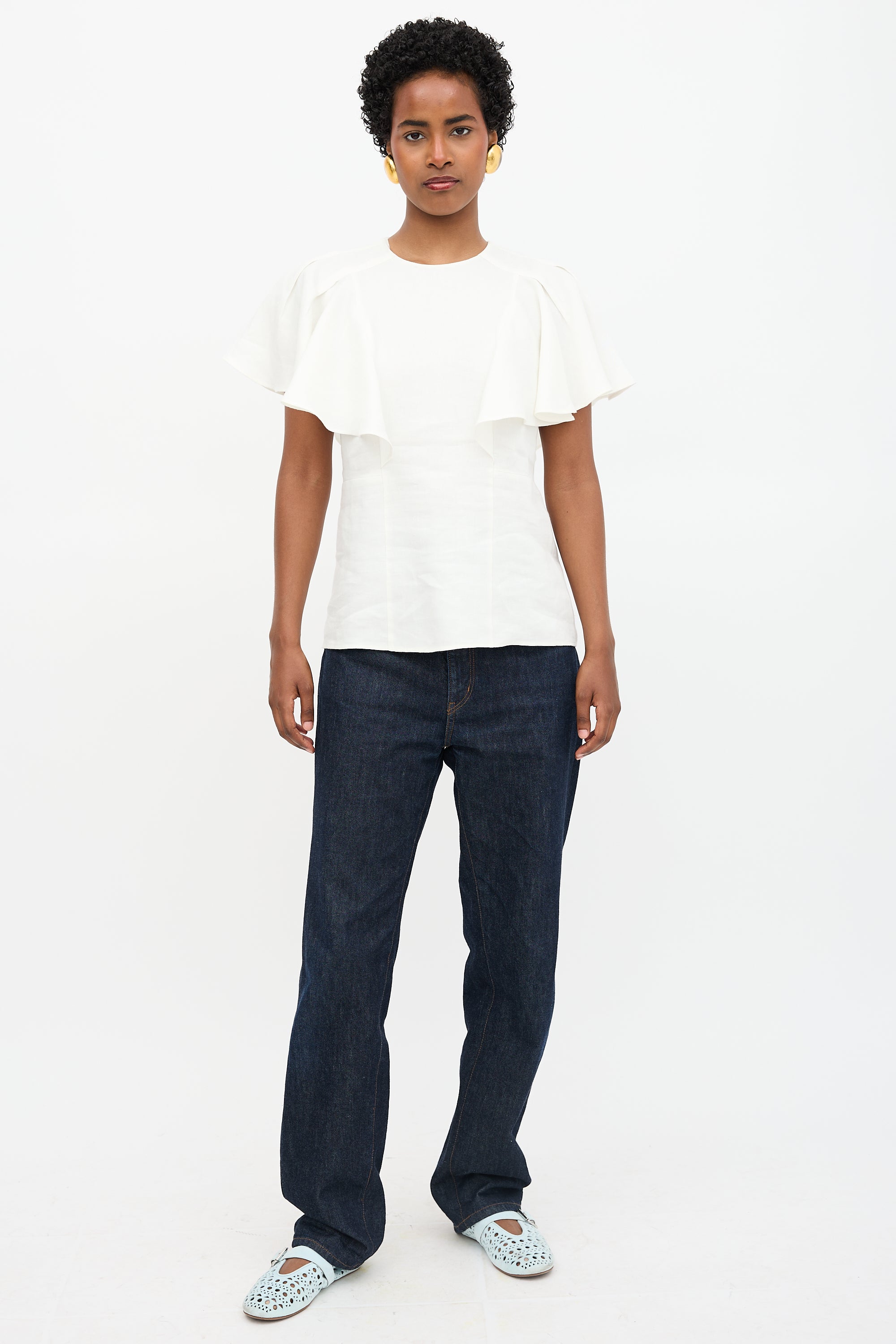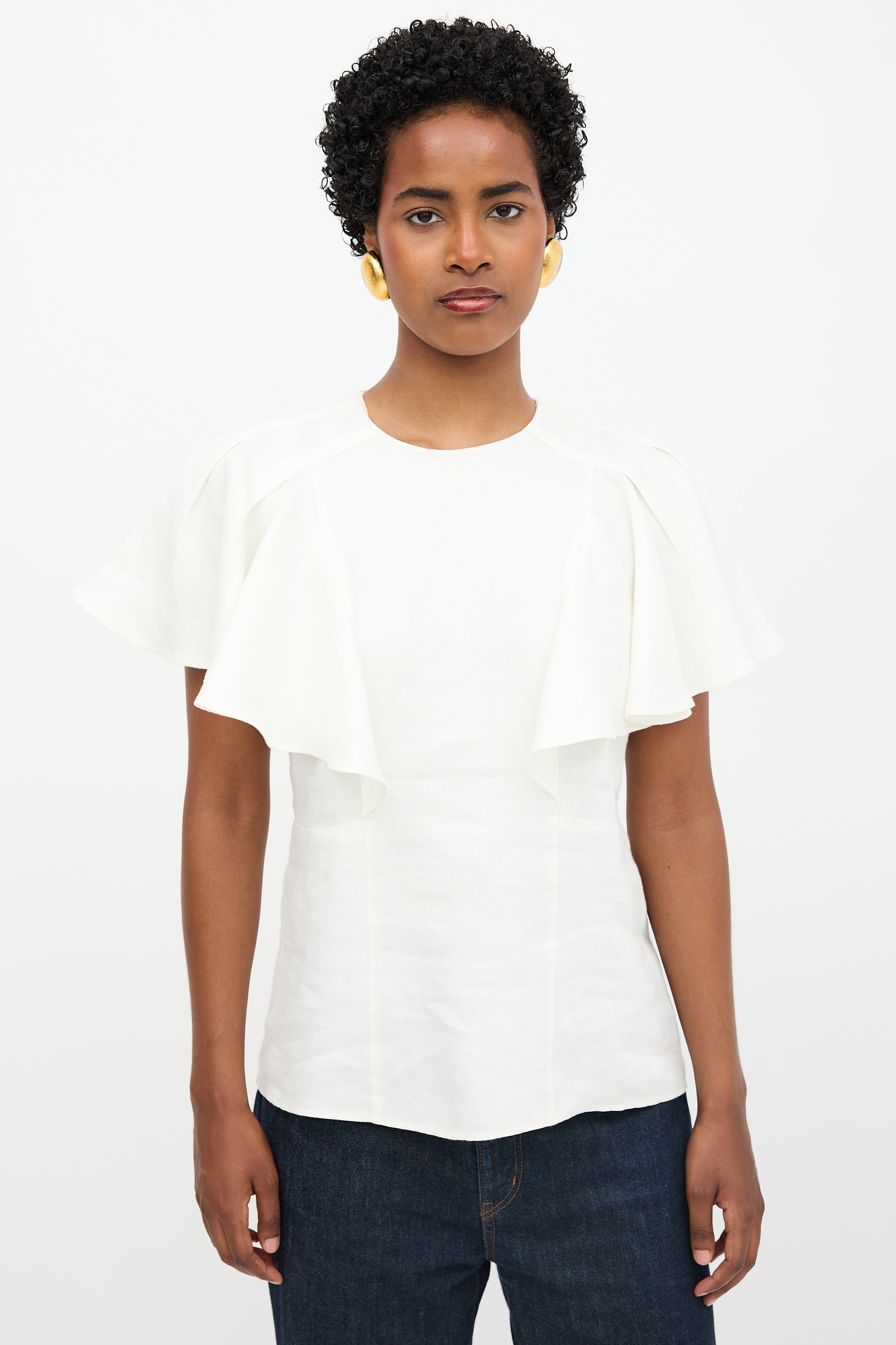 Pre-owned Chloé cream linen blouse featuring round neckline, pleated butterfly sleeves, and concealed back zip. Unlined.