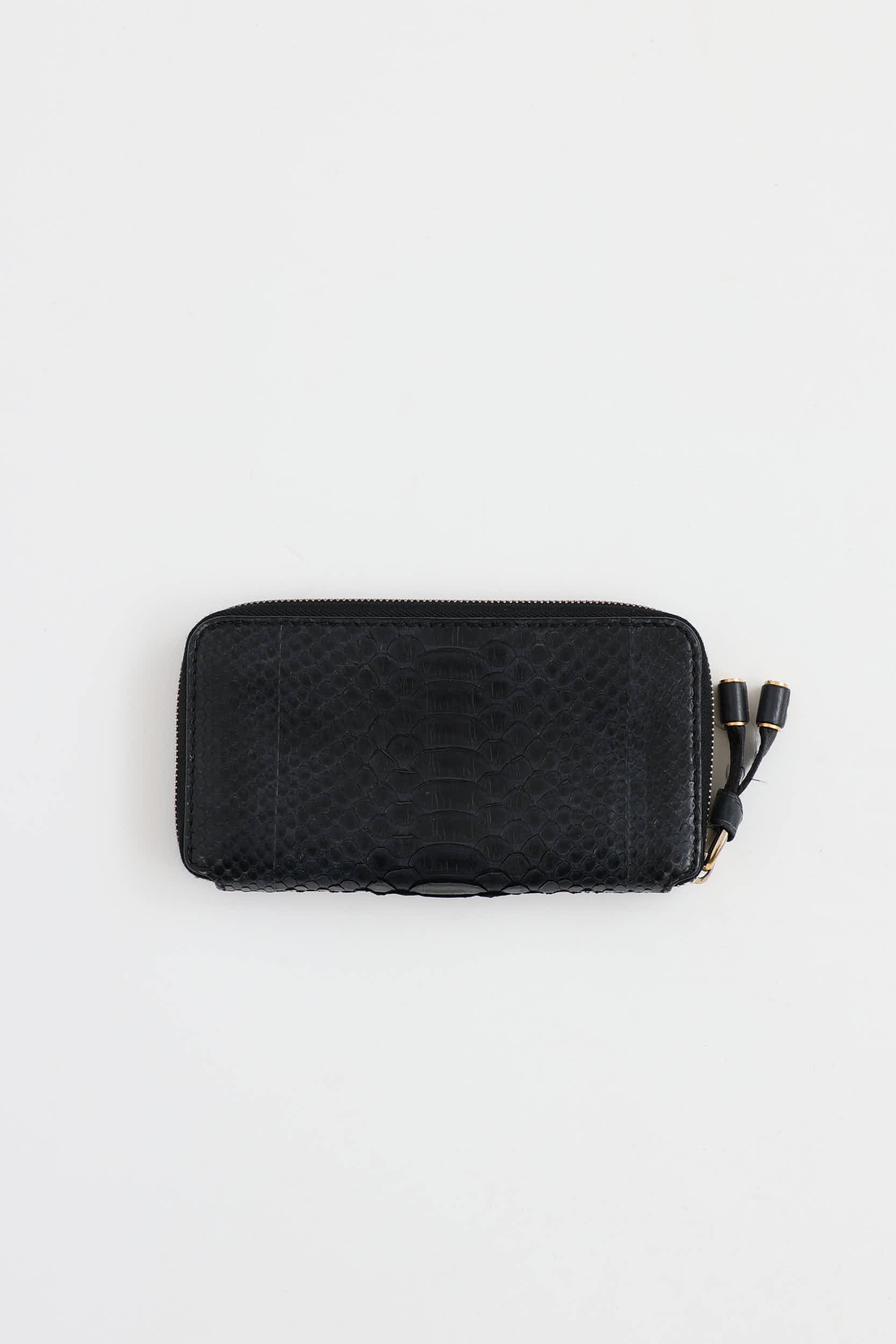 Pre-owned Chloe navy Marcie python long wallet featuring tonal stitching, gold tone hardware, zip closure, two main compartment, one zip pocket divider, two bill slots, and twelve card slots. No CITES certificate of authentication is included.