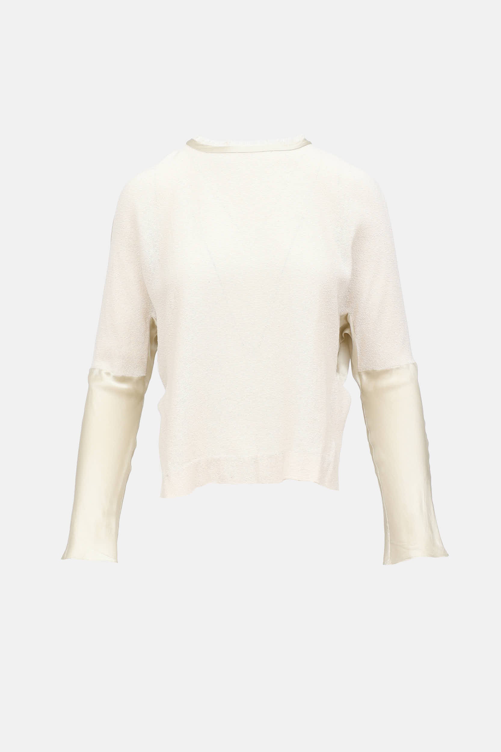 Pre-owned Chloé cream silk top featuring a round fringe neckline, long sleeves, knit body, slits at hem, and zip closure at back. Lined.