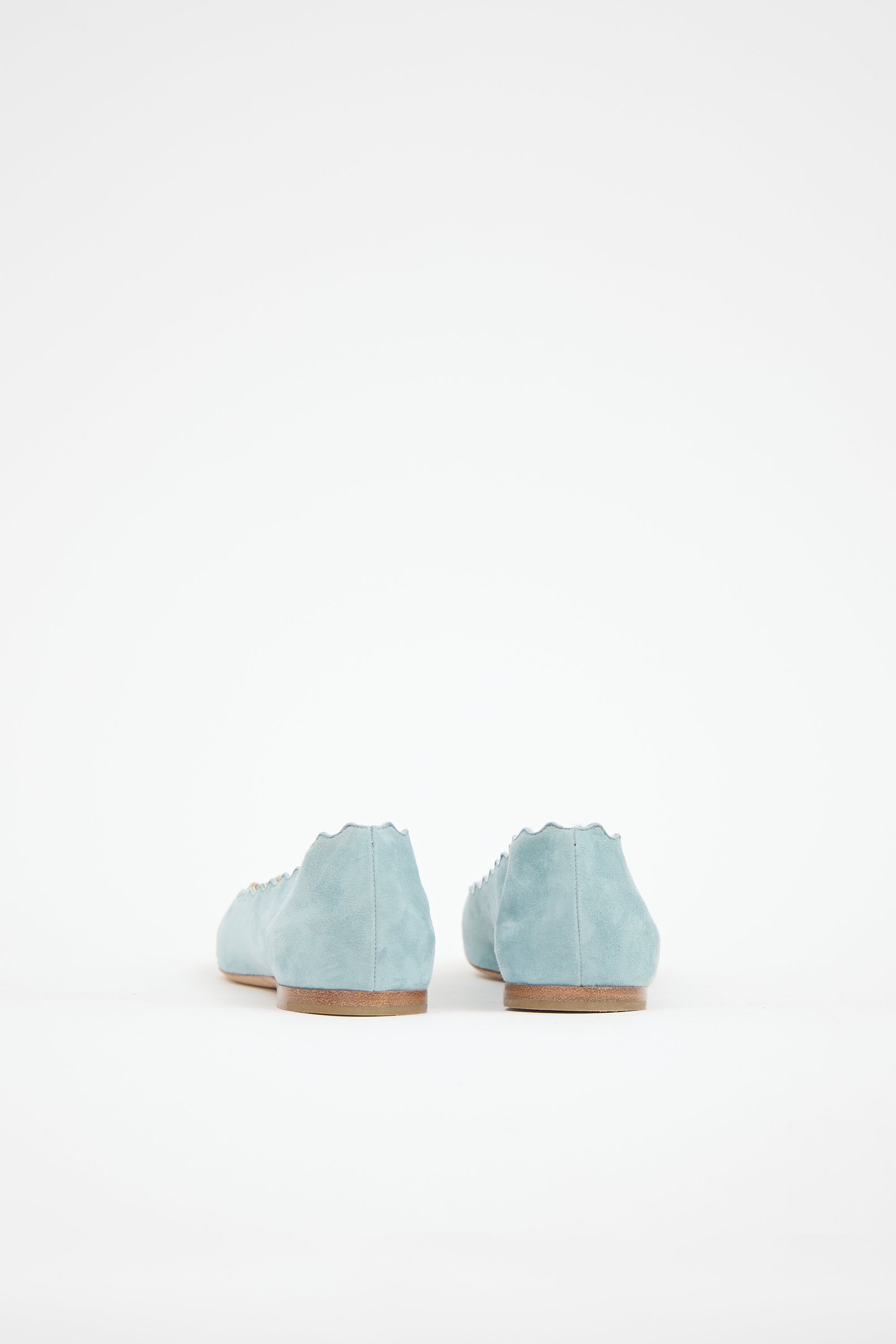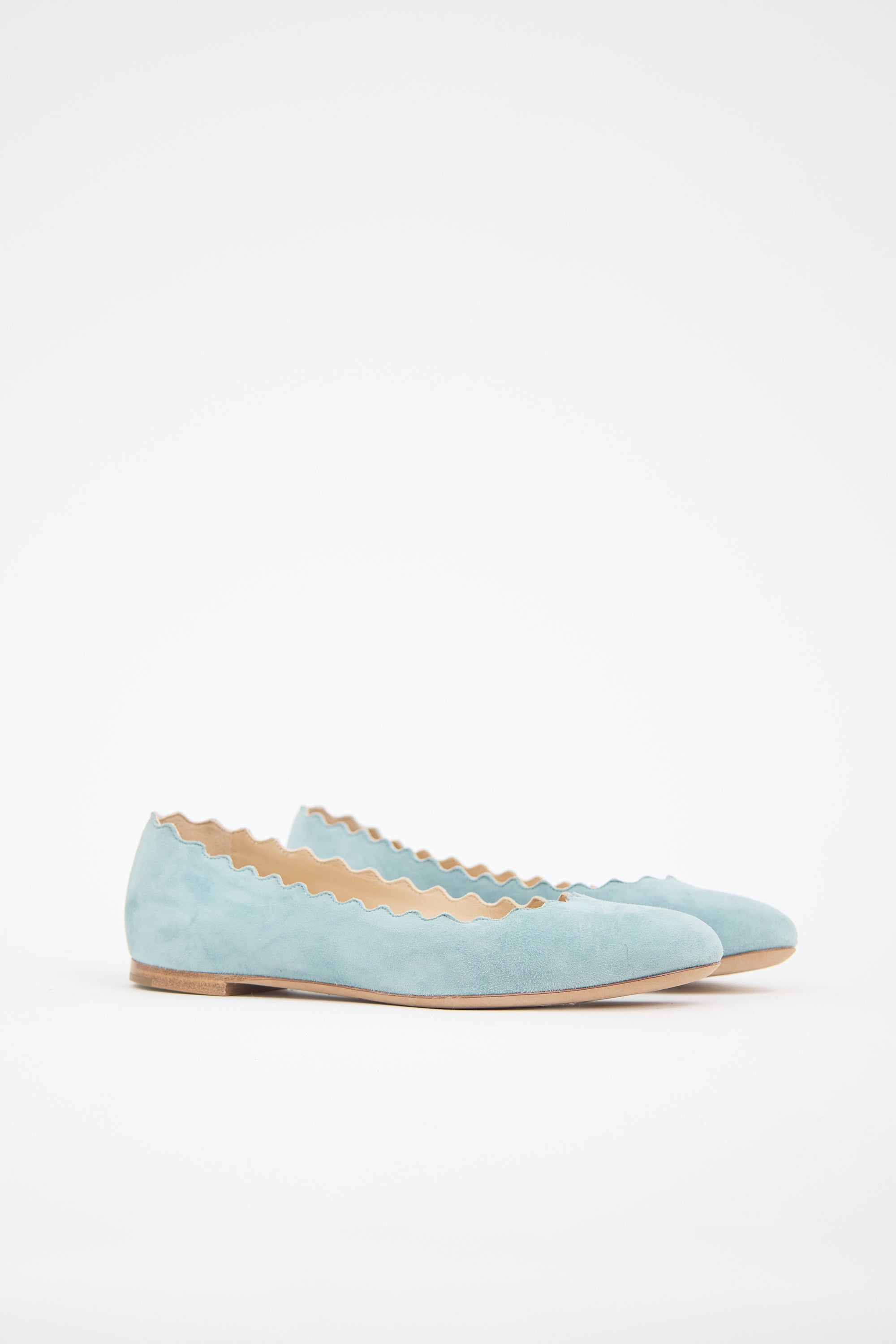 Pre-owned Chloé blue suede Lauren ballet flats featuring rounded toe, scalloped topline trim, and leather insole and outsole.