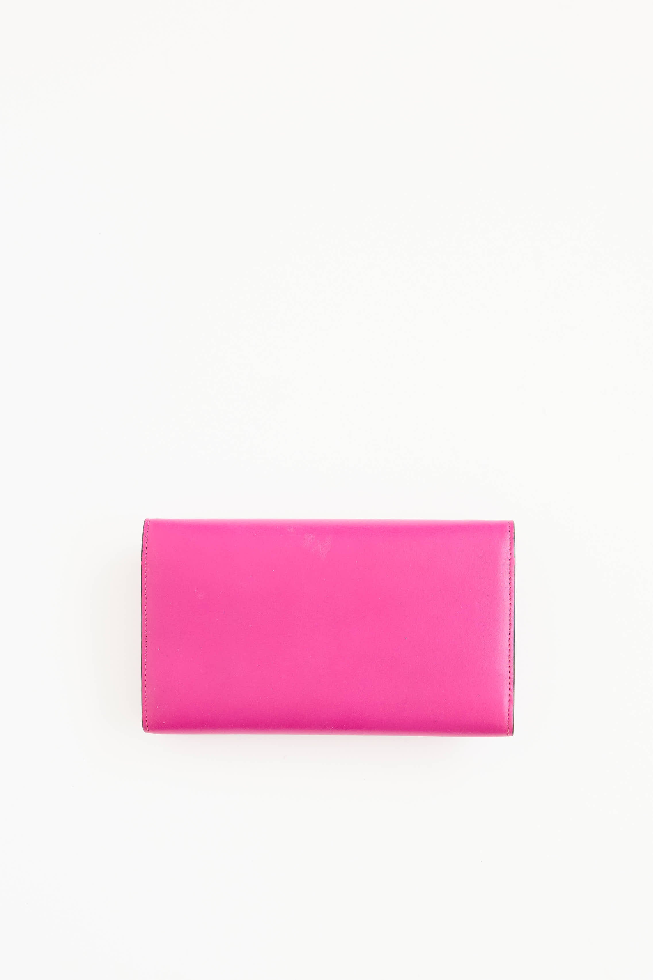 Pre-owned Christian Louboutin pink long wallet featuring gold tone embellished spikes at front, top flap closure, flat leather wristlet strap, snap closure, one main compartment, 12 card slots, two bill slots, and one zip coin pouch.