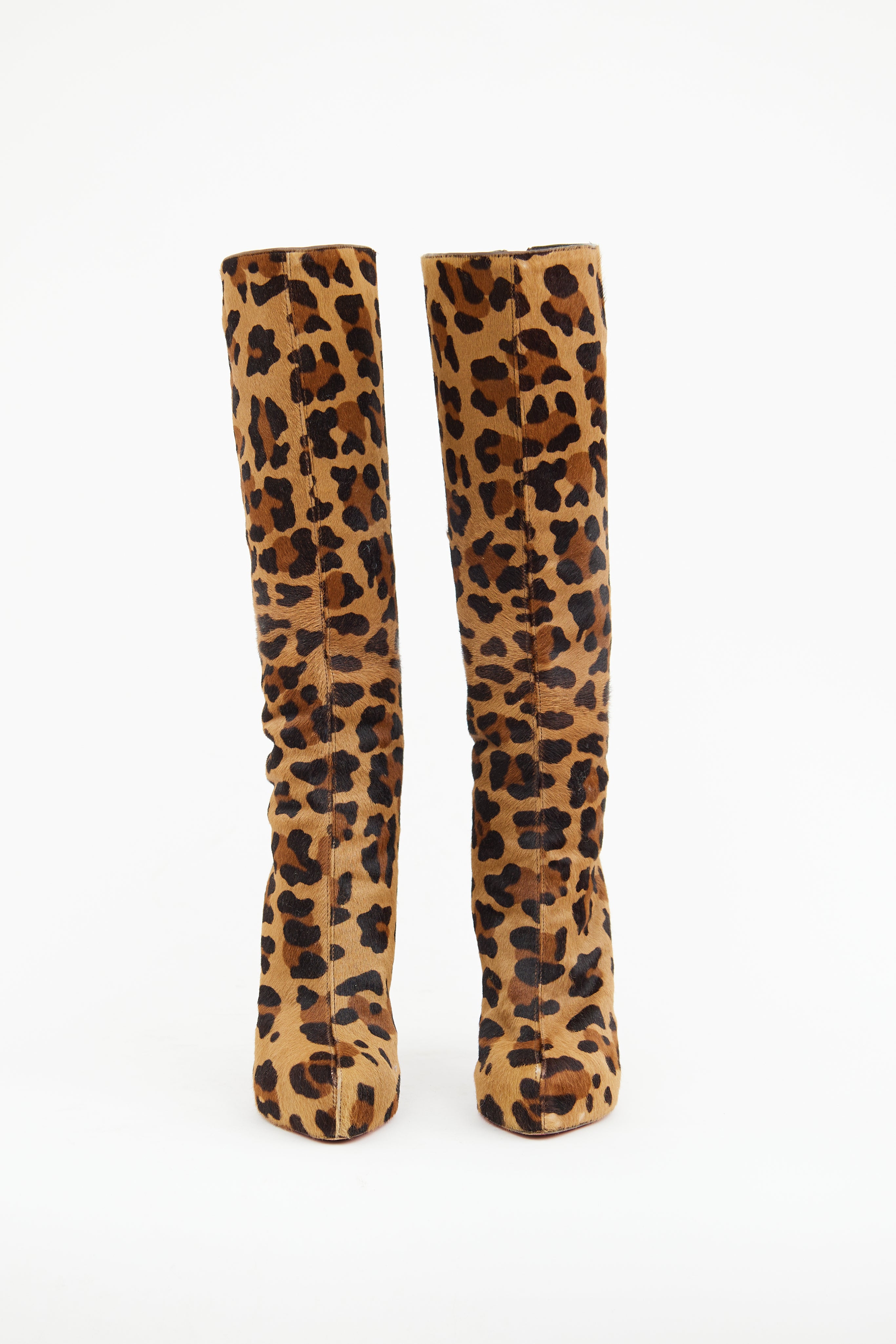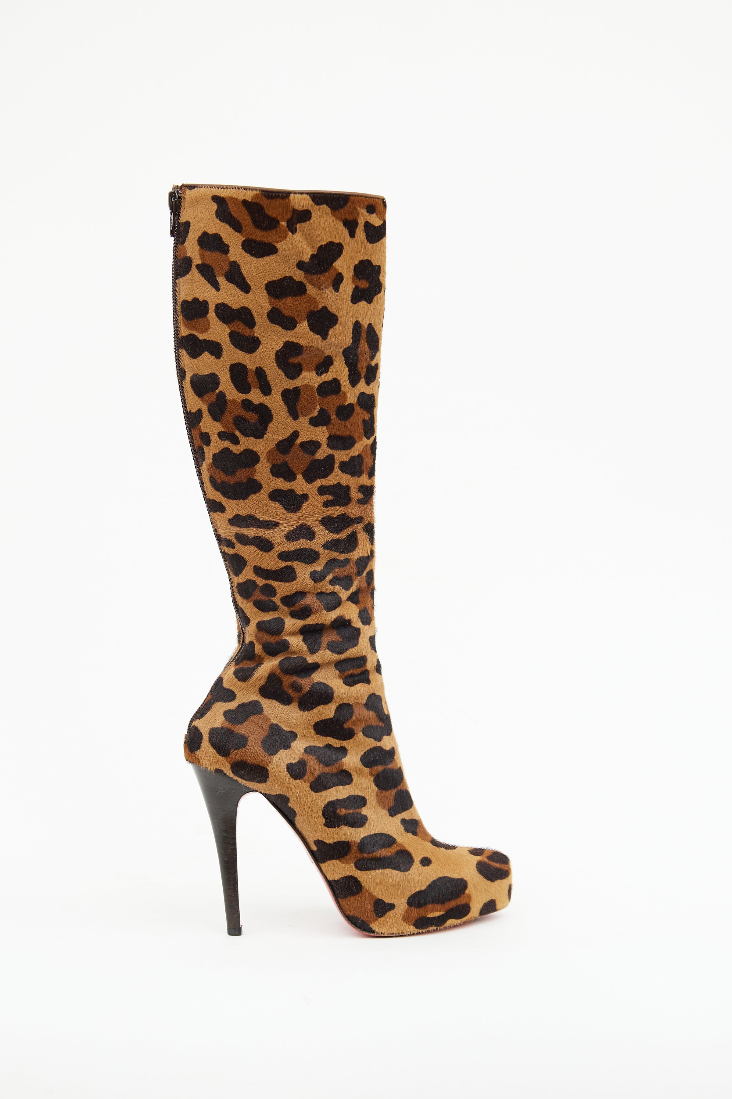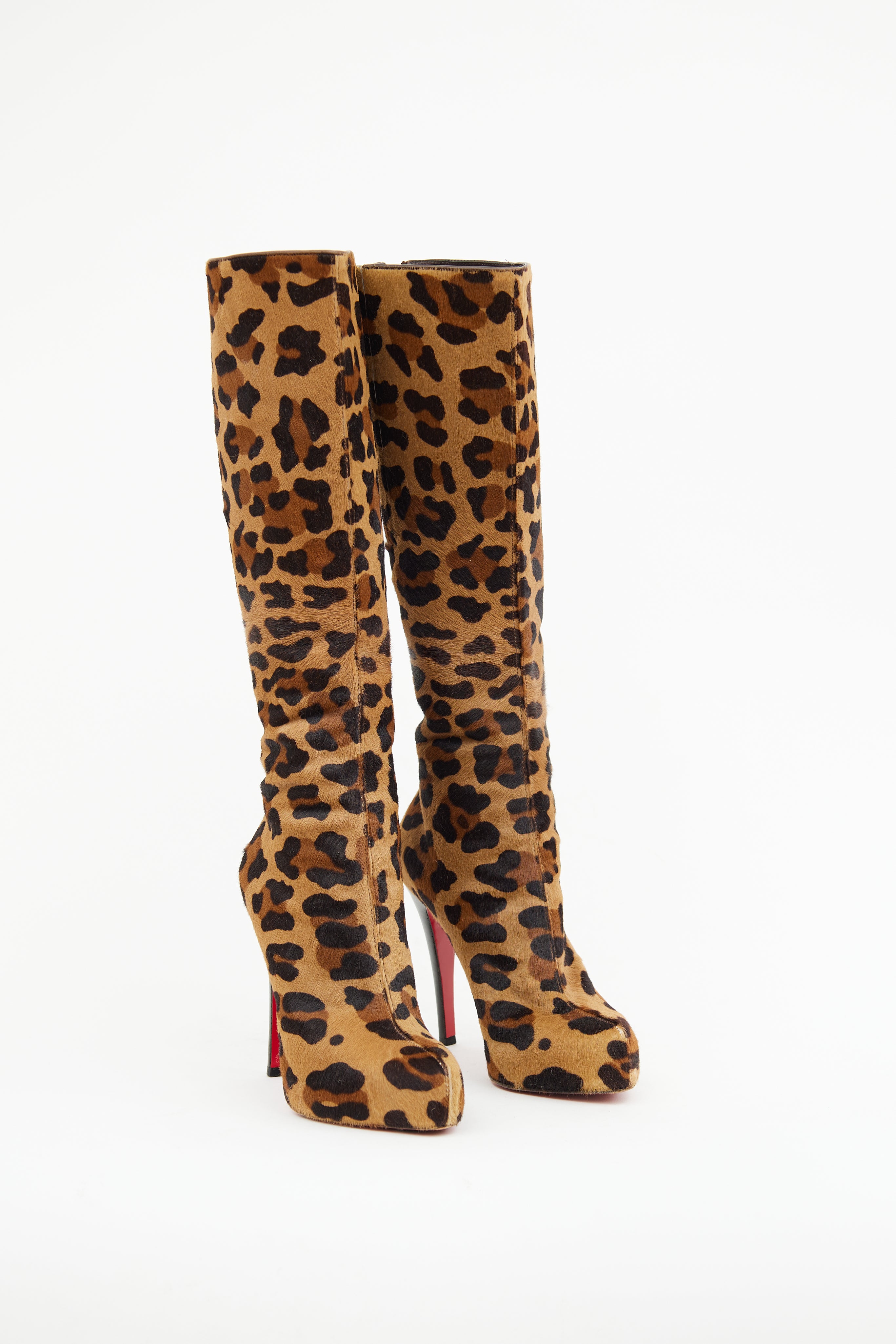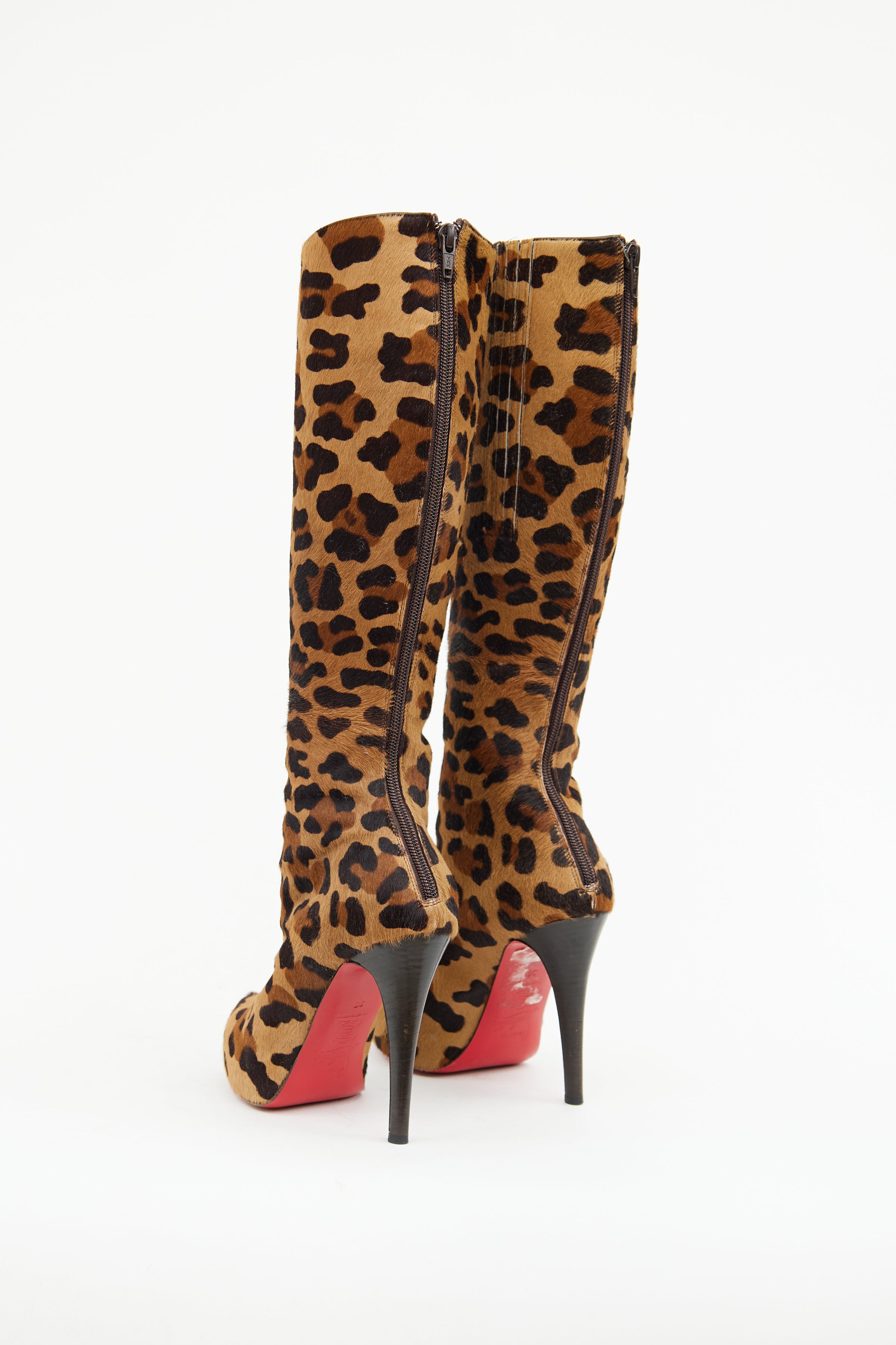 Pre-owned Christian Louboutin Fifi calf boots featuring leopard print upper, knee high, almond toe, zip entry on back, covered stiletto heel and signature red bottom outsole.