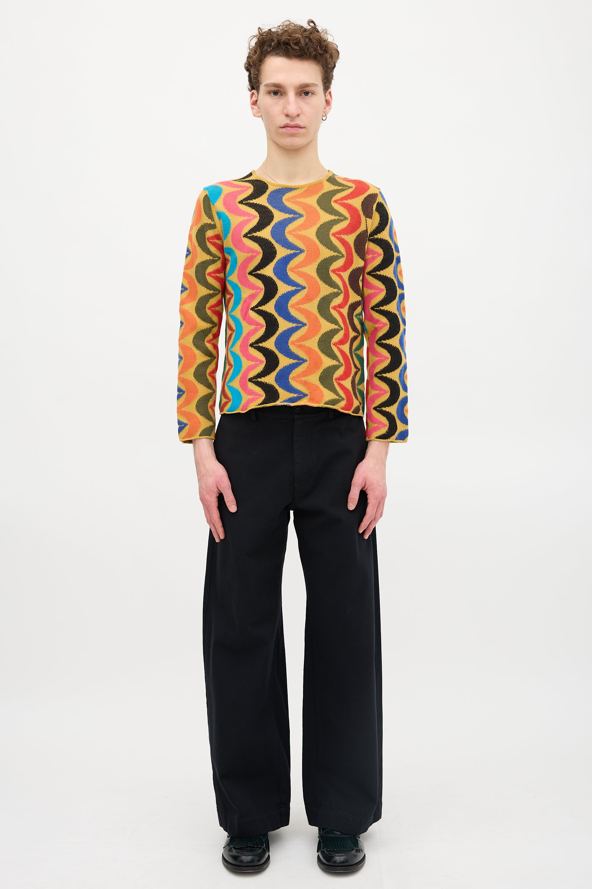Pre-owned Comme des Garçons Homme Plus Fall Winter 2001 yellow wool sweater featuring an abstract pattern throughout, round neckline, and rolled hem.