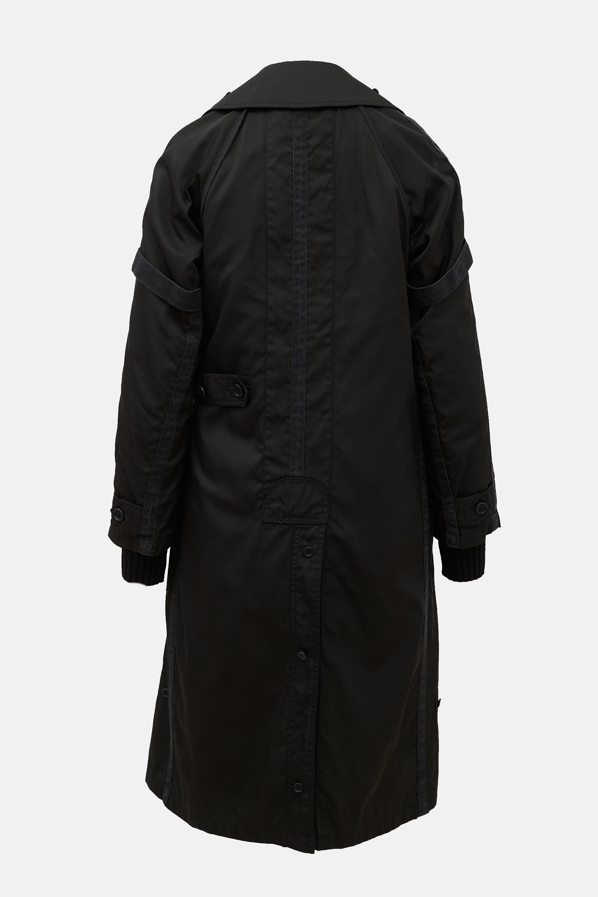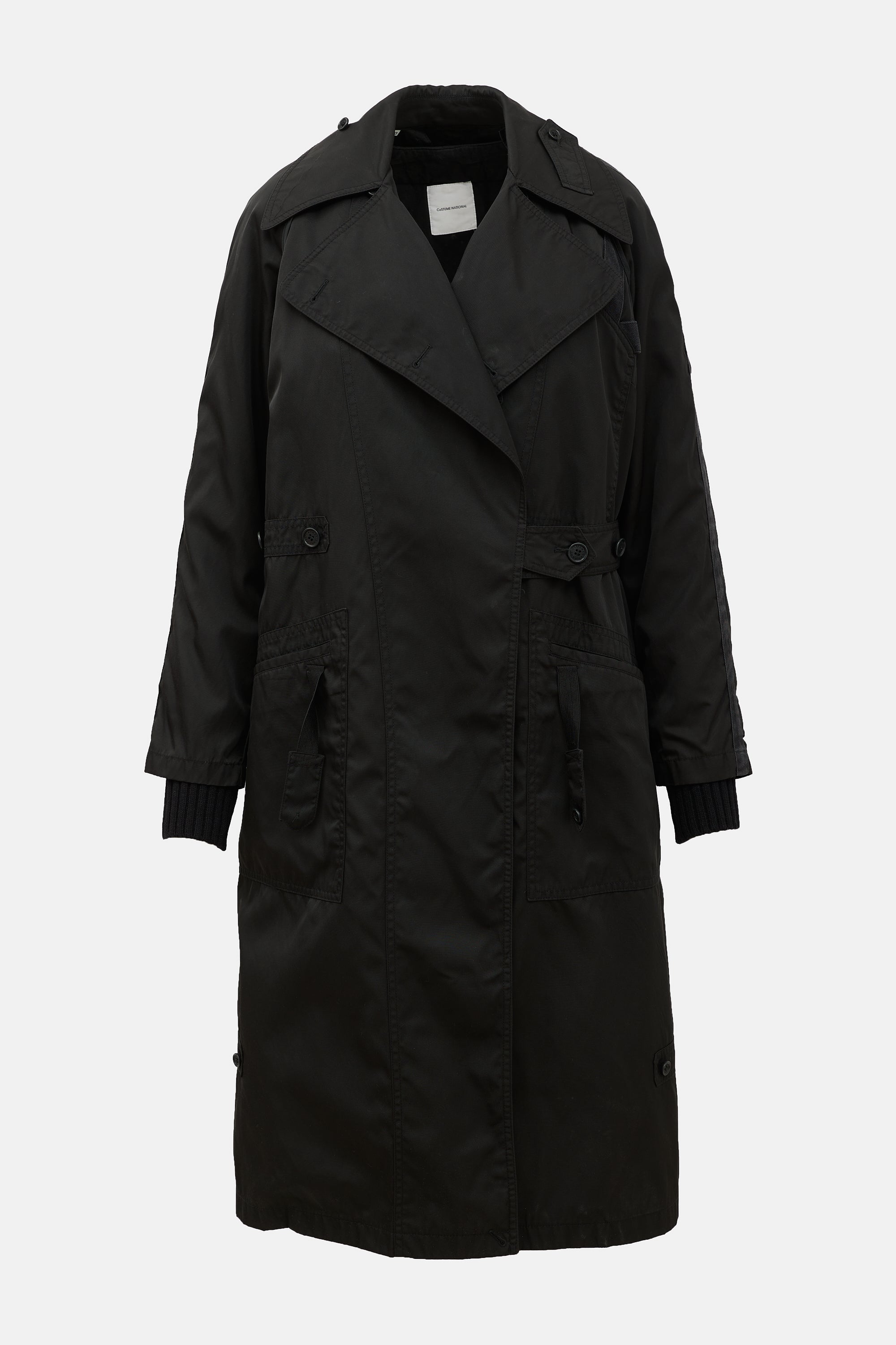 Pre-owned Costume National black nylon blend 2-in-1 trench coat featuring wide collar and lapel, flap pocket under lapel, double breasted button up front, button detail at waist, belt closure, two front patch pockets, with elastic trim, buttoned back vent, webbed trim, and buttoned cuffs. Removable lining features Y-neckline, open front, button embellishment along placket, satin sleeves, and ribbed cuffs.