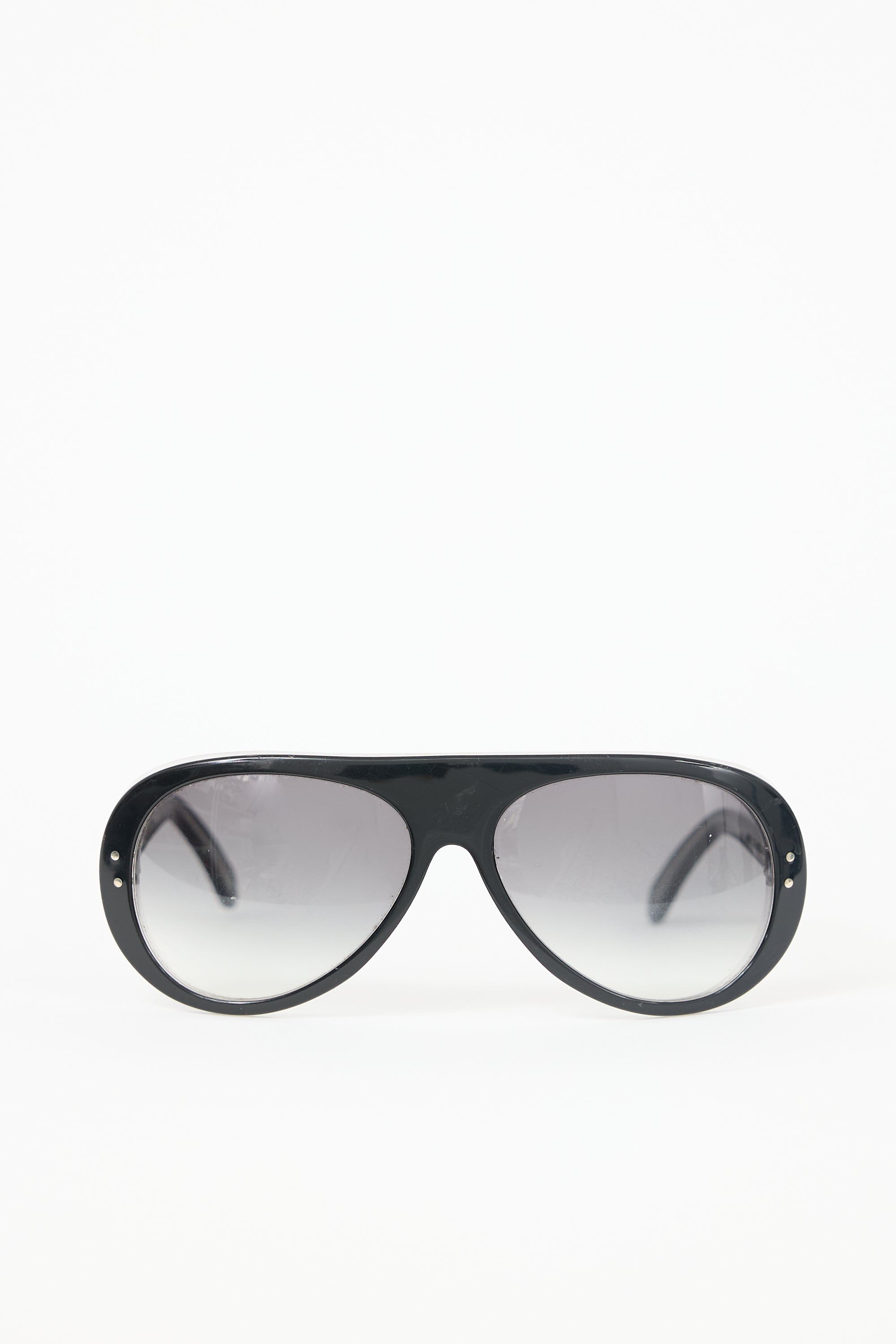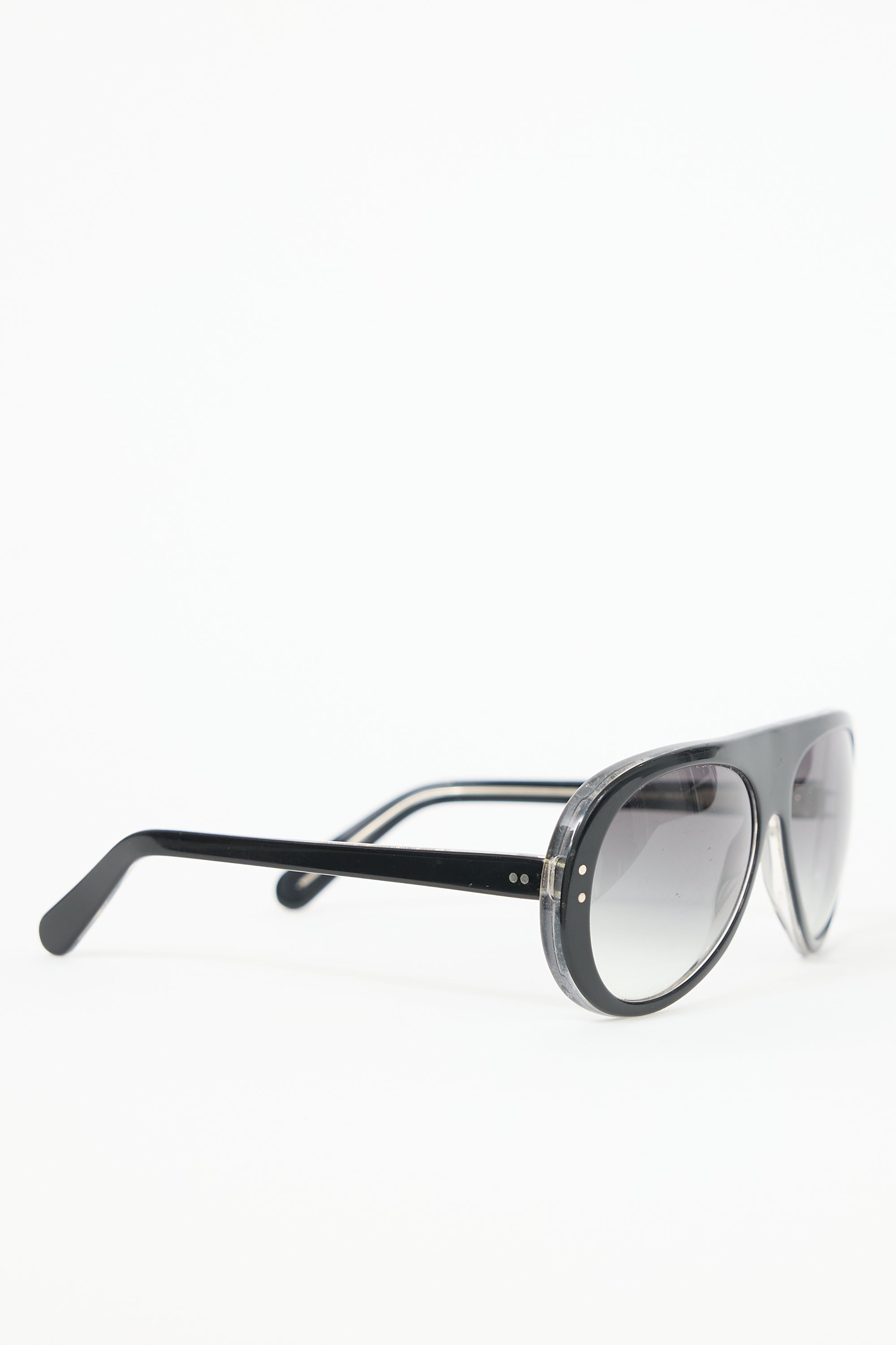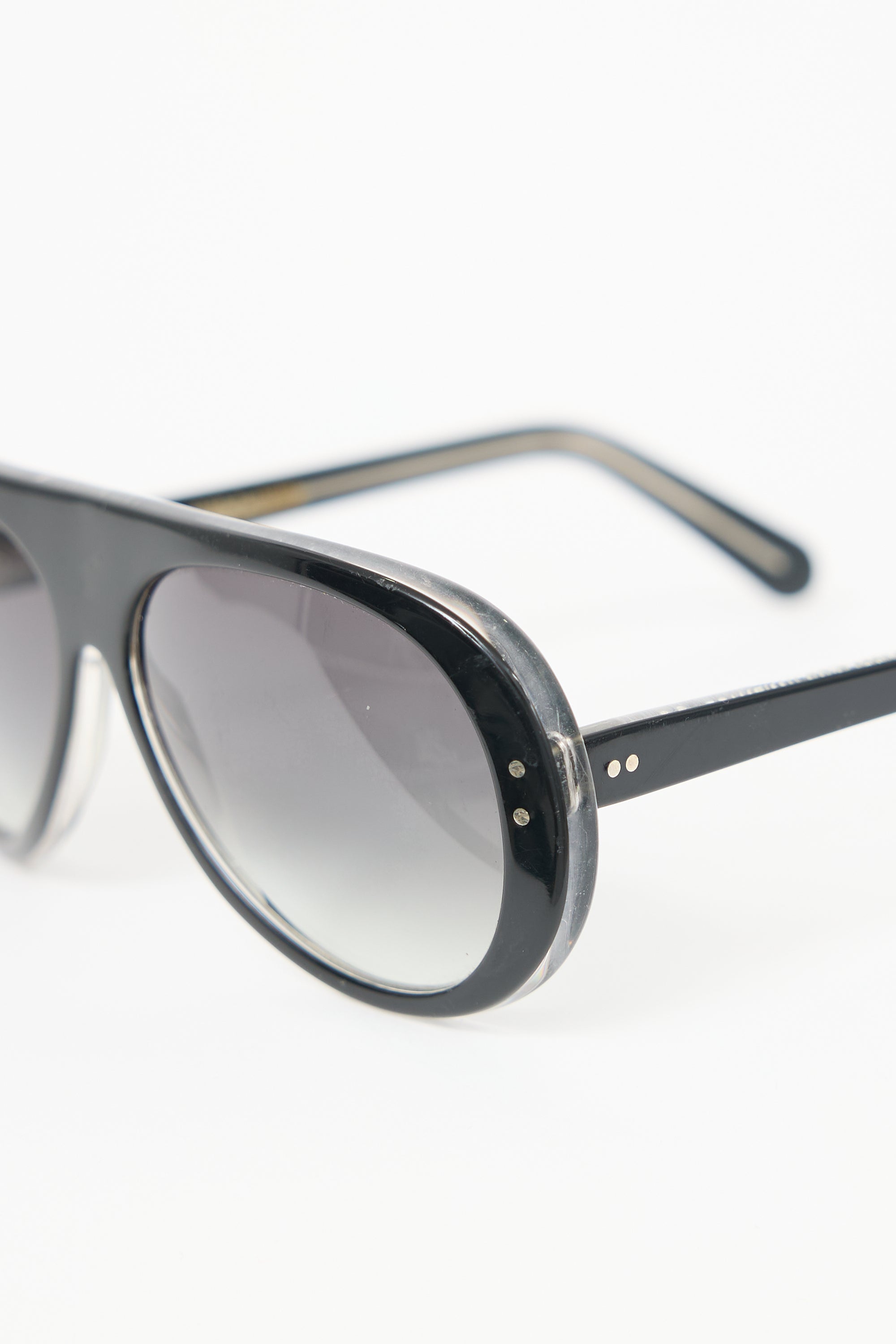 Pre-owned Cutler and Gross M0861 sunglasses featuring grey tinted lenses, black aviator frame, and nose saddle bridge. Comes with original case and wipe cloth.