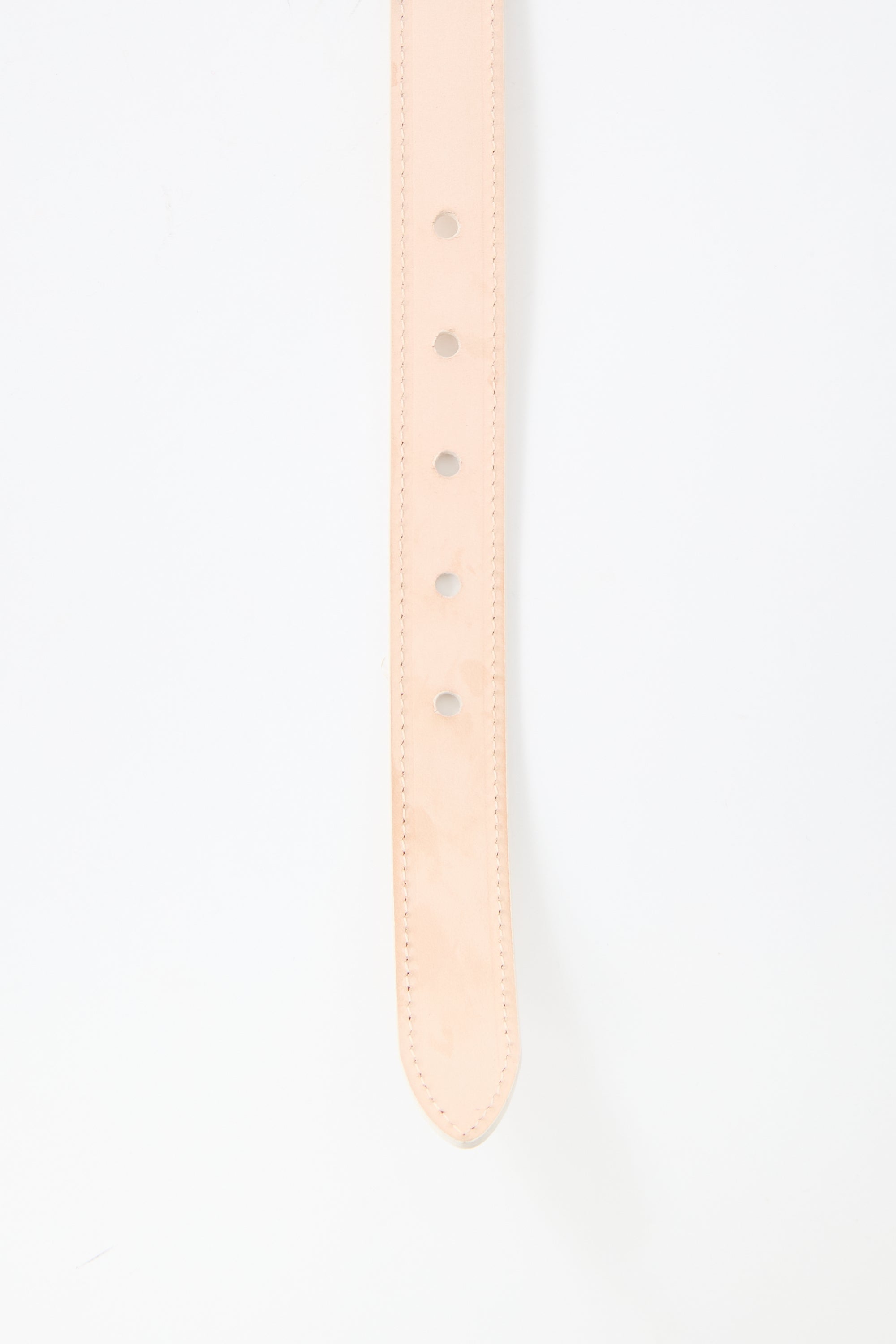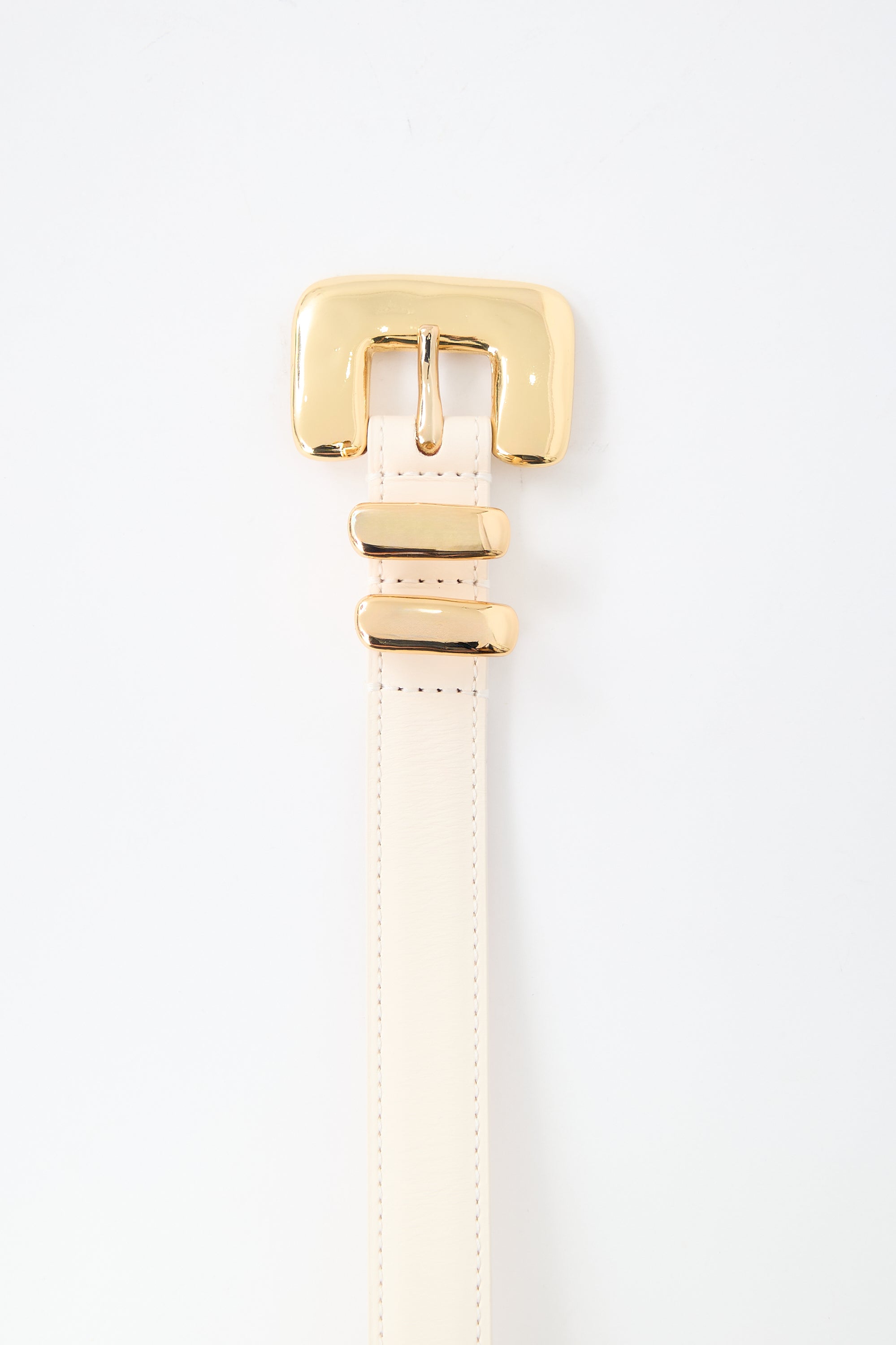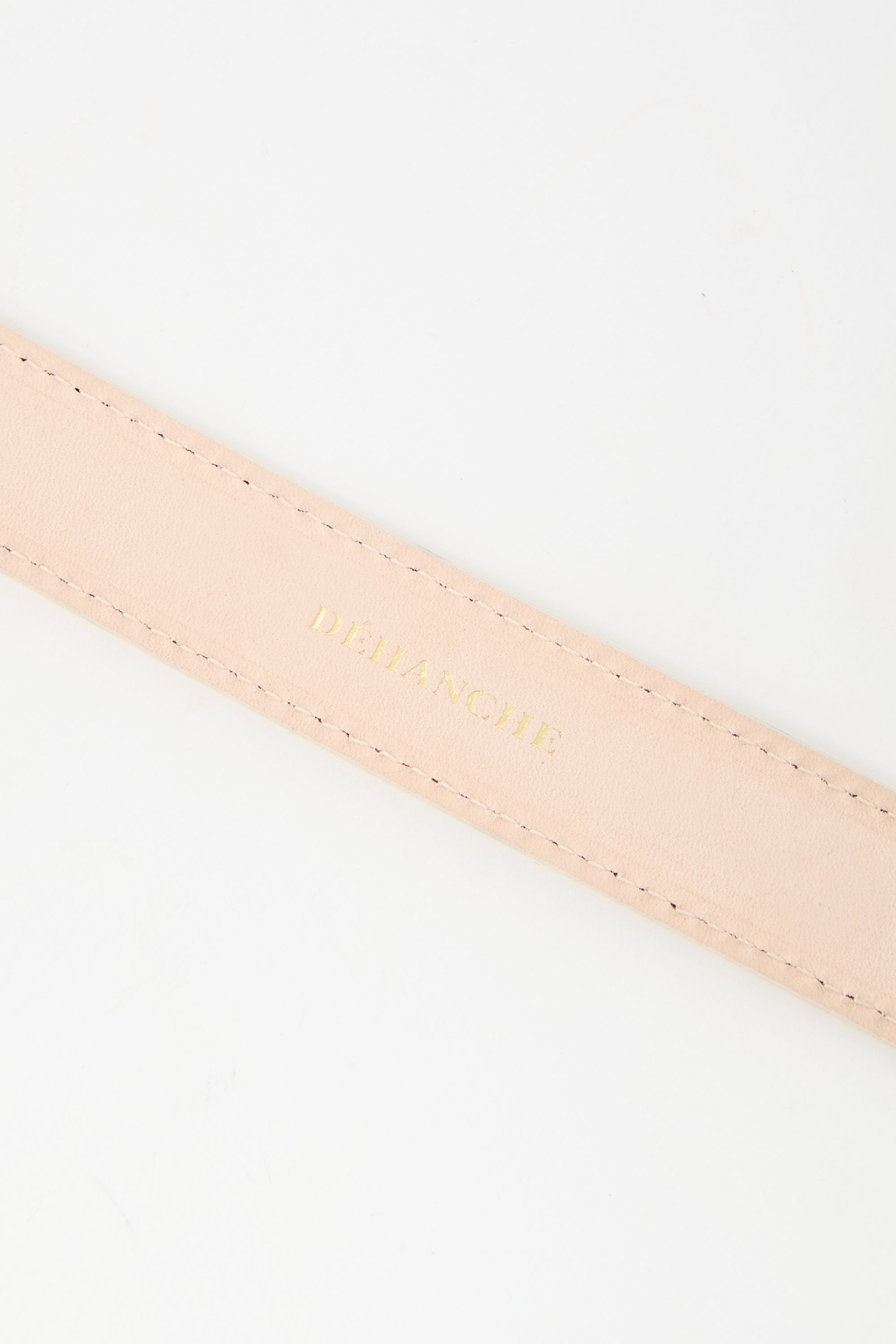 Pre-owned Dehanche cream leather Tetra belt featuring gold plated hardware, hand-hammered buckle and passants, and five hole adjustment. Comes with original dust bag.