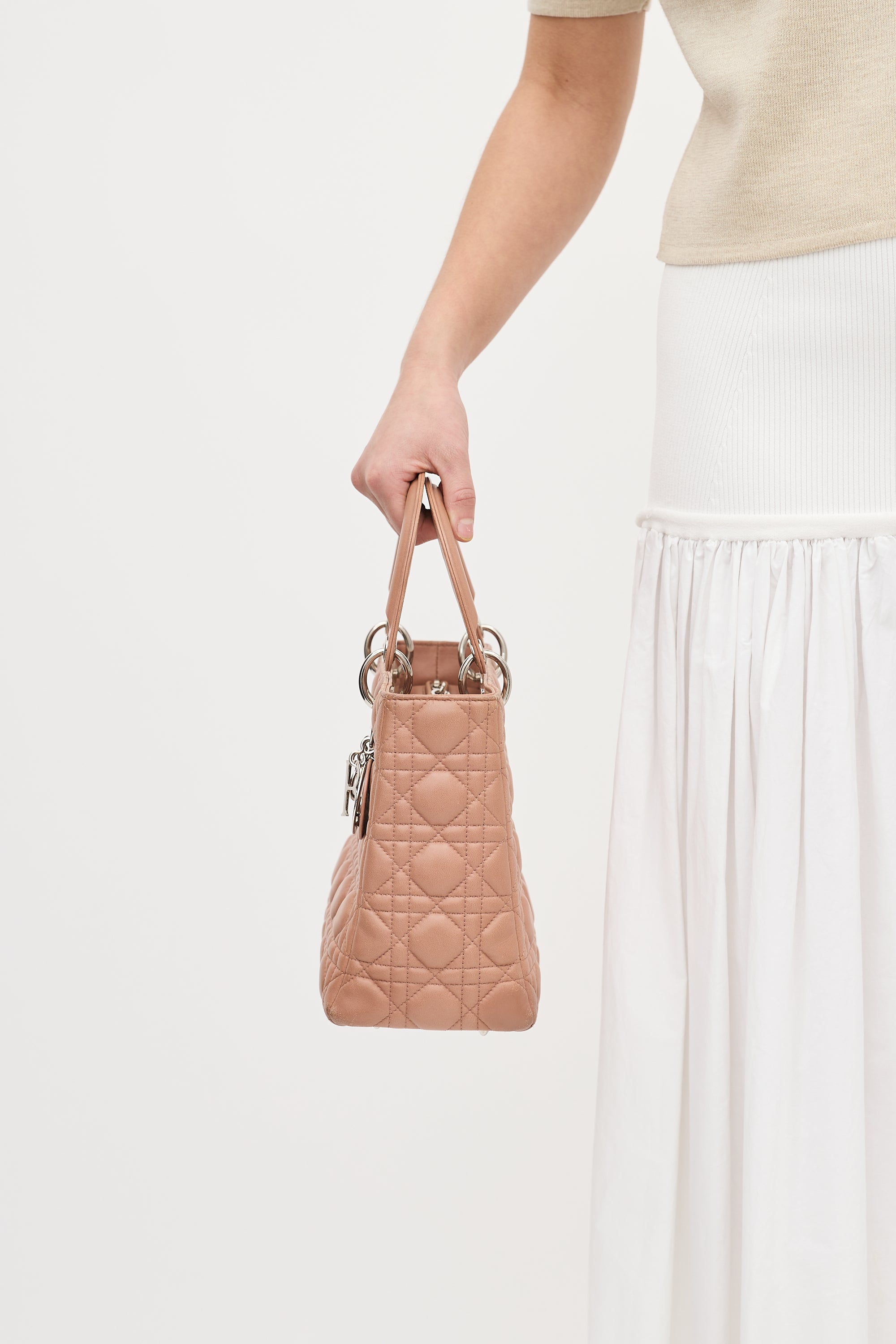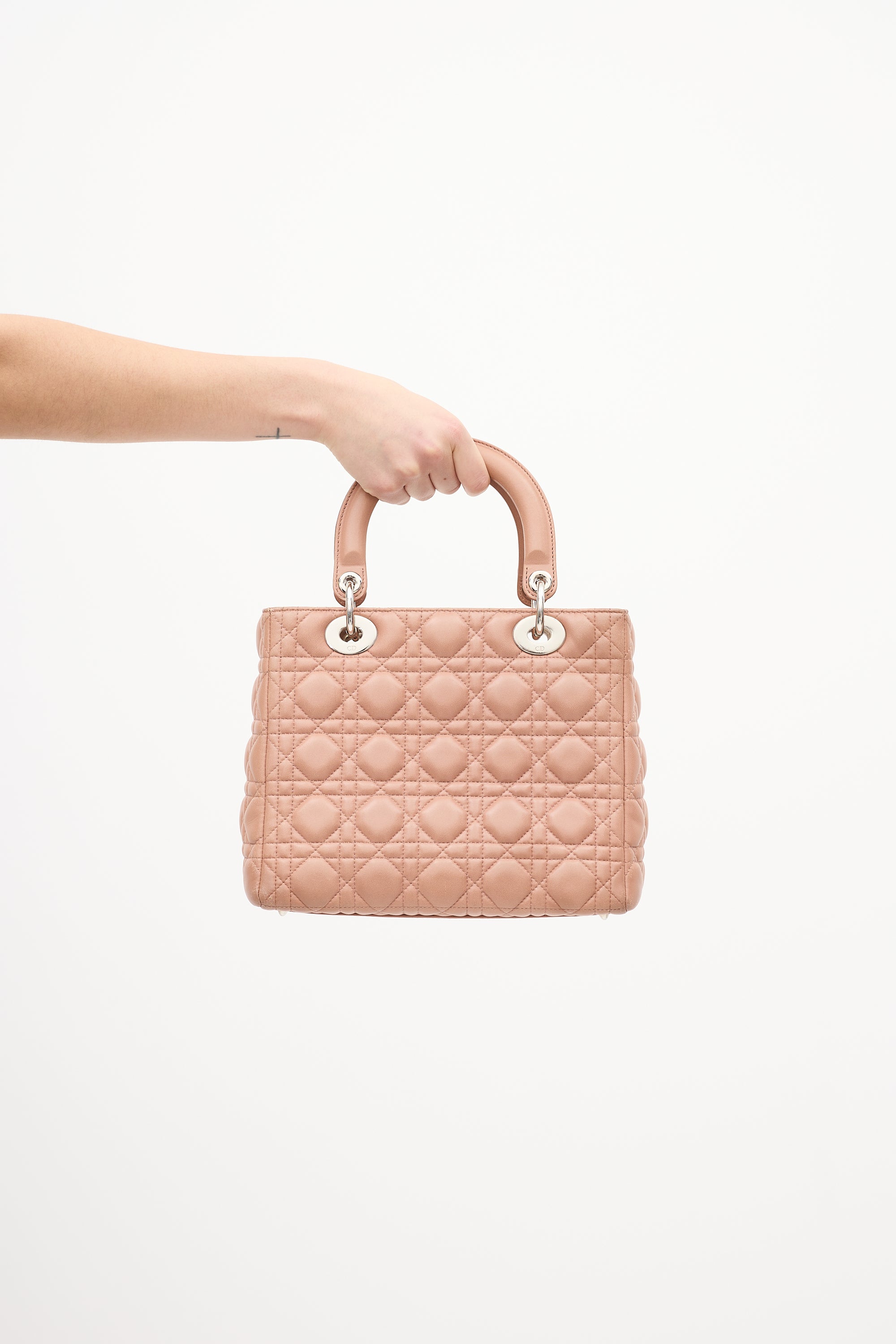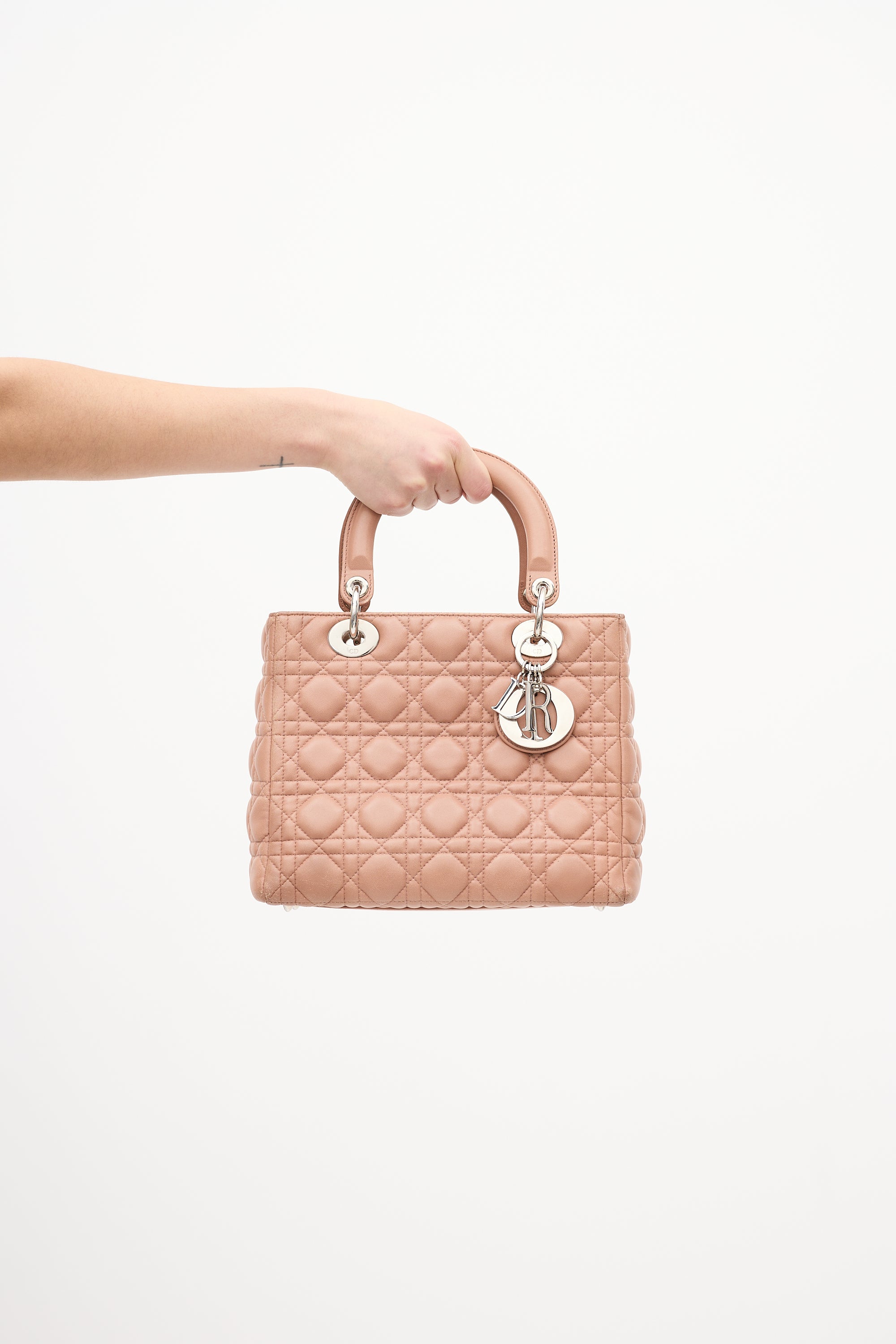 Pre-owned 2012 Dior pink medium Lady Dior bag featuring Cannage quilted leather, structured top handles, silver tone hardware, detachable shoulder strap, "Dior" charm at front, metal protective feet, zip closure at top, brown printed lining, and zip pocket inside. Comes with original dust bag.