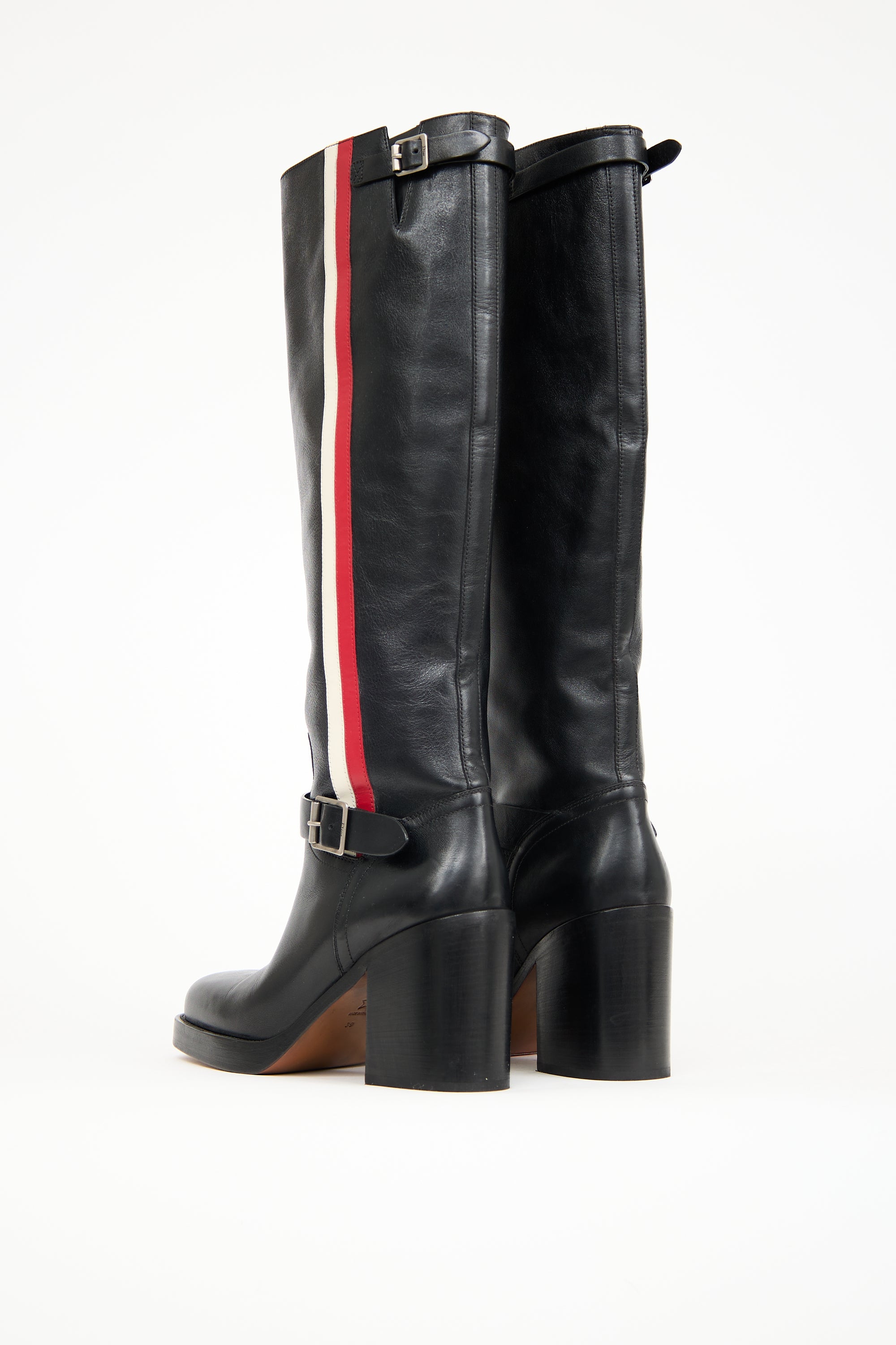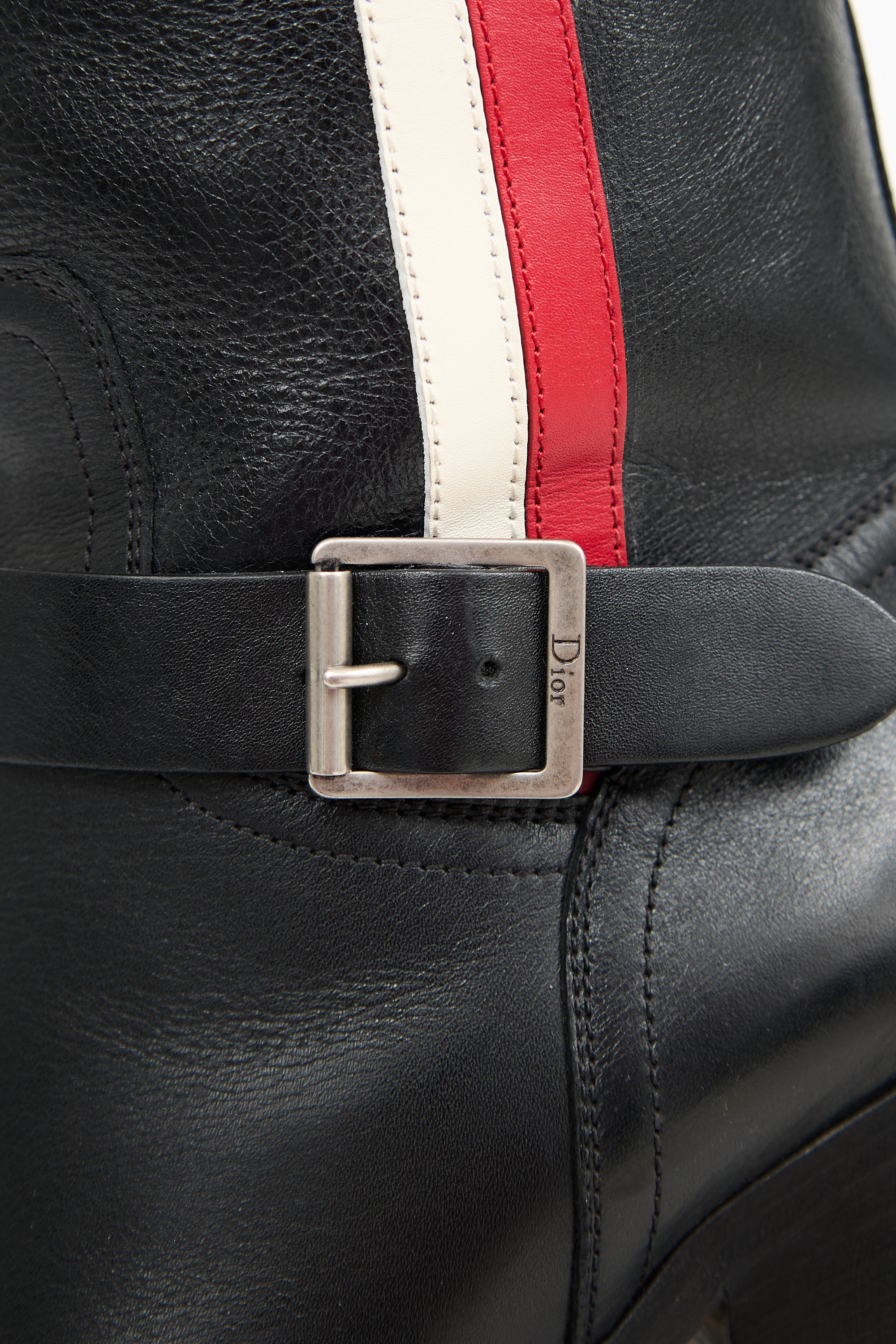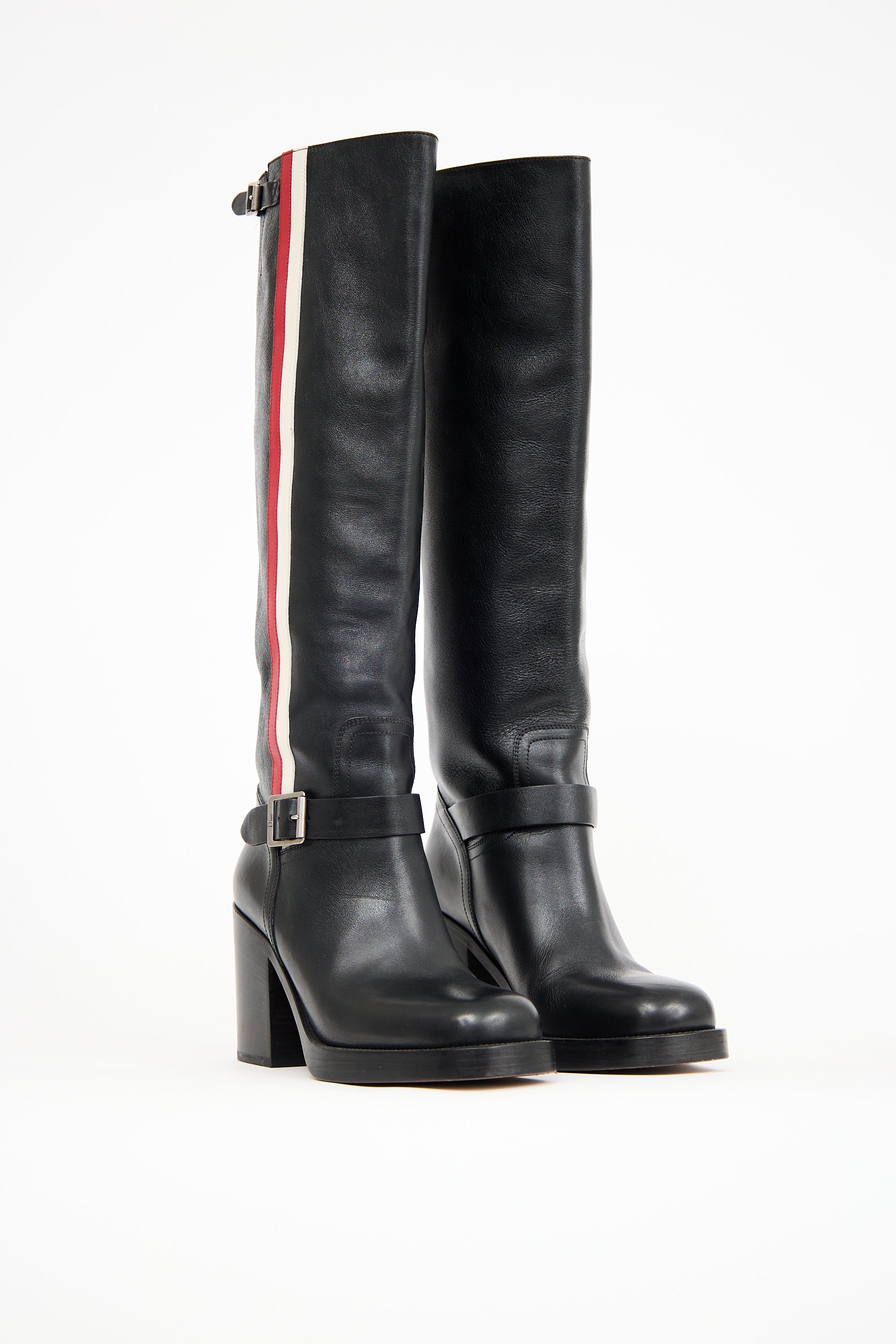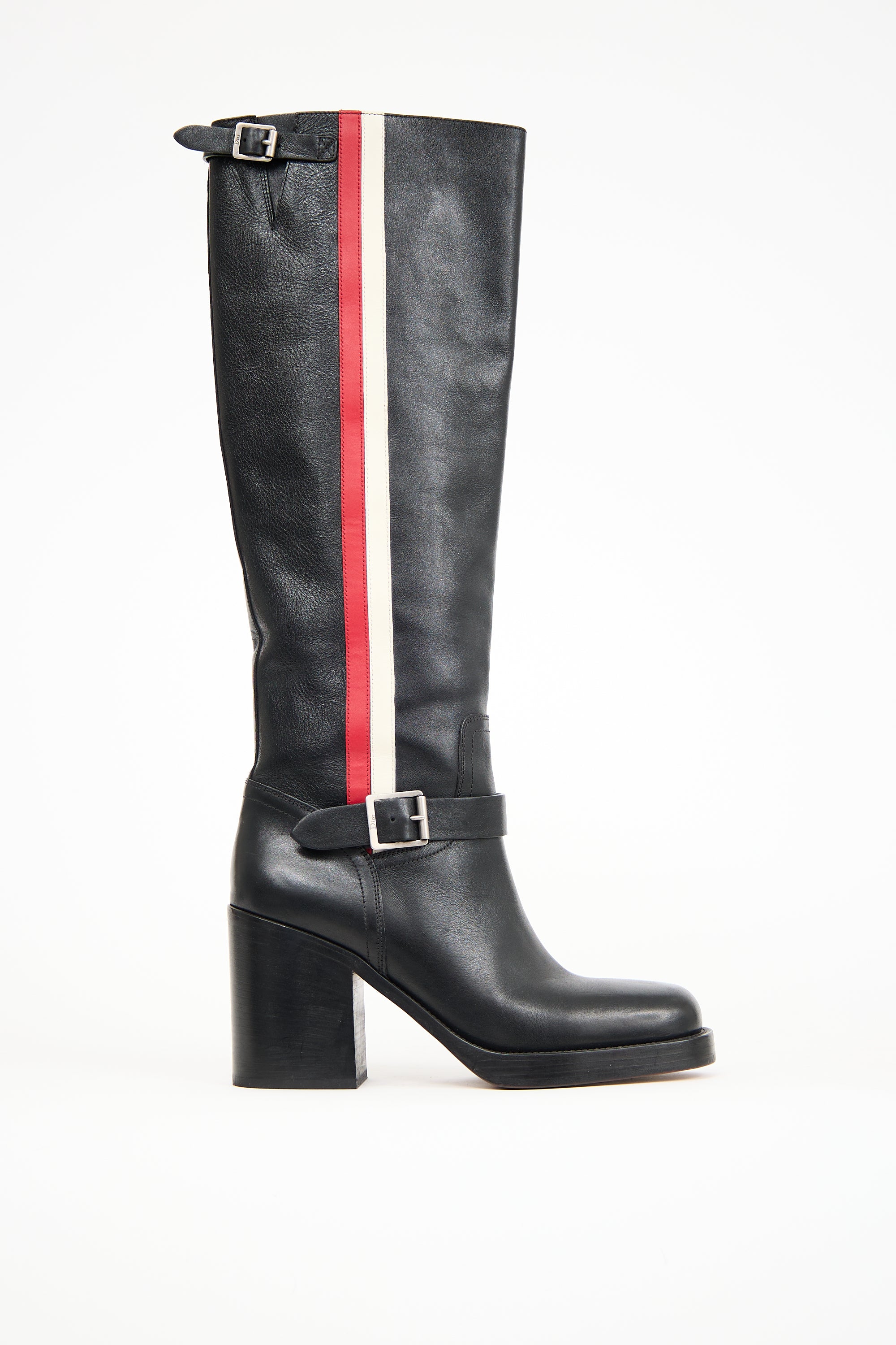 Pre-owned Dior black leather Diorider boots featuring a rounded toe, adjustable straps at instep and upper with silver tone debossed logo buckle, white and red stripe at outer shaft, J'Adior printed logo pull tabs at interior, and a stacked heel.