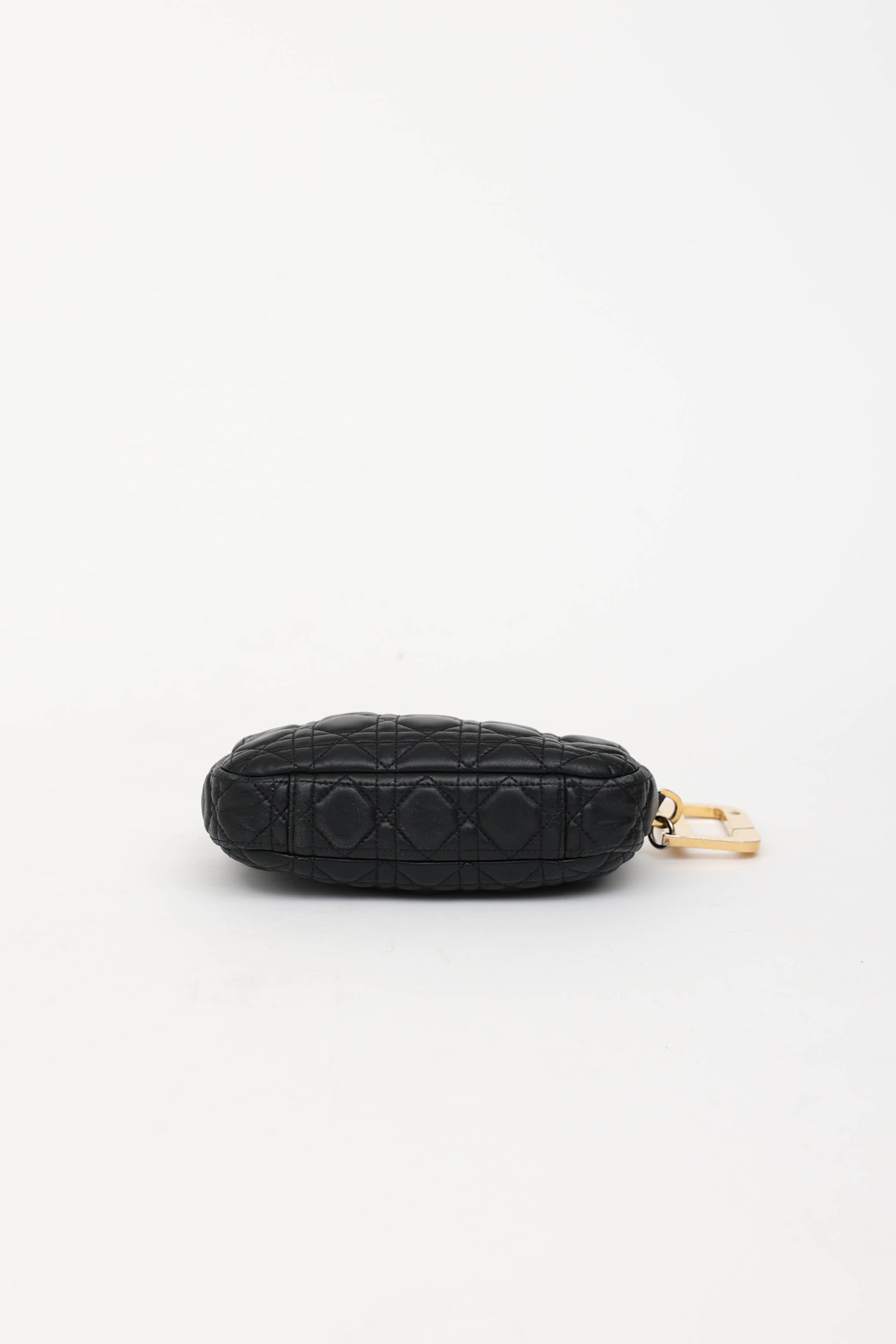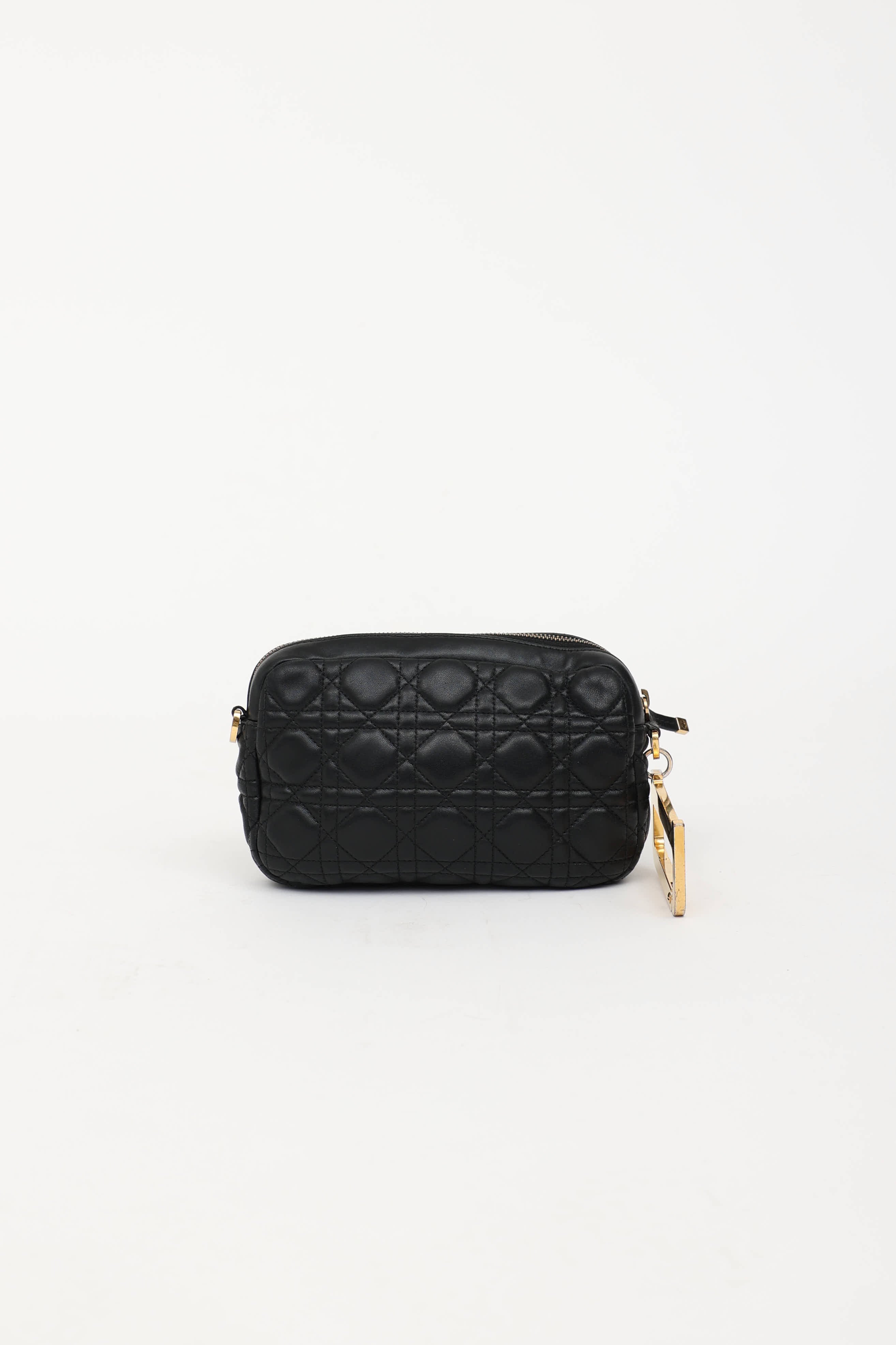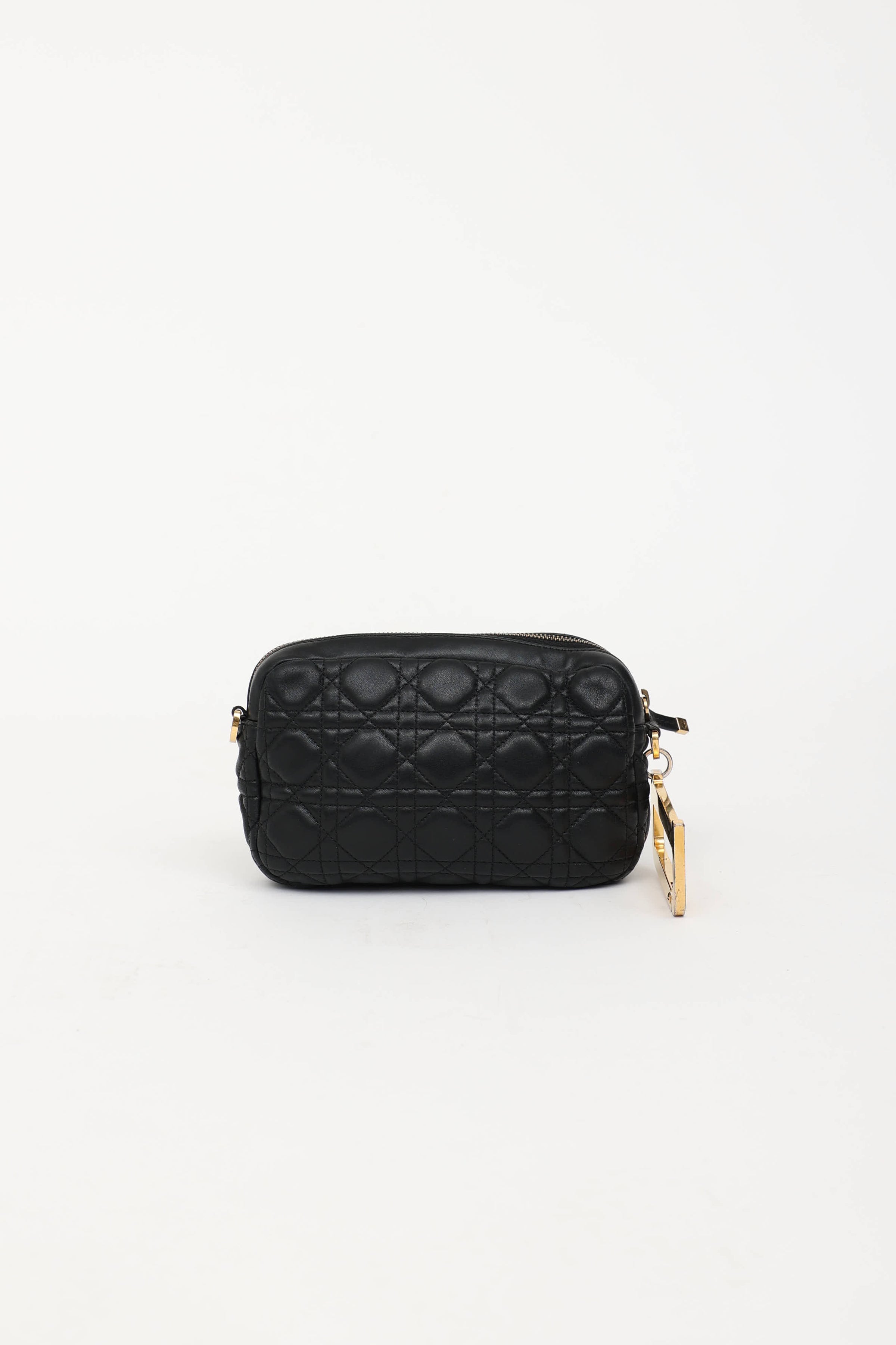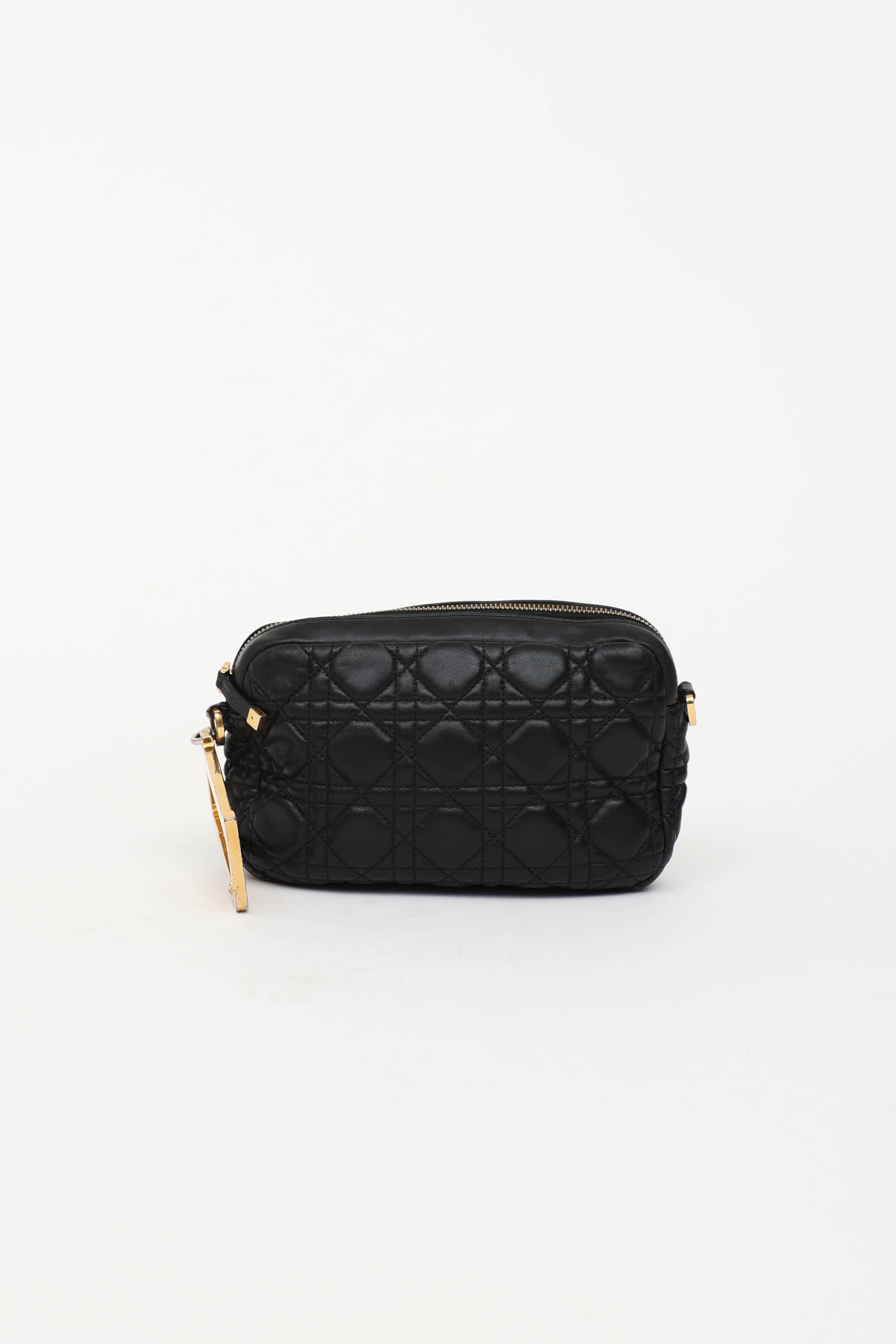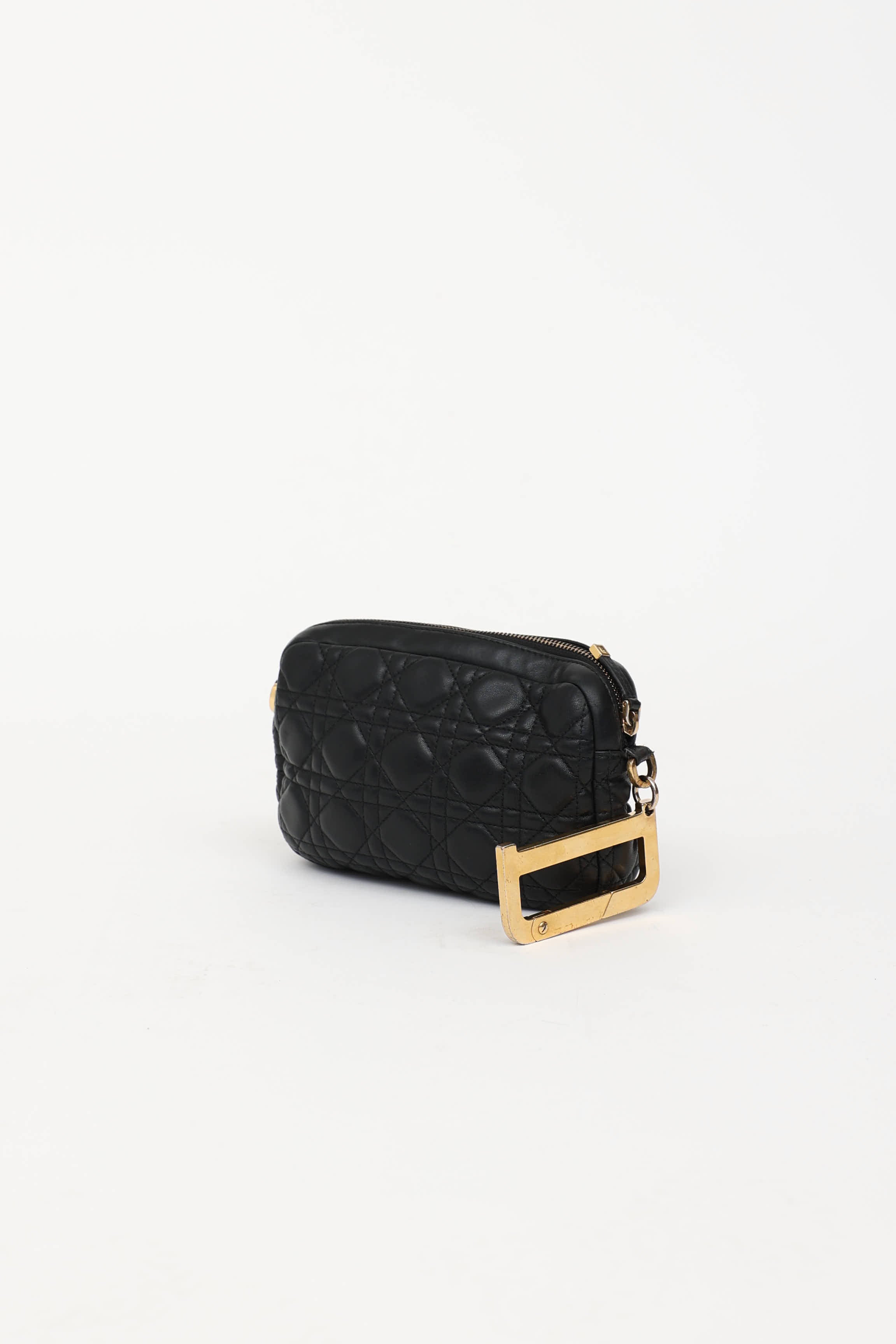 Pre-owned Dior black Diorquake clutch featuring Cannage quilted leather, gold tone "D" with clasp, top zip closure, one main compartment, and one slip pocket. Includes original dust bag.
