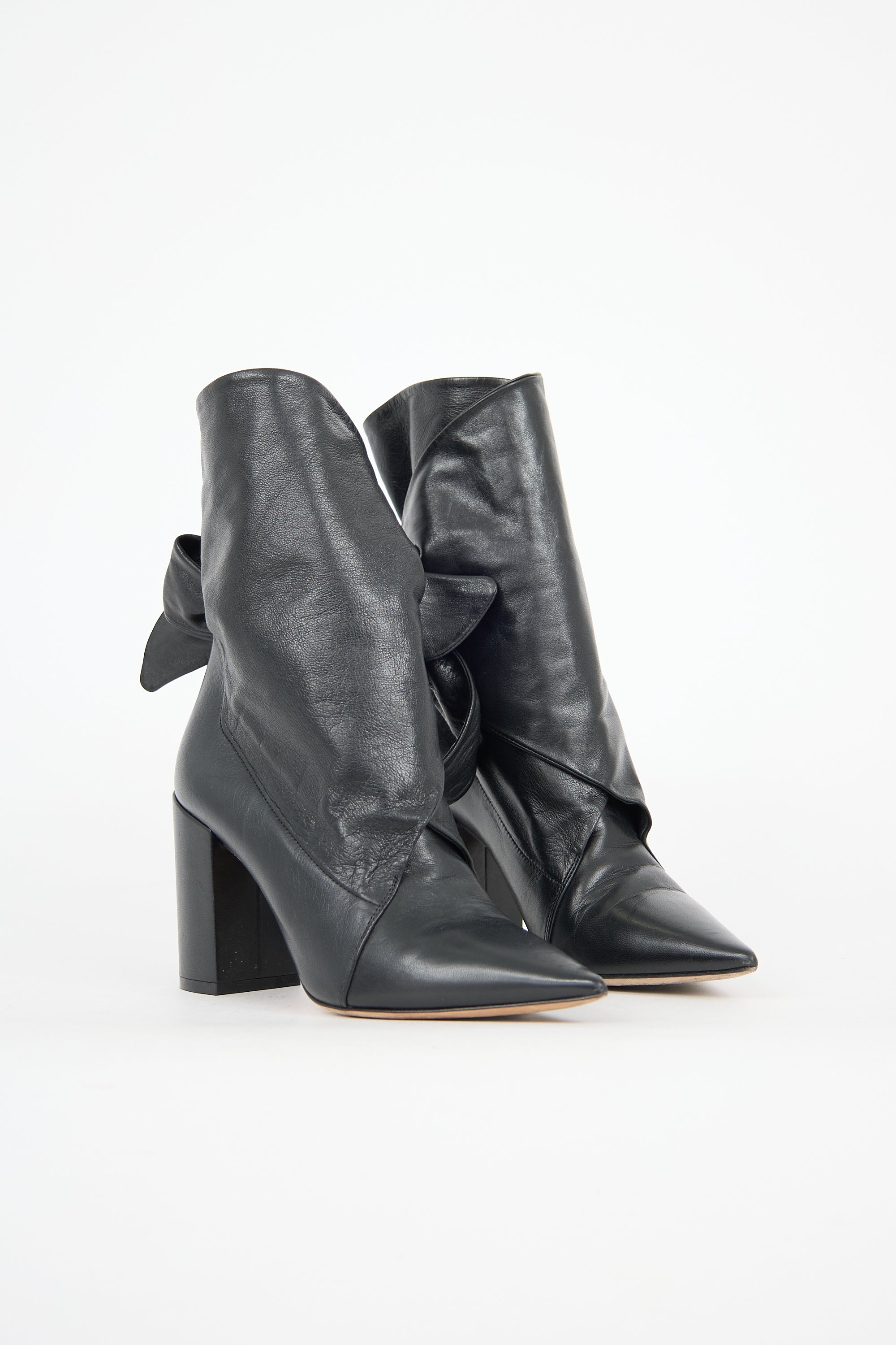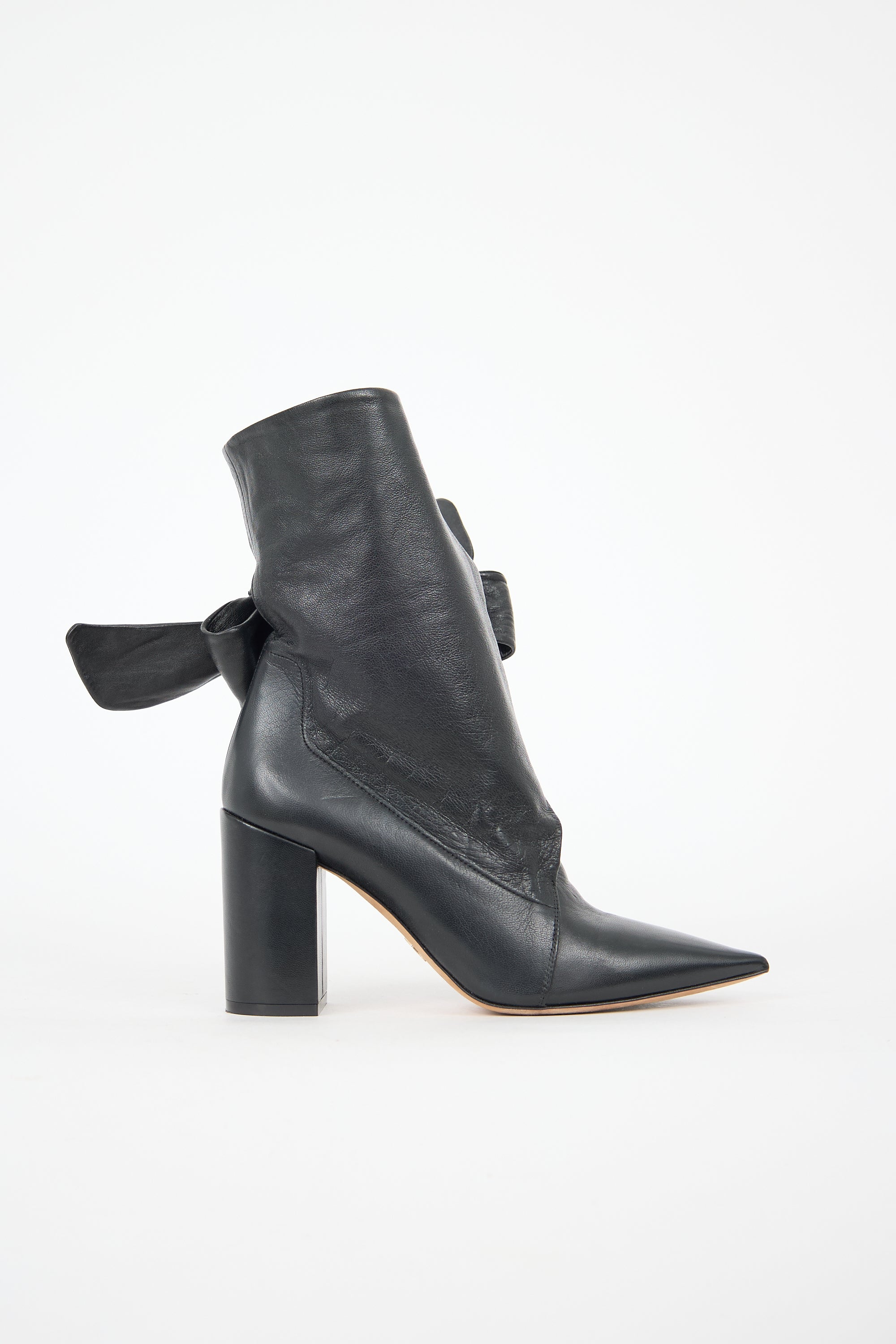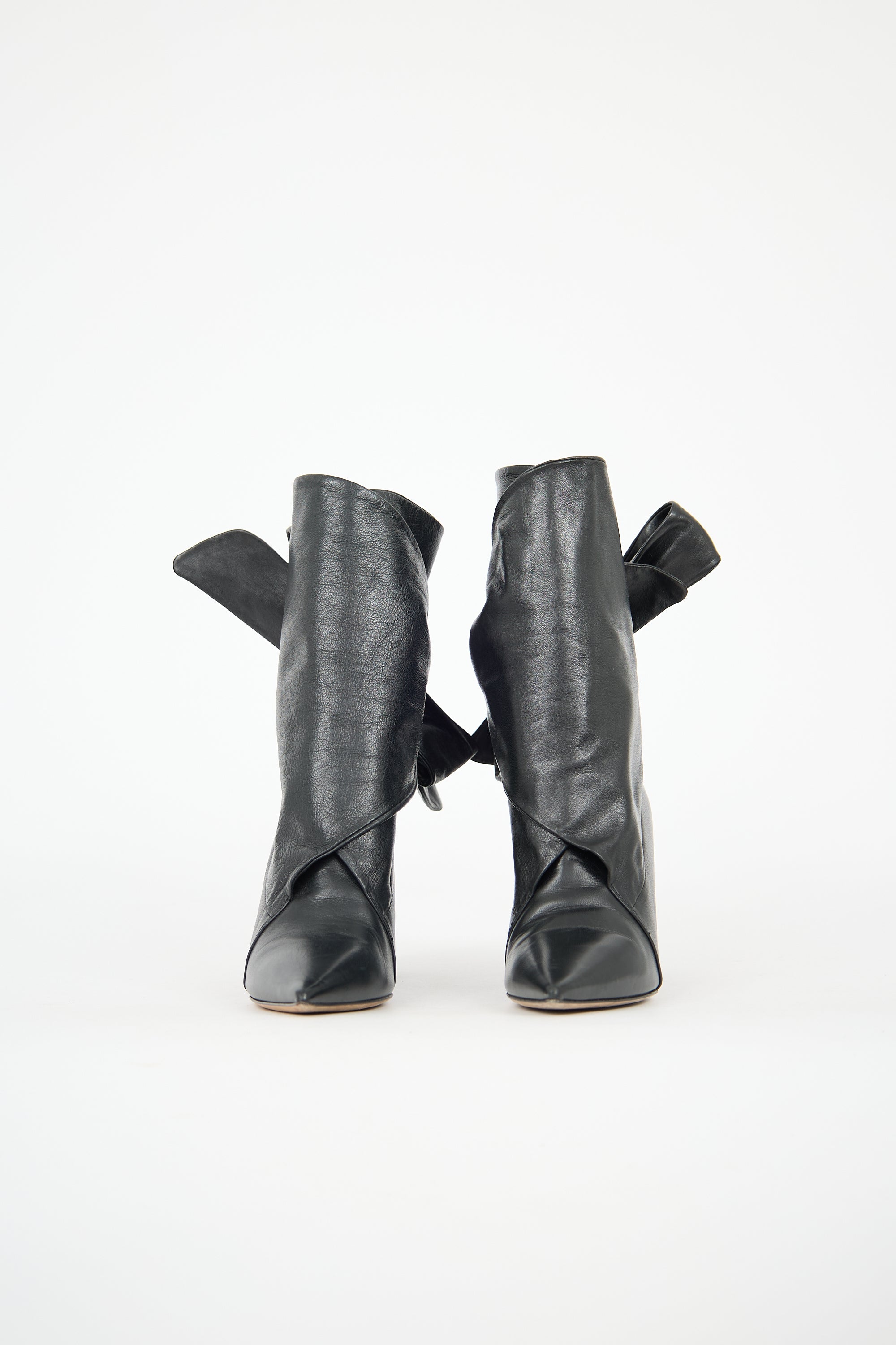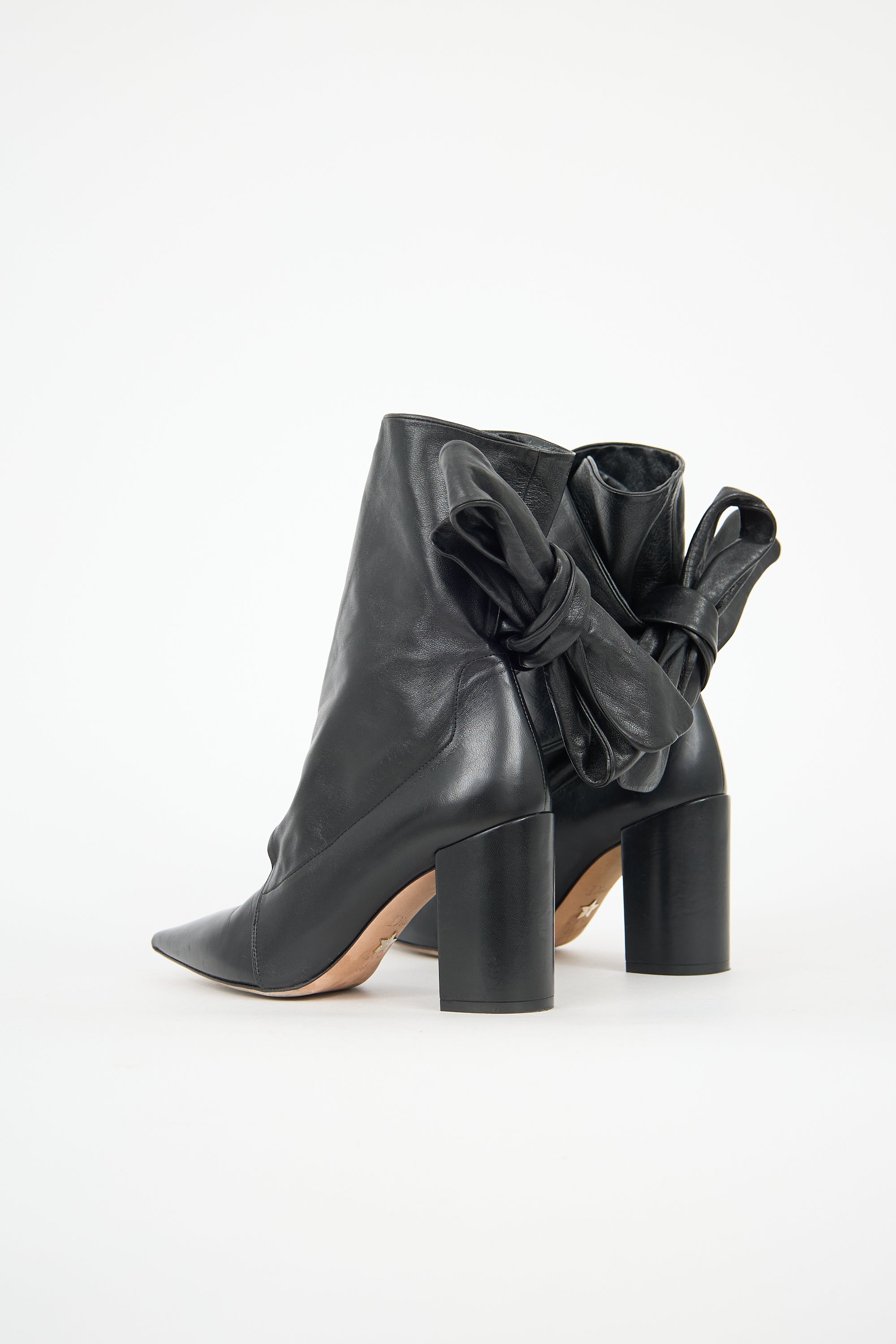 Pre-owned Christian Dior black leather Huggy boots featuring a pointed toe, wrap front with tie closure, and covered block heel. Comes with original dust bag.