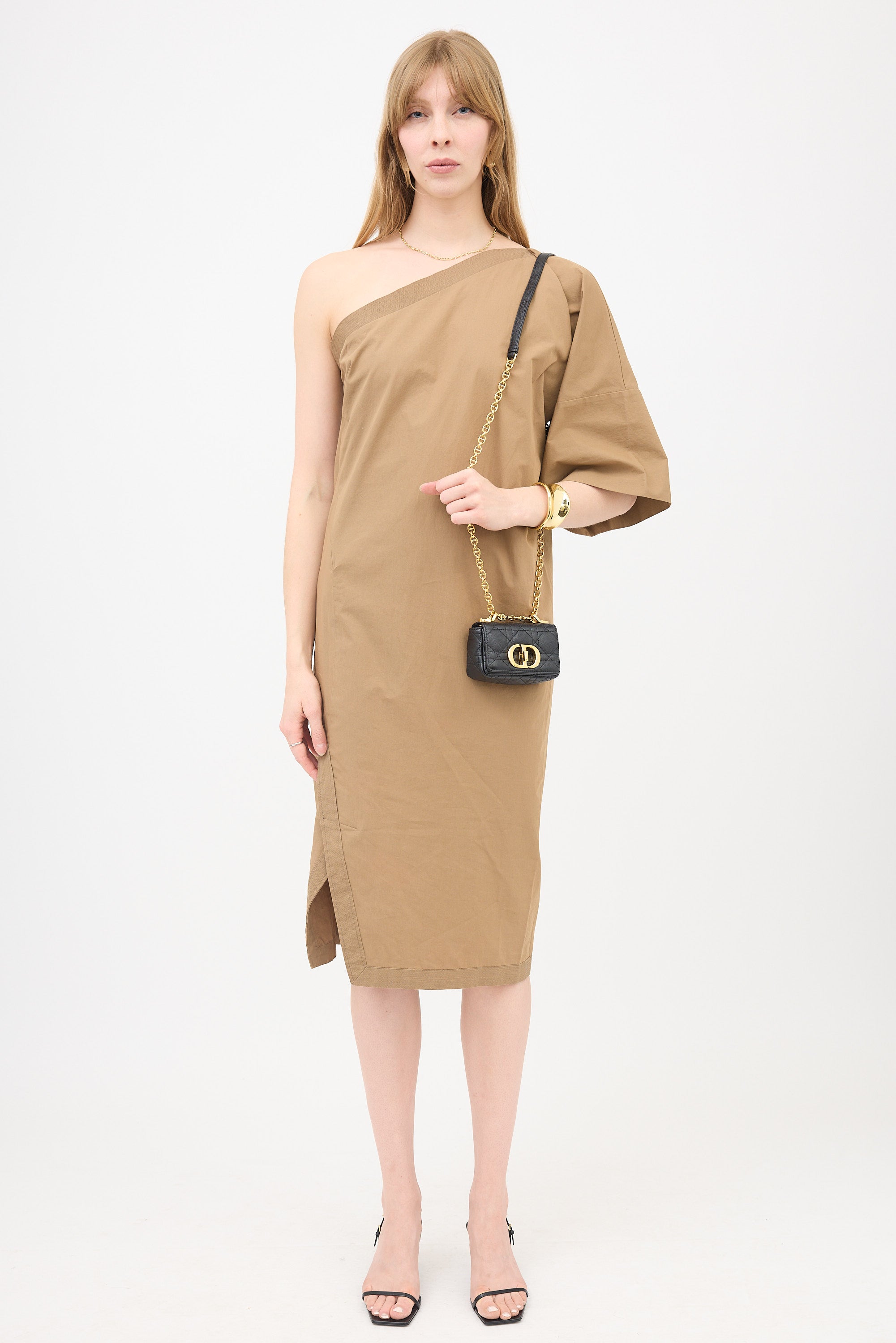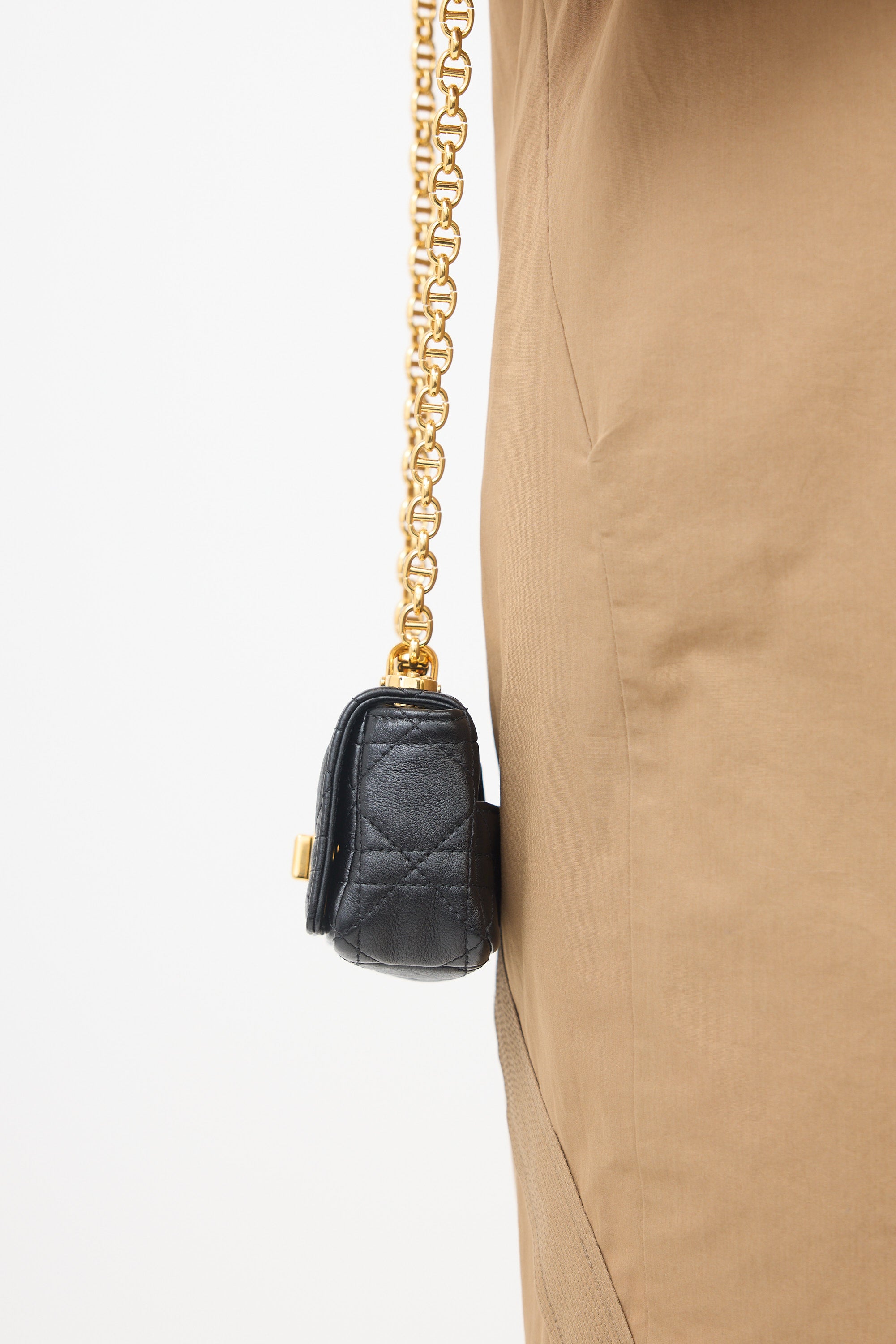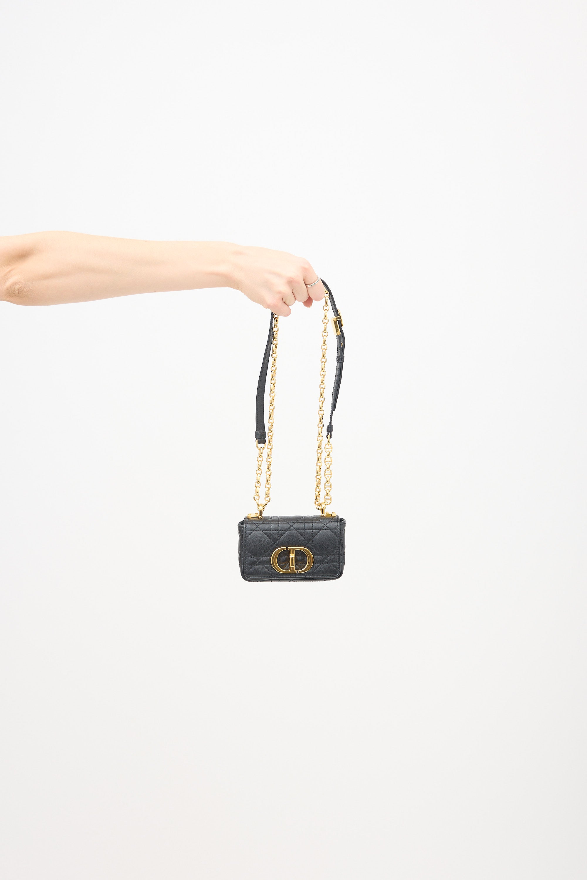 Pre-owned Christian Dior black leather Micro Caro bag featuring a Cannage quilted body, gold tone hardware, adjustable shoulder strap, back slip pocket with embossed 30 Montaigne script, front flap with CD twist lock closure, and one main compartment. Comes with original dust bag.
