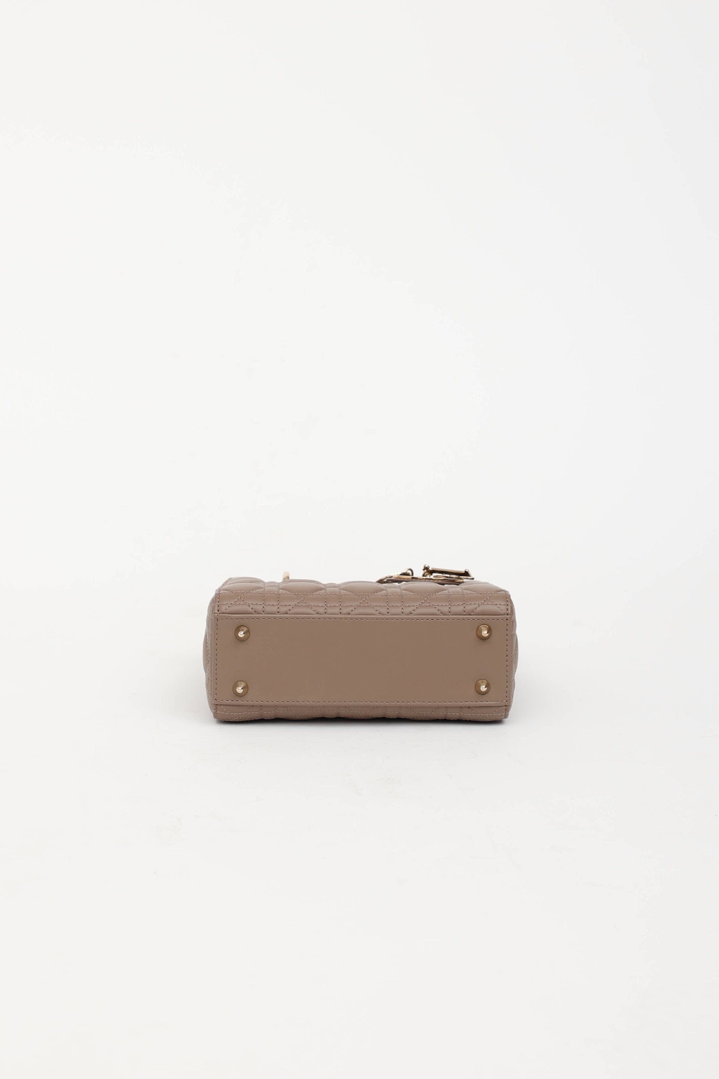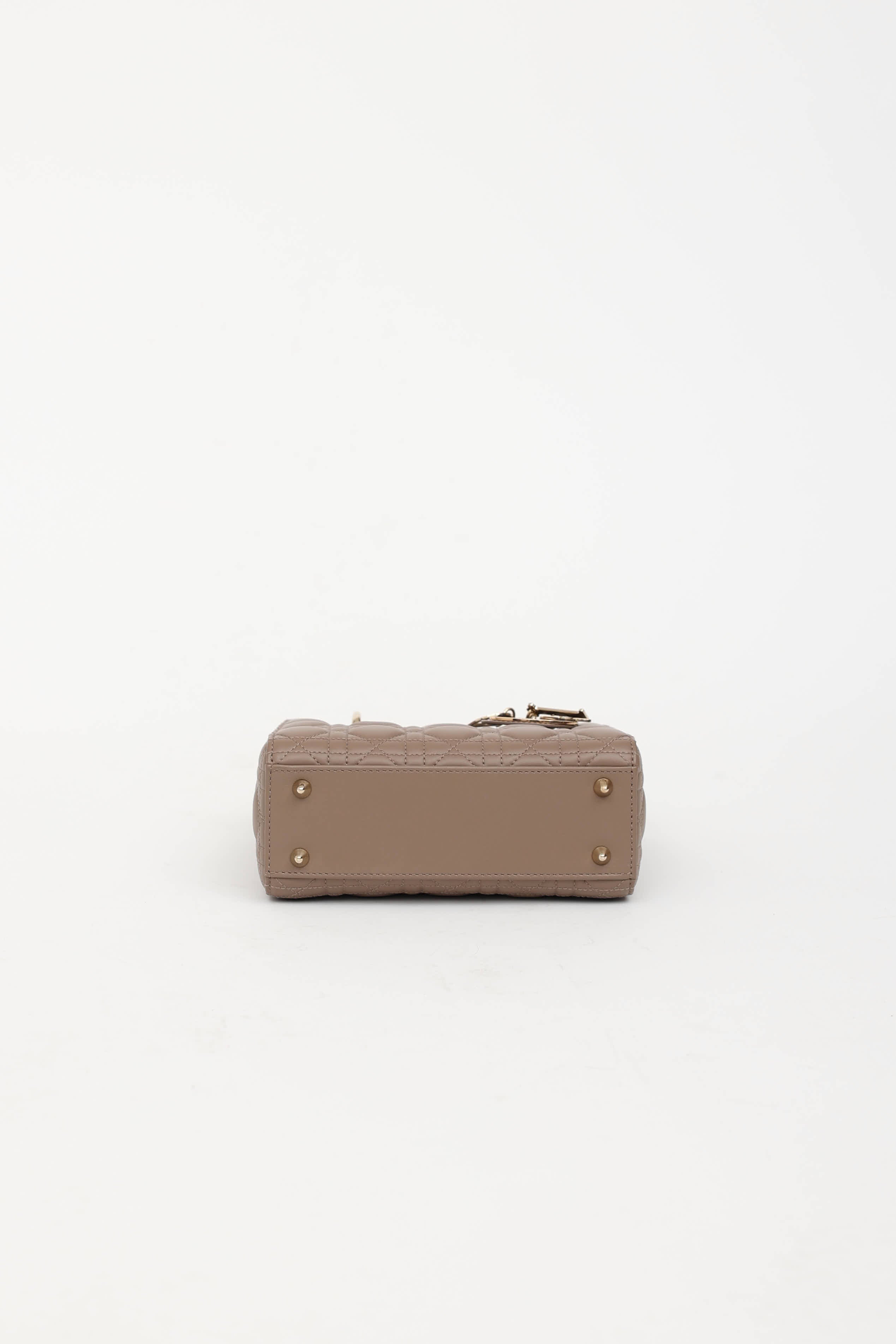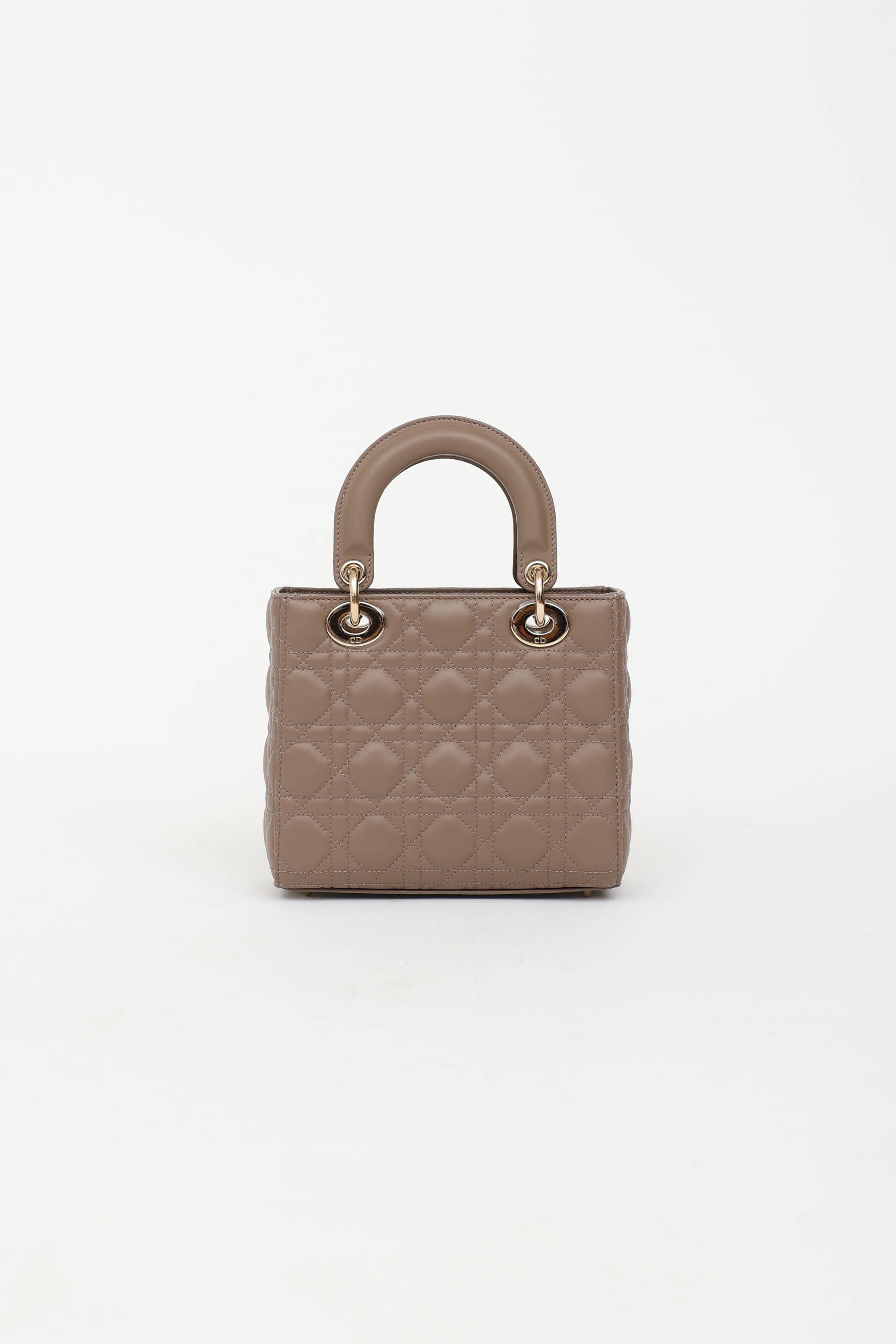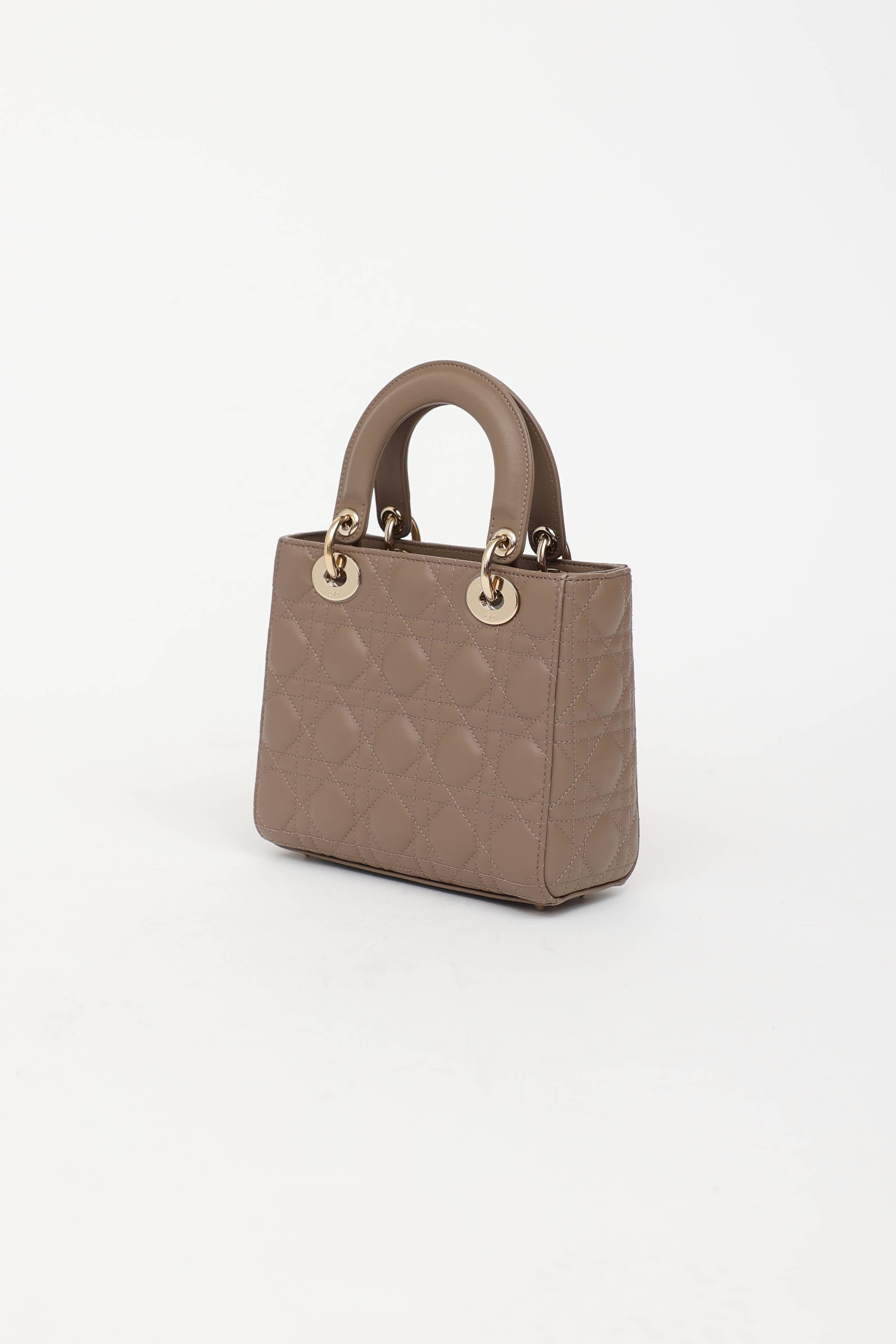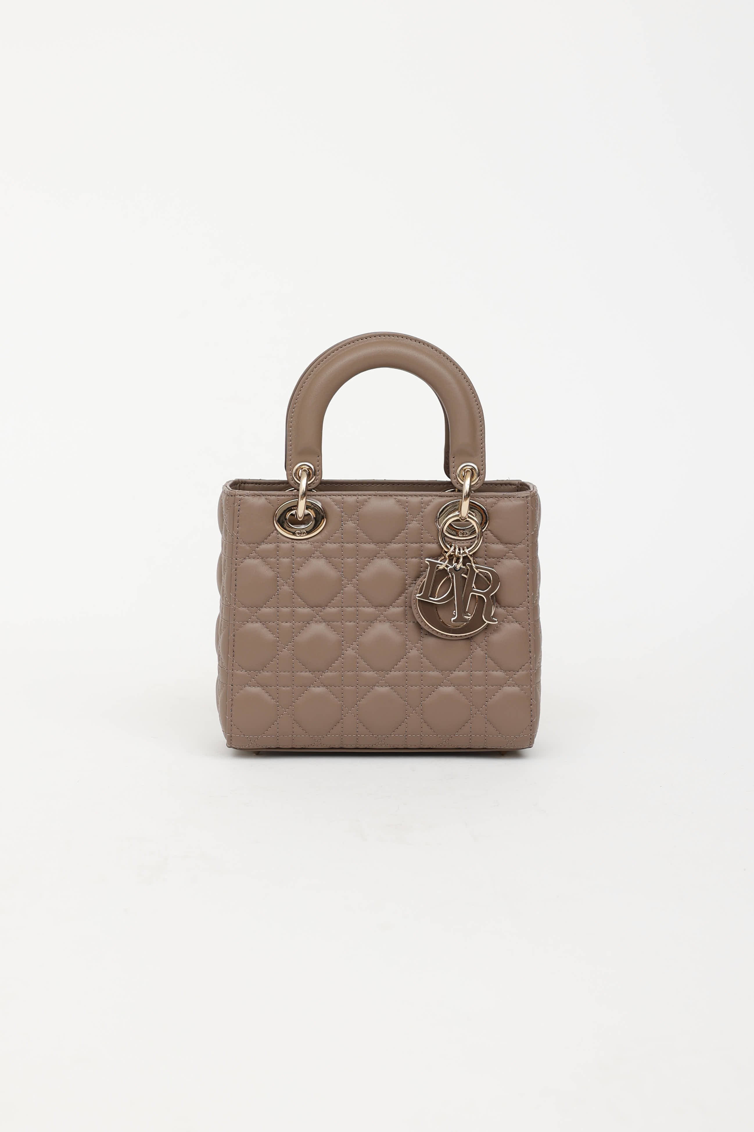 Pre-owned Dior warm taupe small Cannage quilted leather, structured top handles, gold tone hardware, detachable shoulder strap, "Dior" charm at front, metal protective feet, interior top flap, one main compartment with one slip pocket, and zip pocket inside.