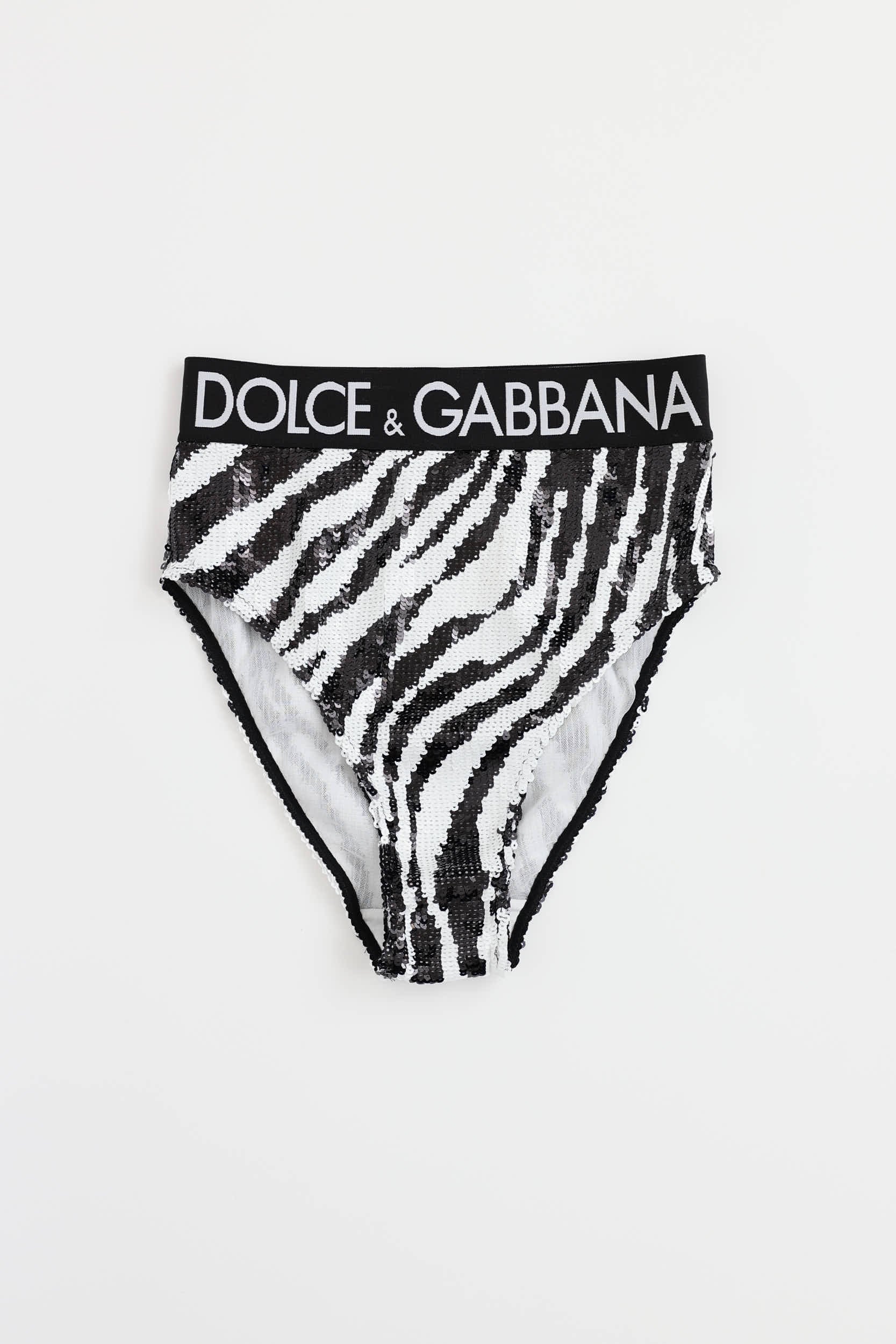 Pre-owned Dolce & Gabbana black and white swim briefs featuring elasticized logo waistband, sequin zebra pattern throughout, and mesh lined.