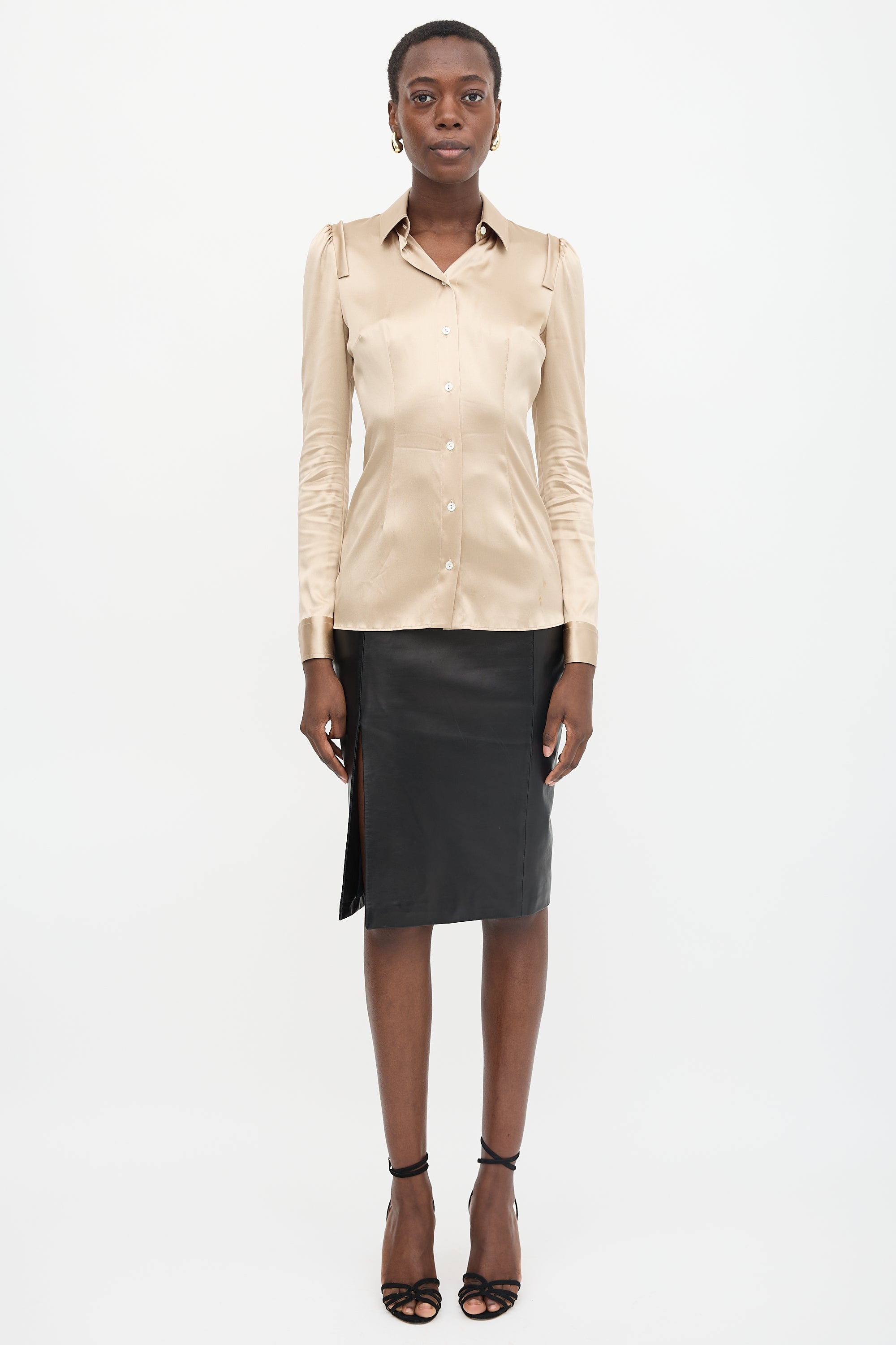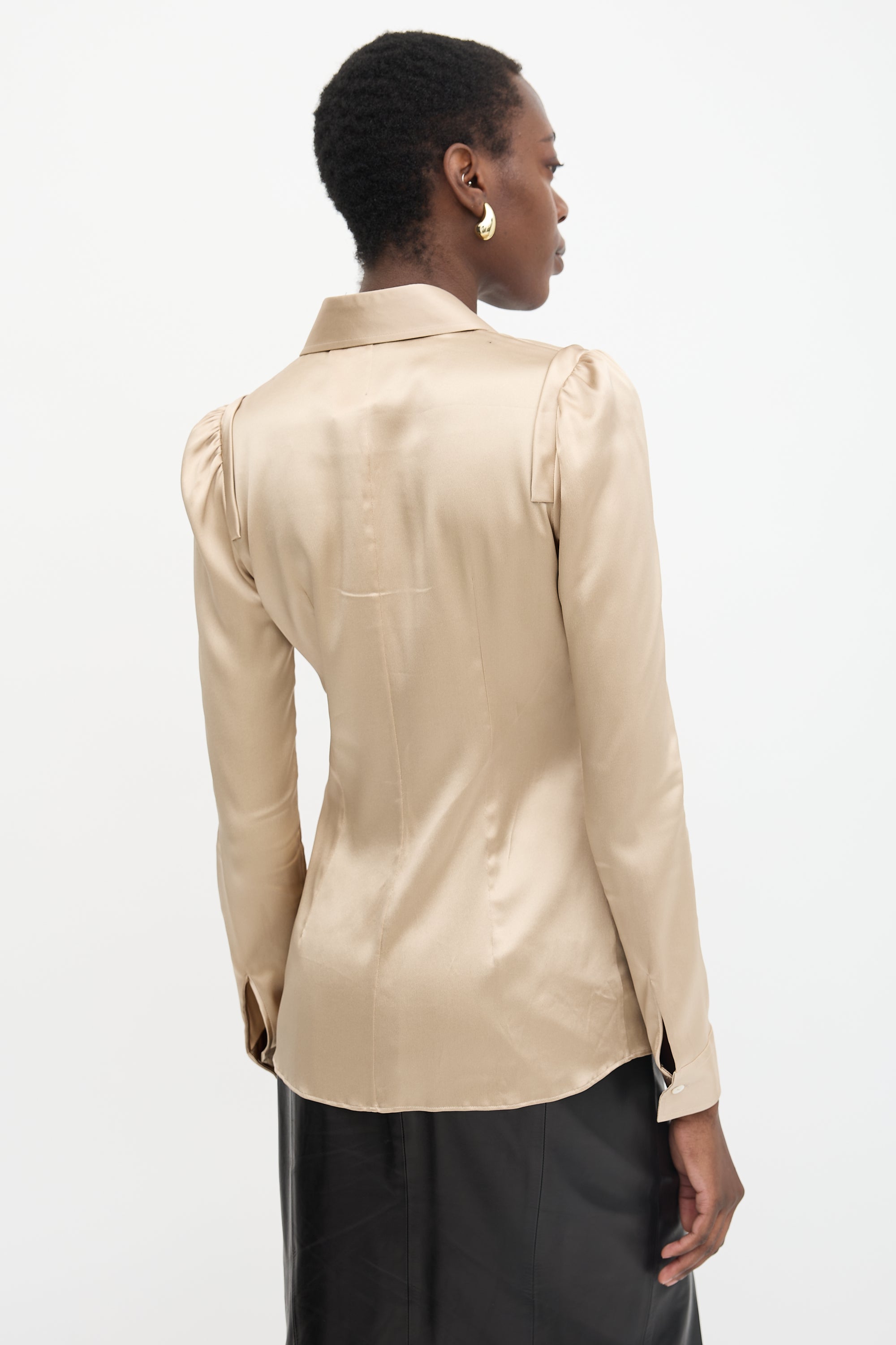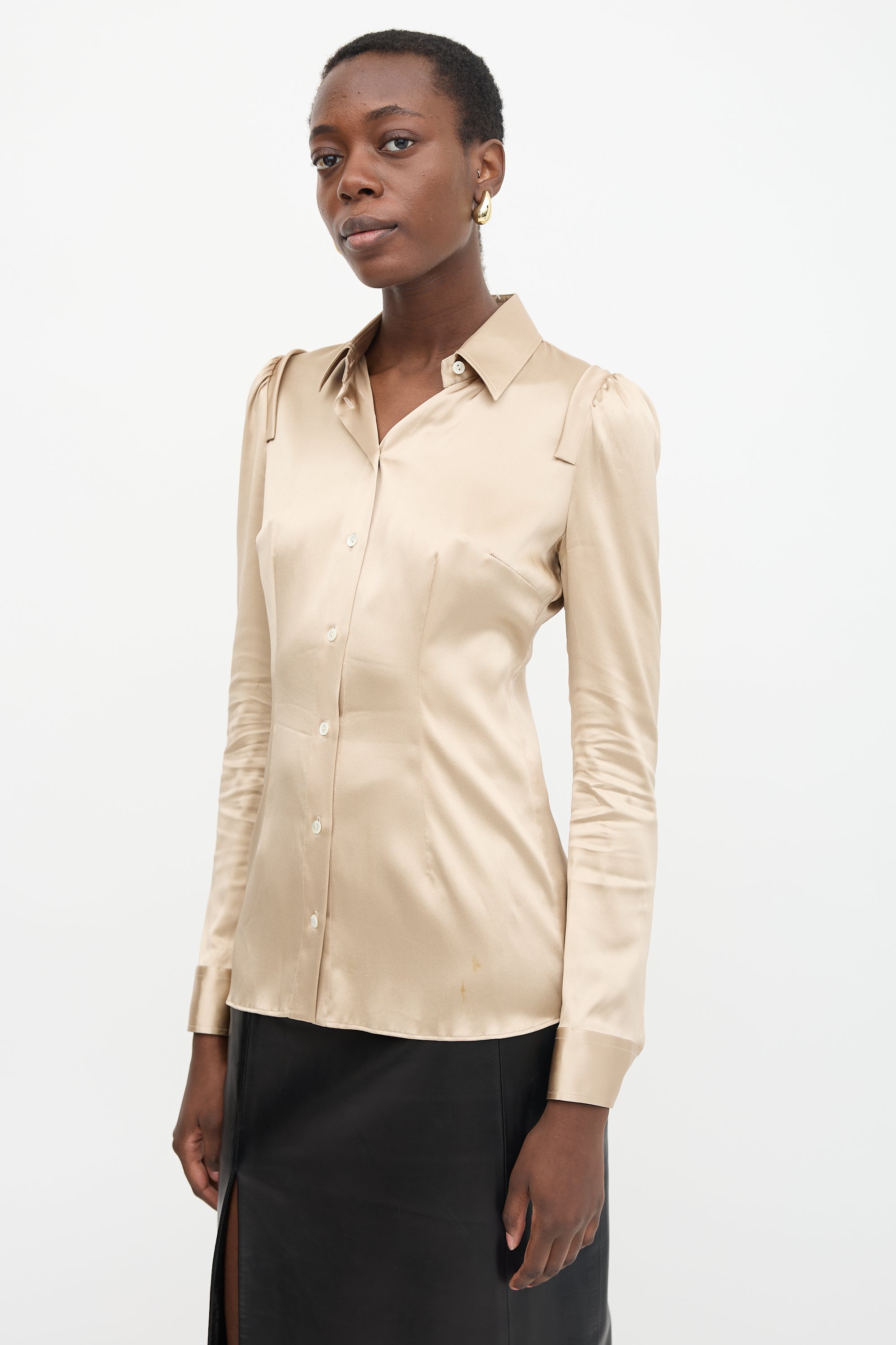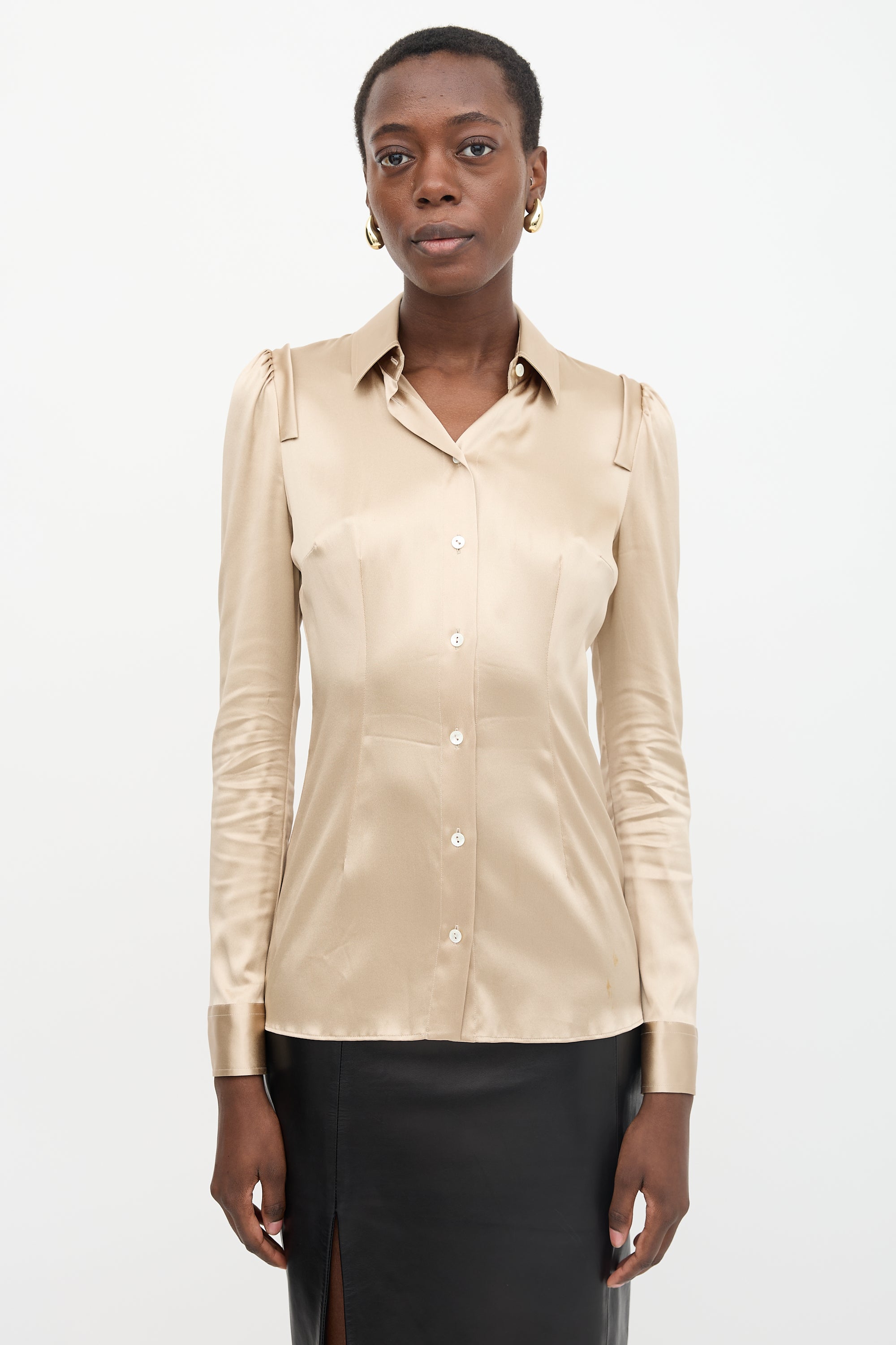 Pre-owned Dolce & Gabbana beige satin shirt featuring straight collar, button up front, gathered shoulders, and buttoned cuffs.
