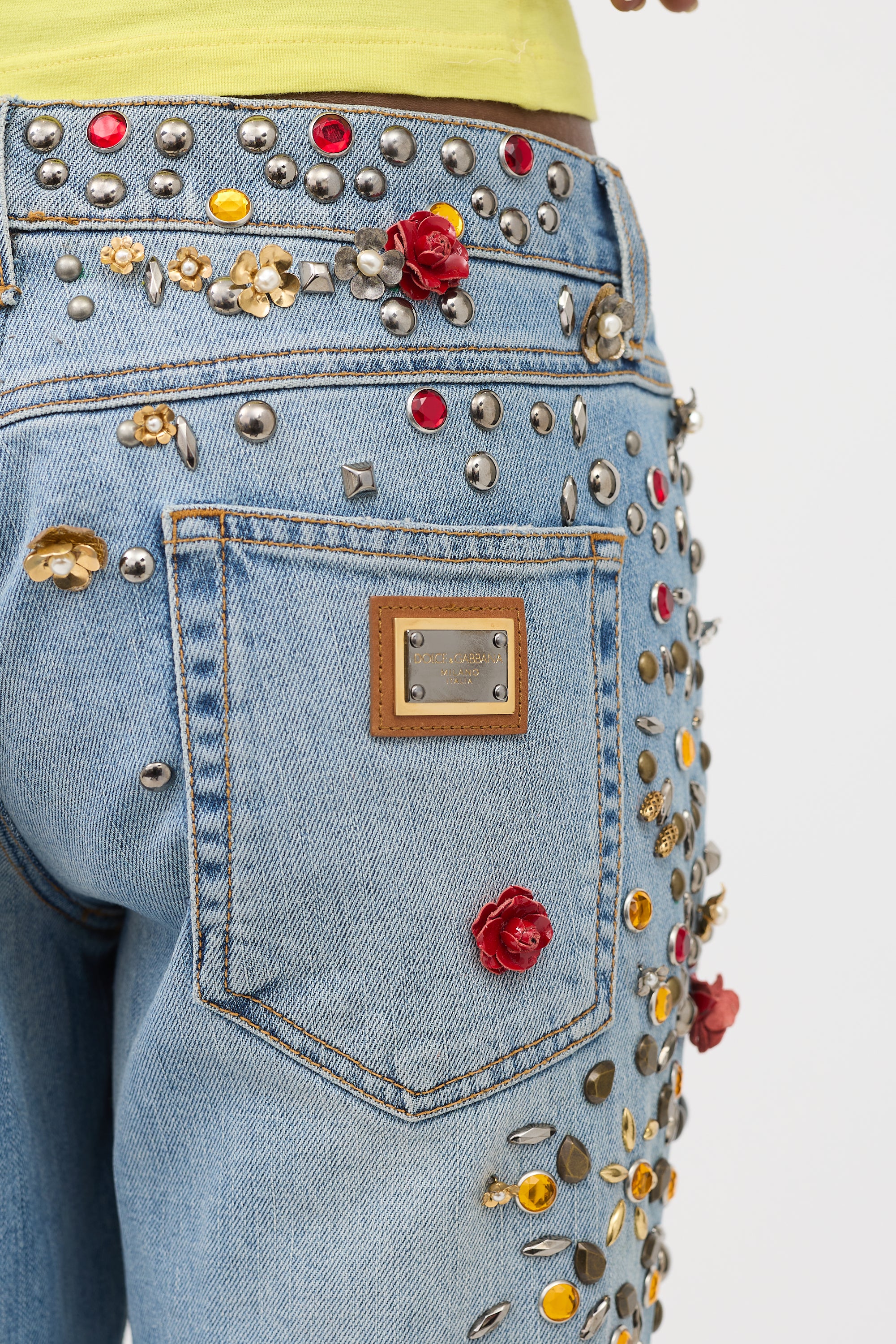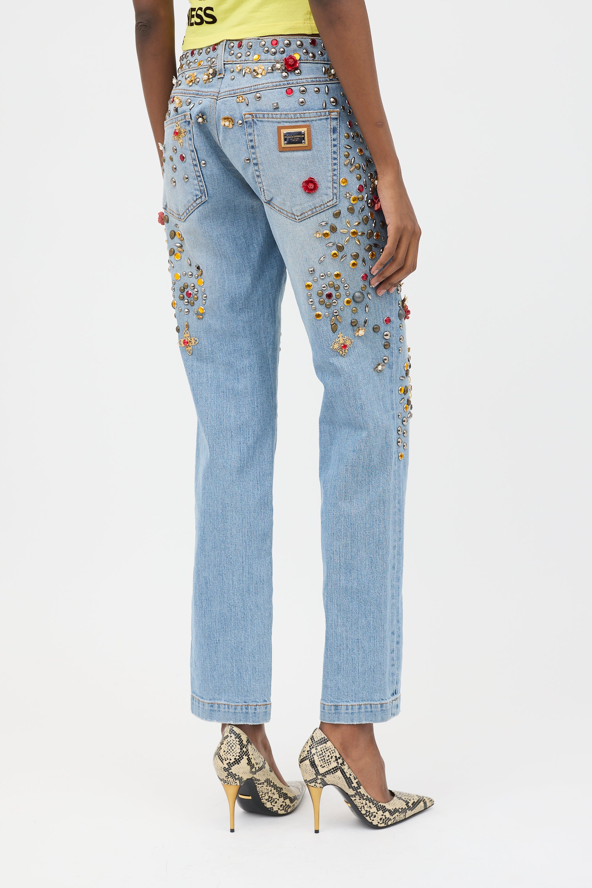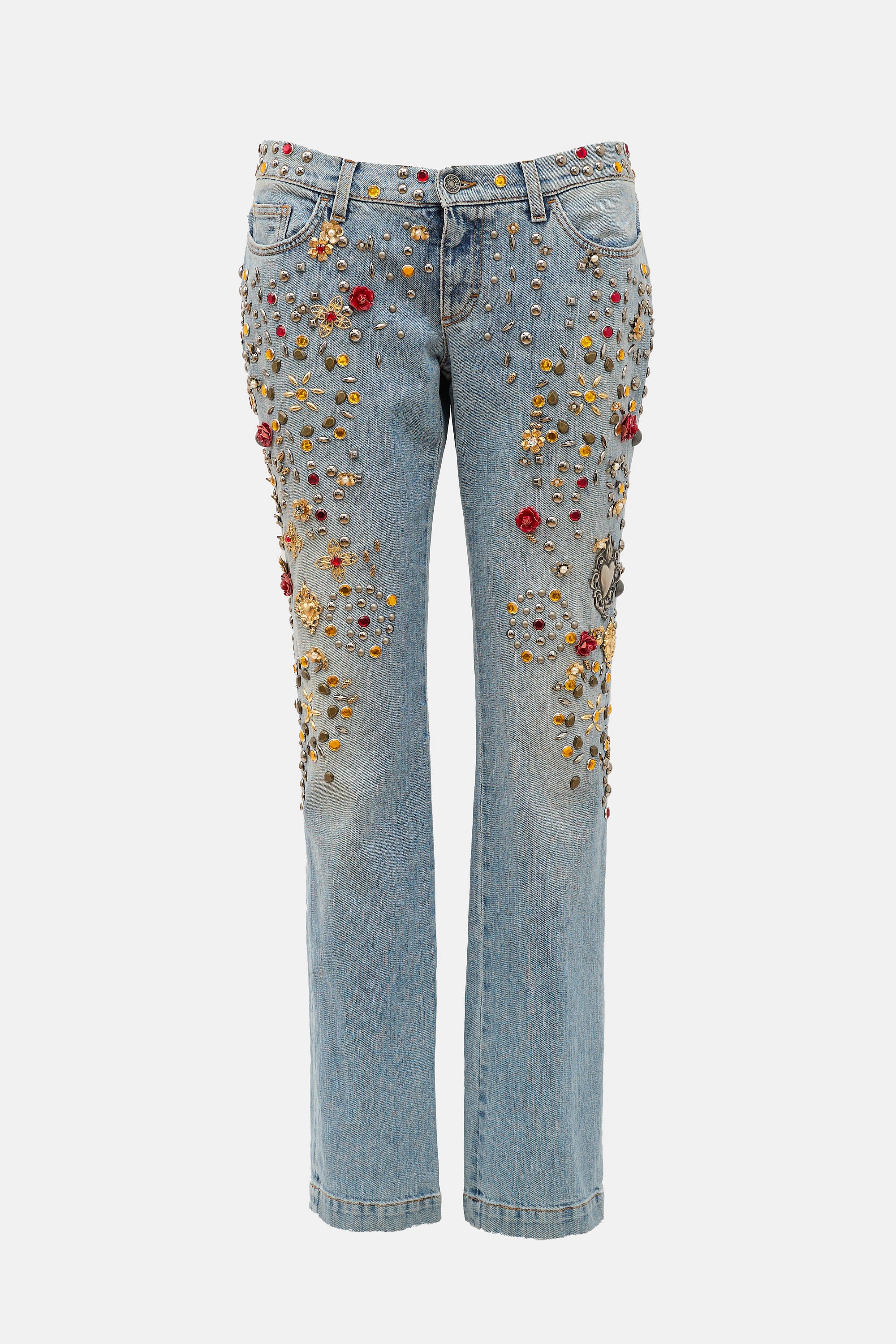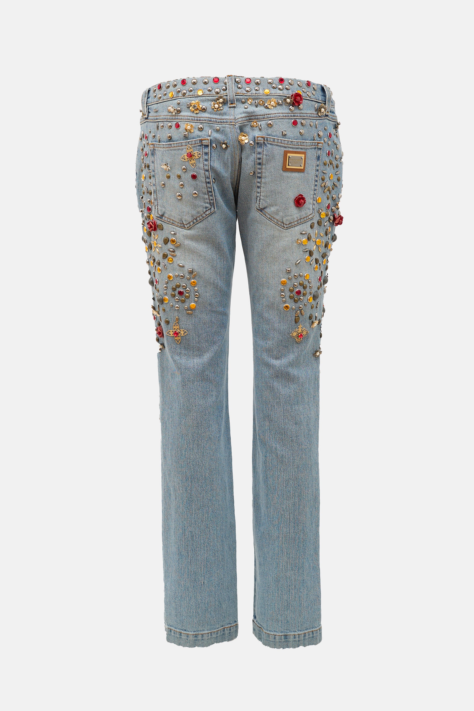 Pre-owned Dolce & Gabbana Spring 2015 light wash jeans featuring straight leg, five pocket styling, metal logo plaque at back right pocket, zip fly, light distressing, and multicolour flower, crystal, and ornate embellishments throughout. Clipped to fit model.