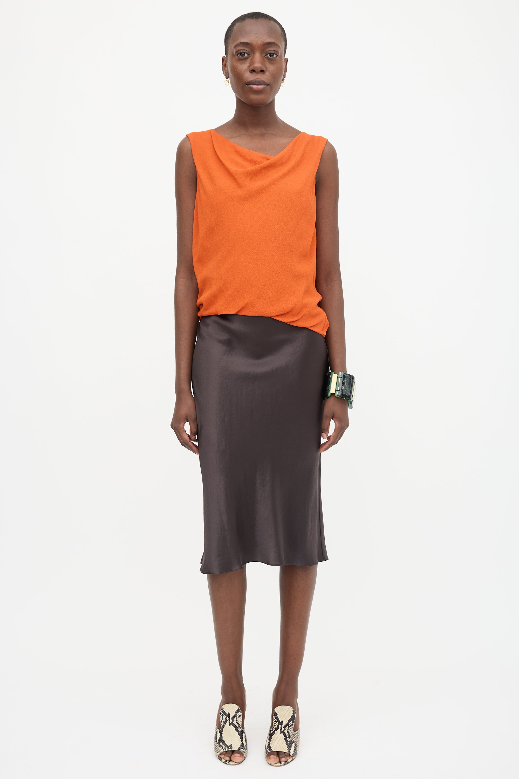 Pre-owned Dries Van Noten orange crepe sleeveless blouse featuring a cowl neck and boxy silhouette. Lined.