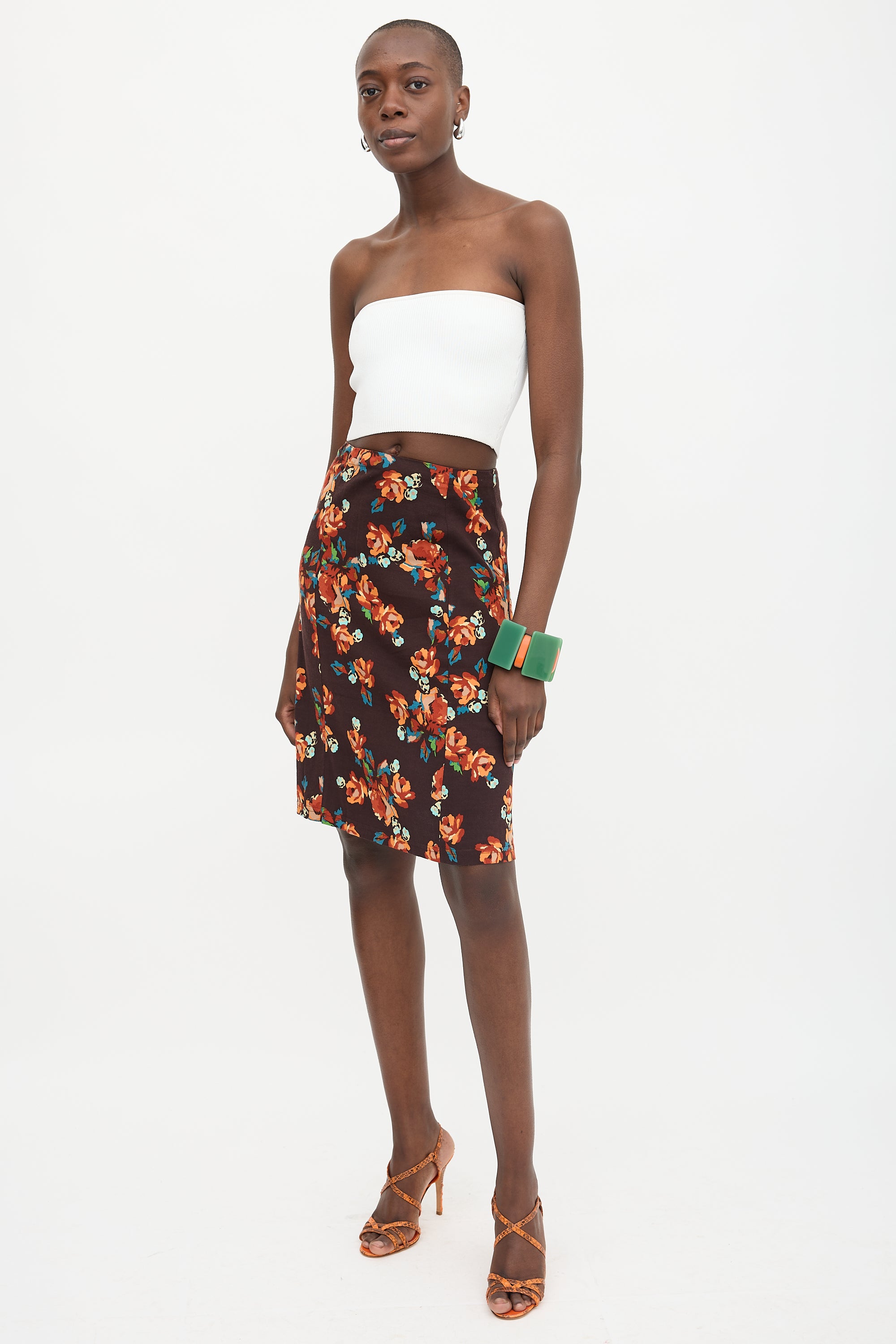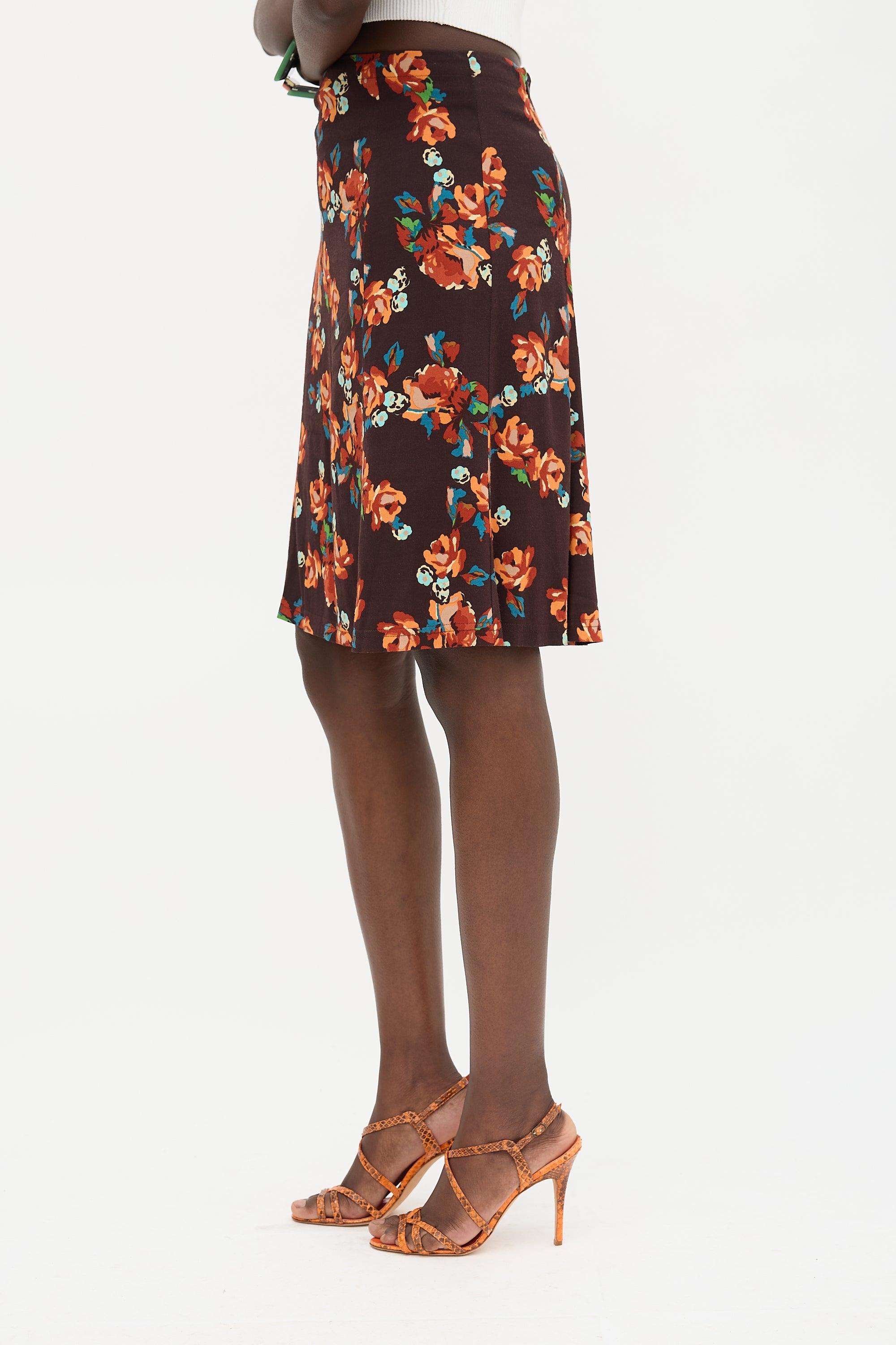Pre-owned Dries Van Noten brown and multicolour midi skirt featuring floral print, high waist, and concealed back zip closure.
