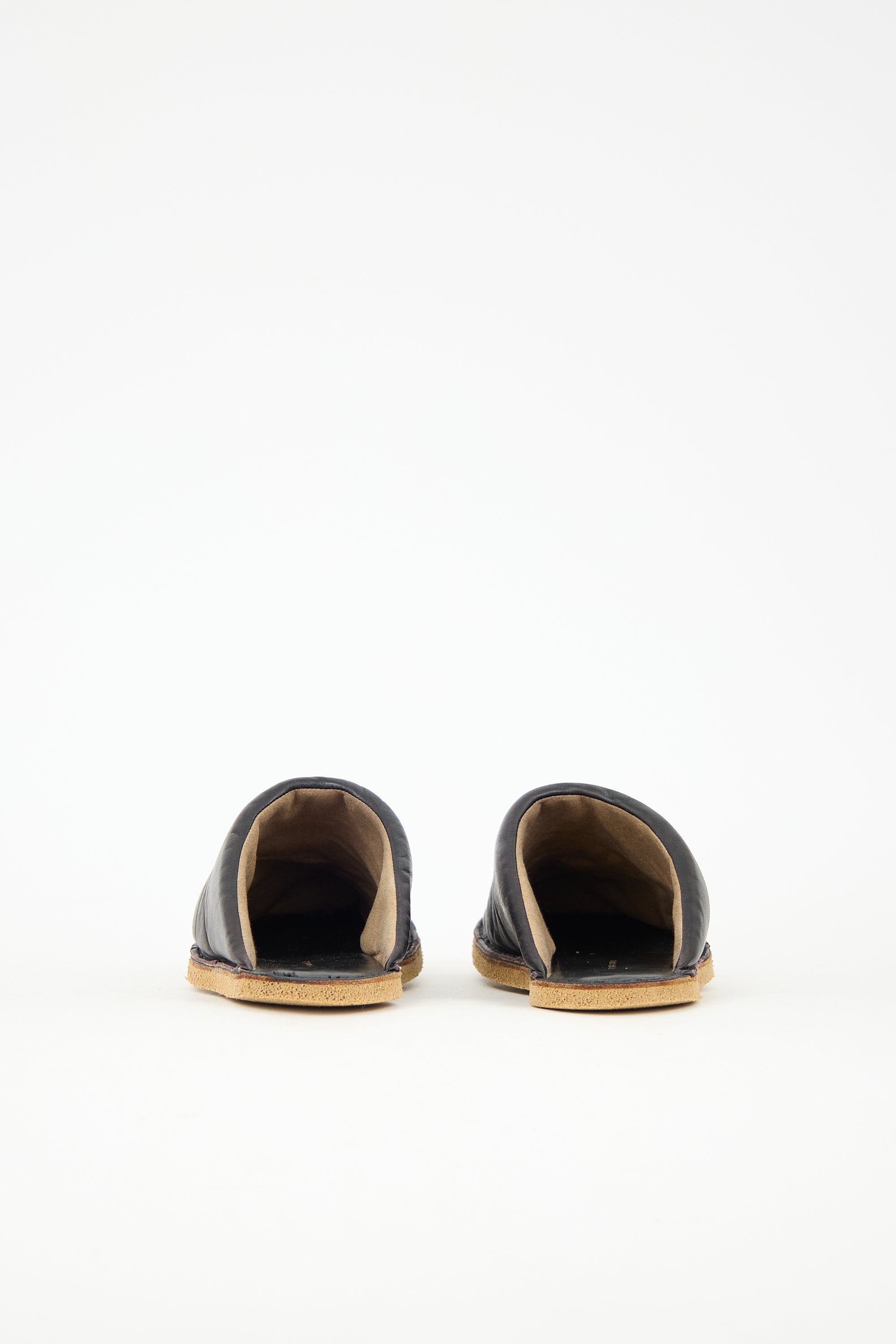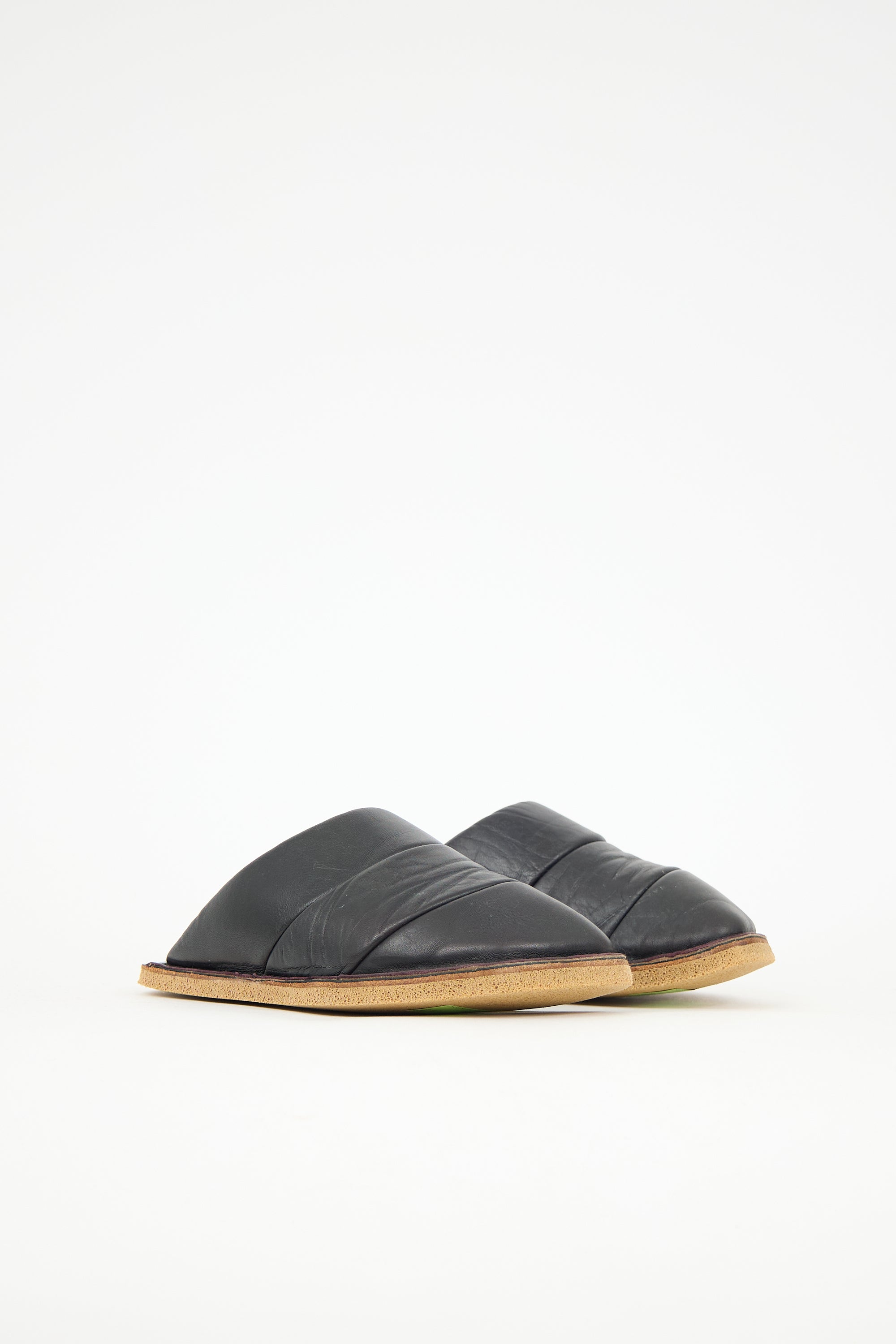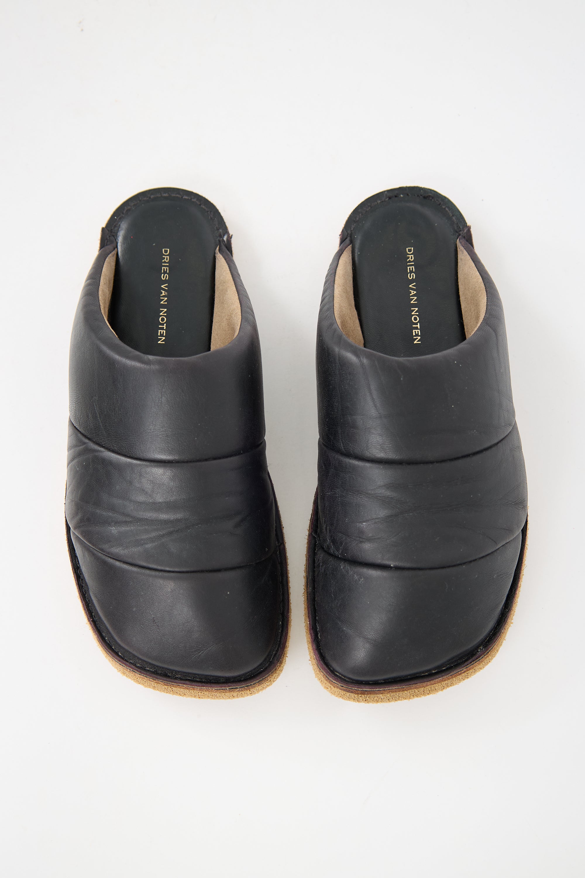 Pre-owned Dries Van Noten black leather mules featuring a square toe, quilted leather upper, and cork sole. Comes with original dust bag.
