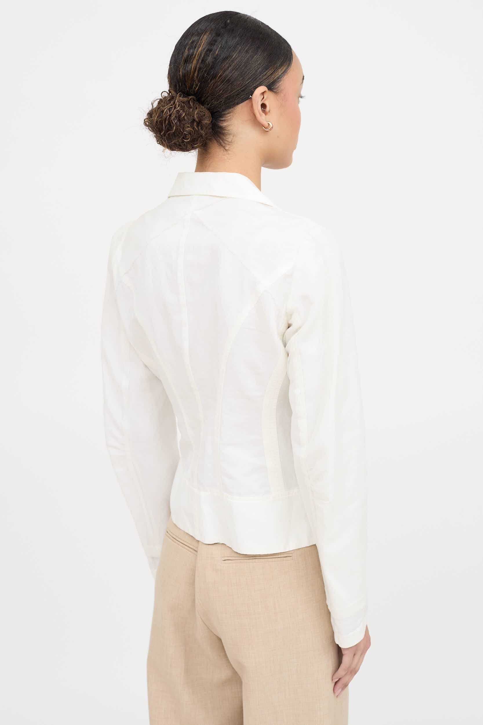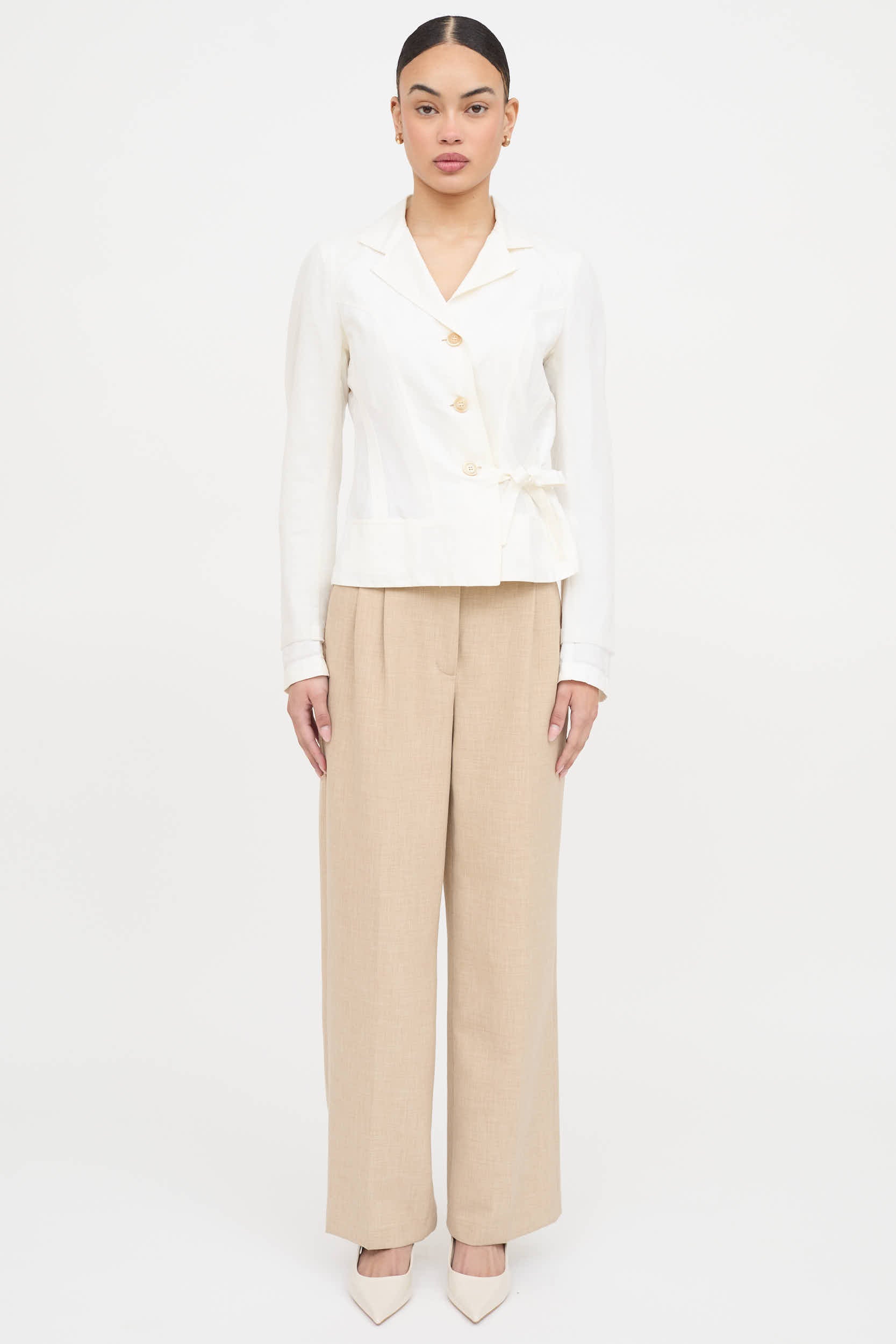 Pre-owned Dries Van Noten white blazer featuring peak lapel collar, button up front with side tie, small pocket slits at waist and mesh overlay at sleeves as well as mesh detailing at back.