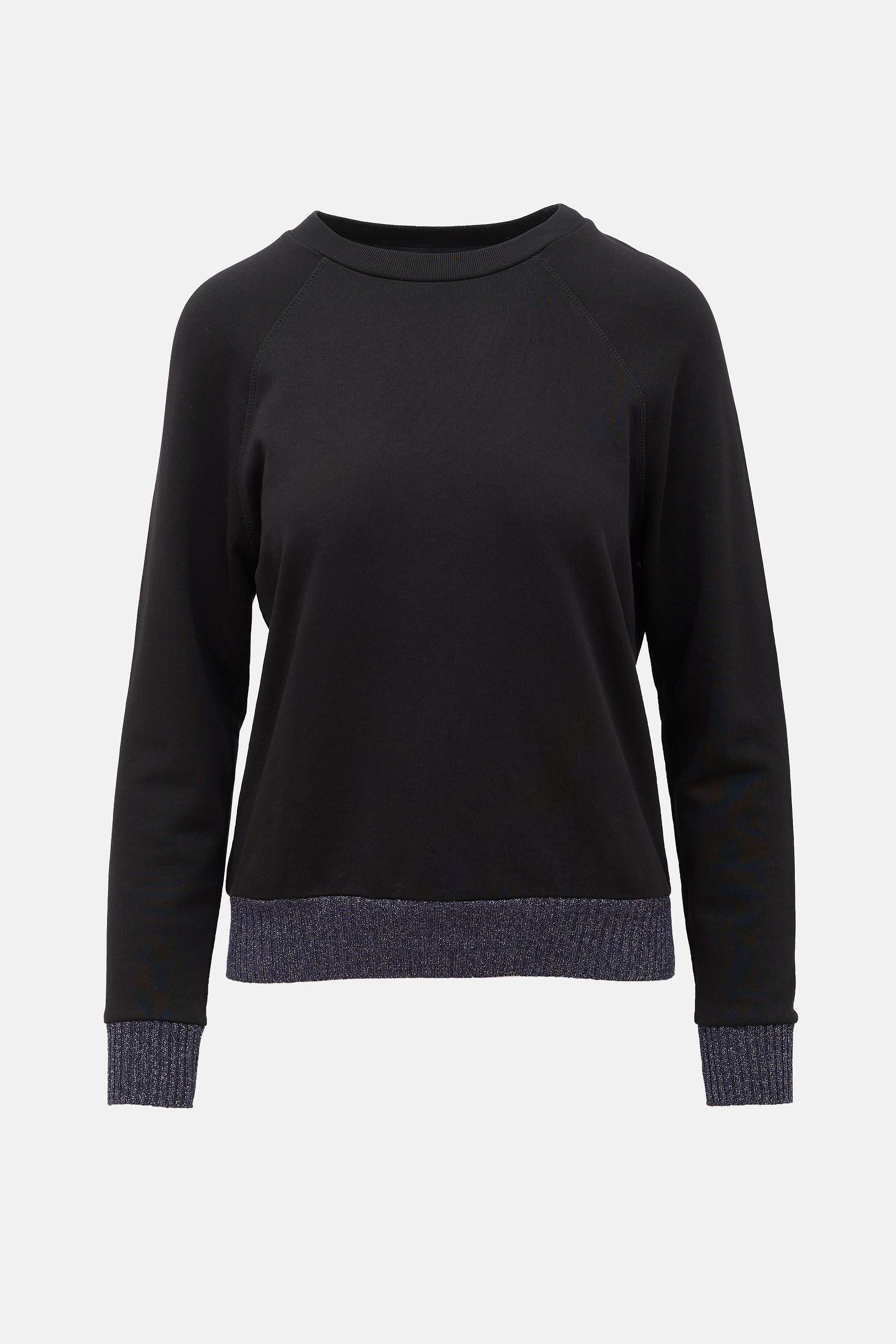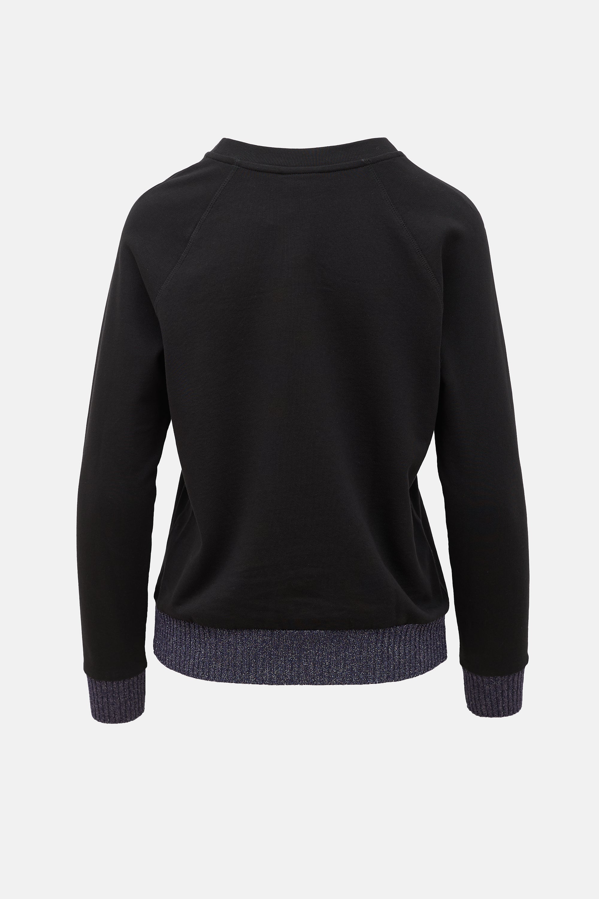 Pre-owned Dries Van Noten black sweatshirt featuring a crew neckline, raglan sleeves, and a navy metallic threaded hem and cuffs.