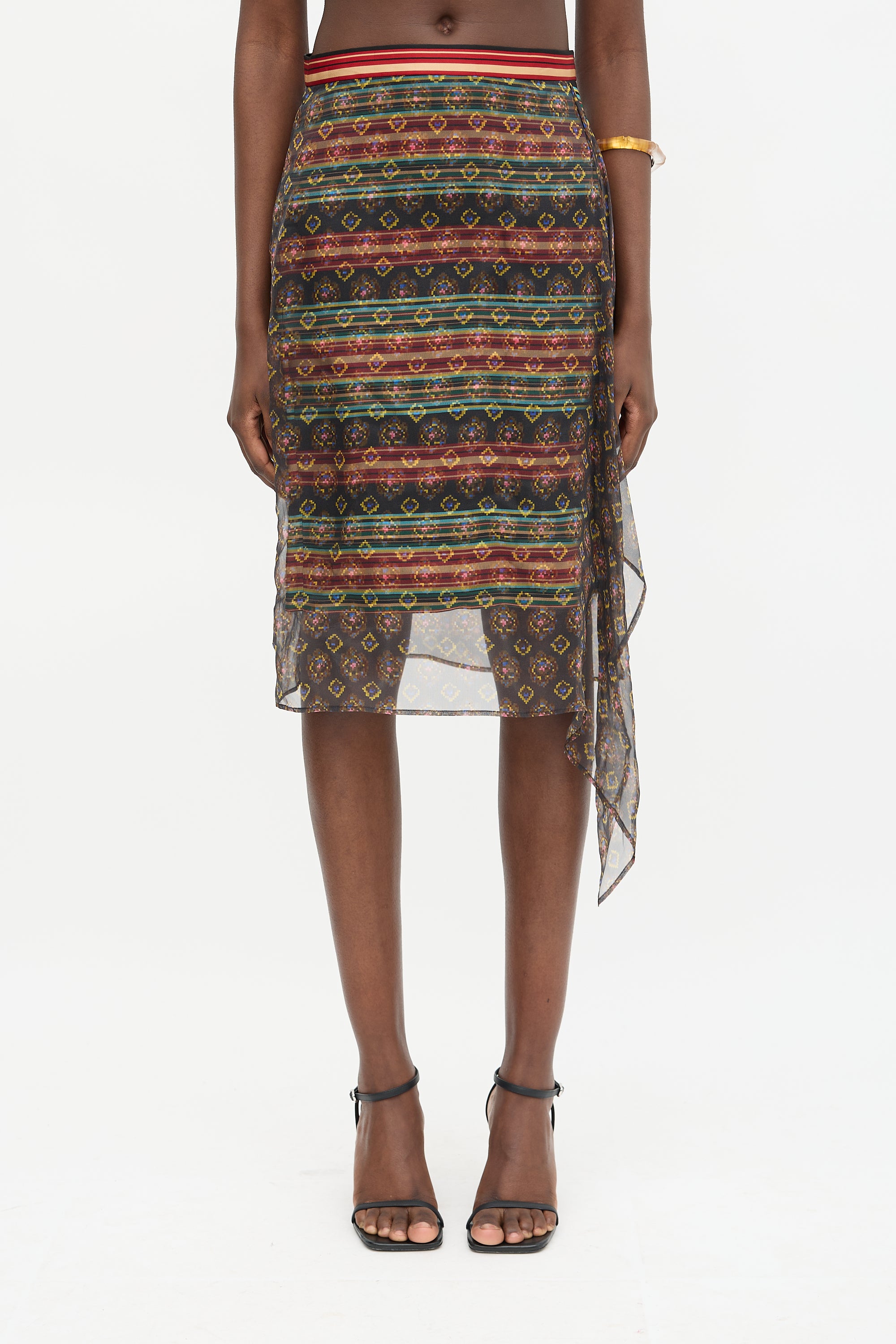 Pre-owned Dries Van Noten multicolour silk midi skirt featuring mixed prints, draped overlay, left in seam pocket, right side slit, and concealed side zip closure. Unlined.