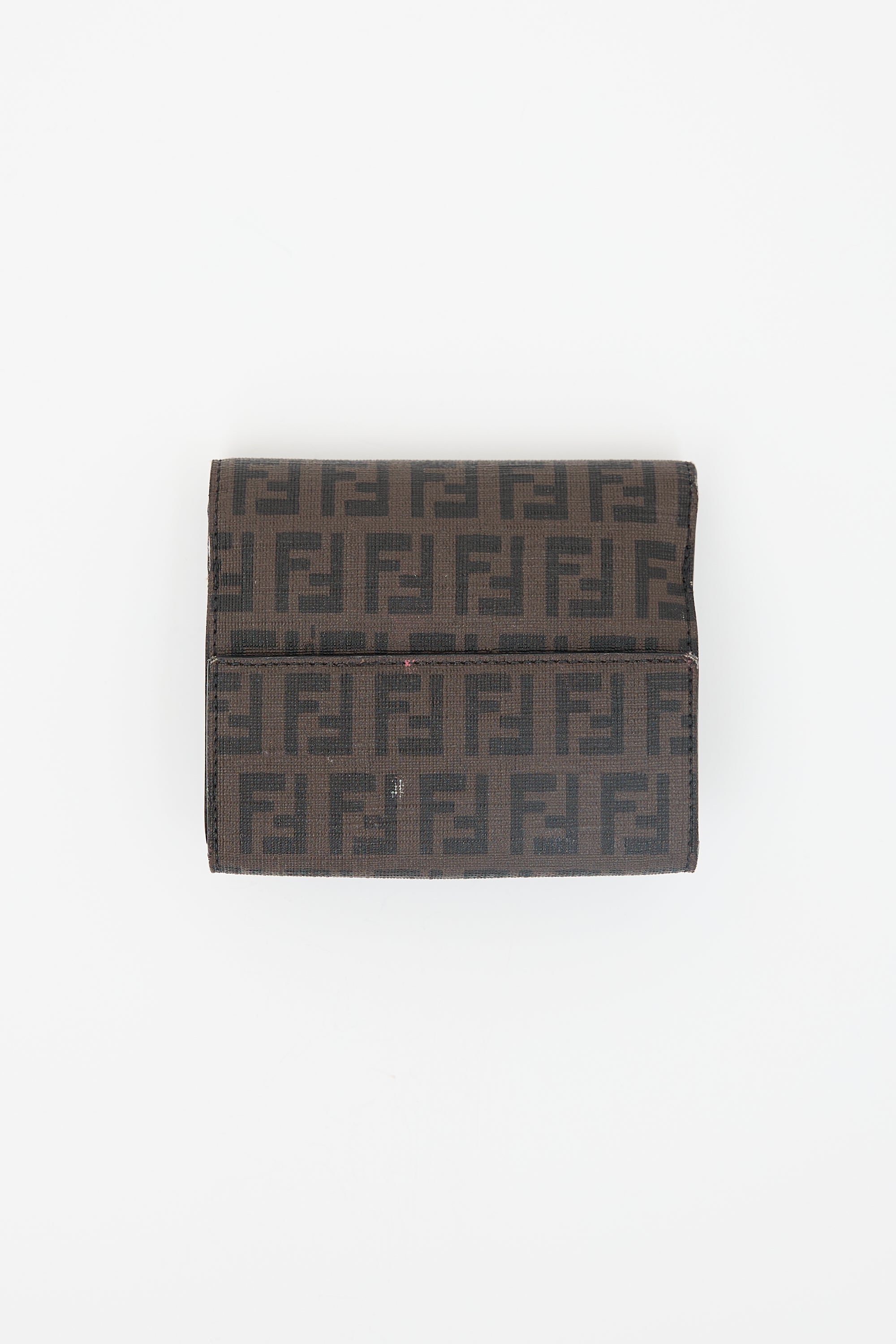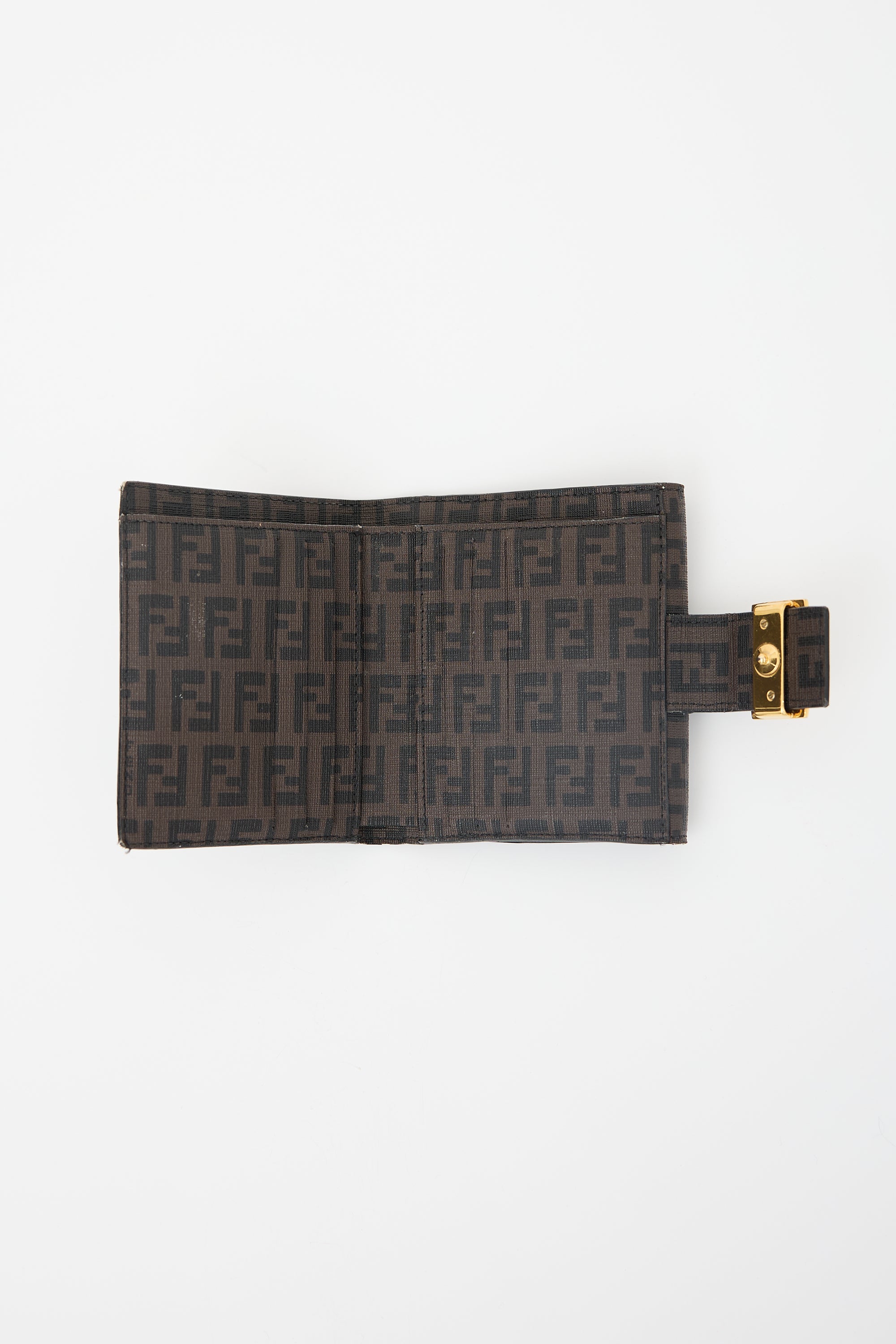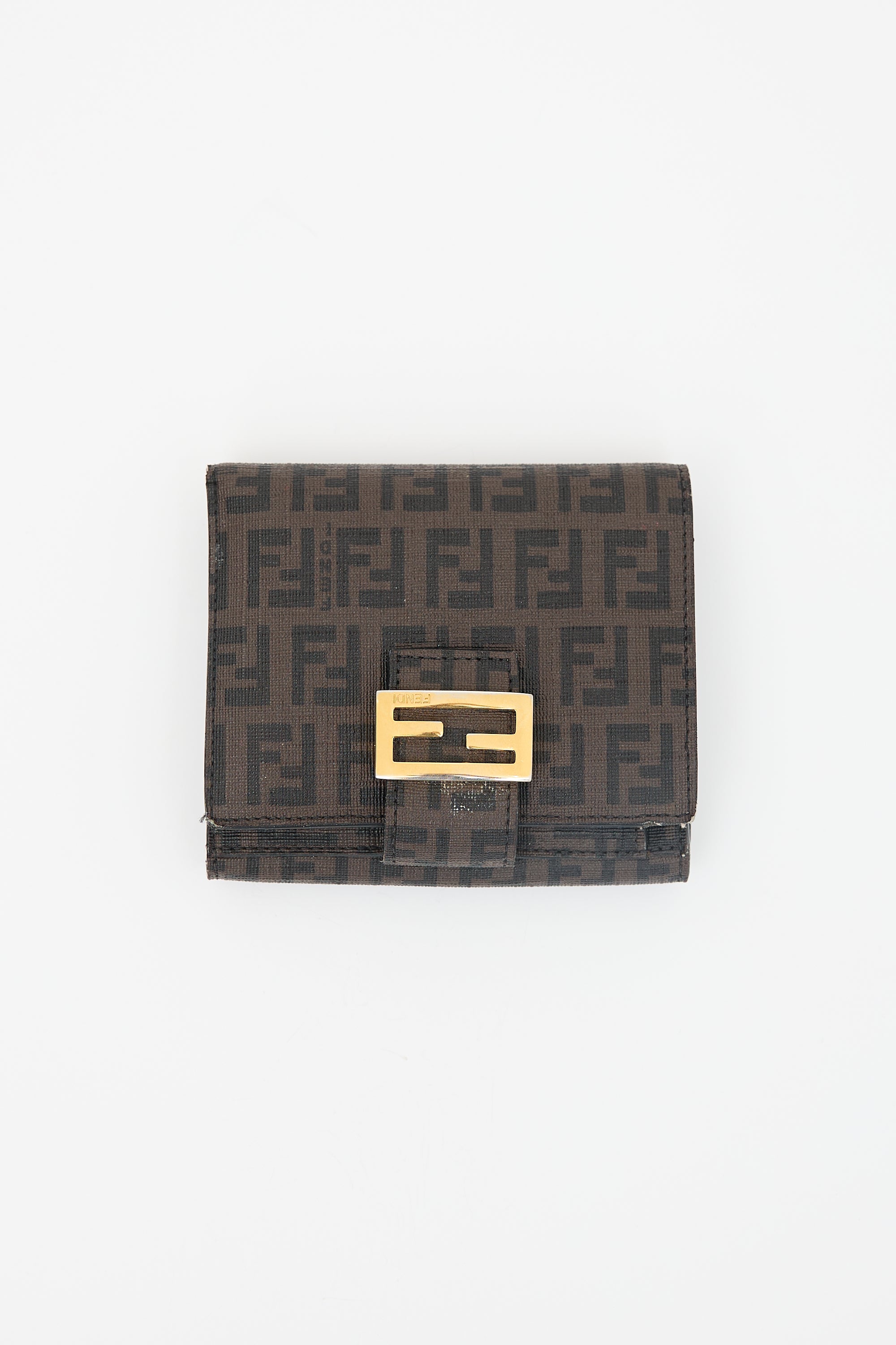 Pre-owned Fendi vintage brown and black wallet featuring gold tone FF hardware at button closure, FF monogram, coin purse at back, and interior compartment includes one bill pocket and eight card slots.