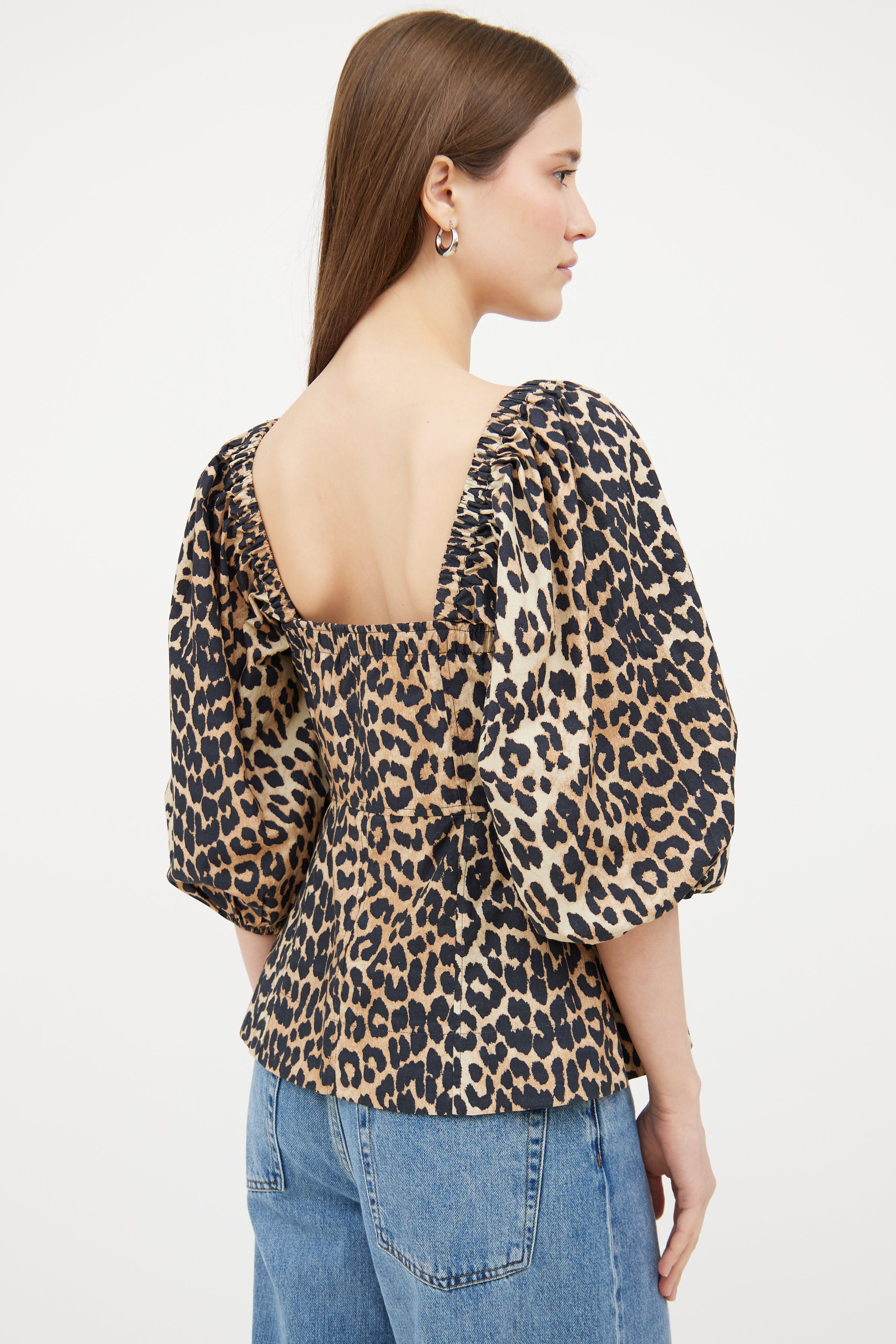 Pre-owned Ganni brown top featuring a black leopard print pattern throughout, straight across neckline, puff sleeves with elastic trim and button up closure at front.