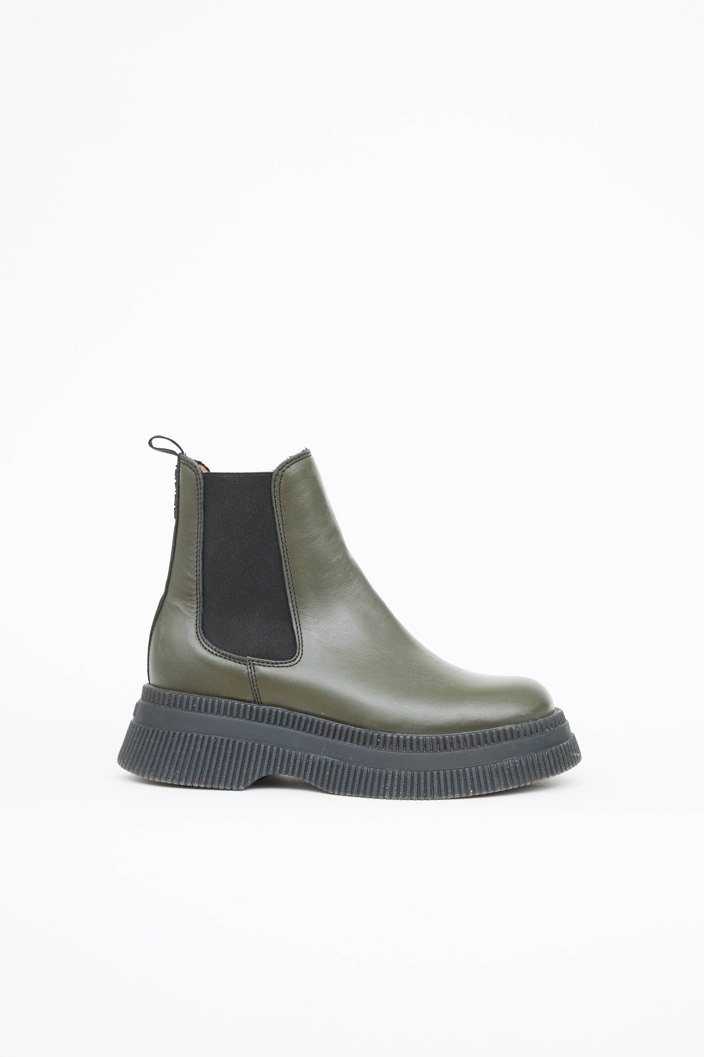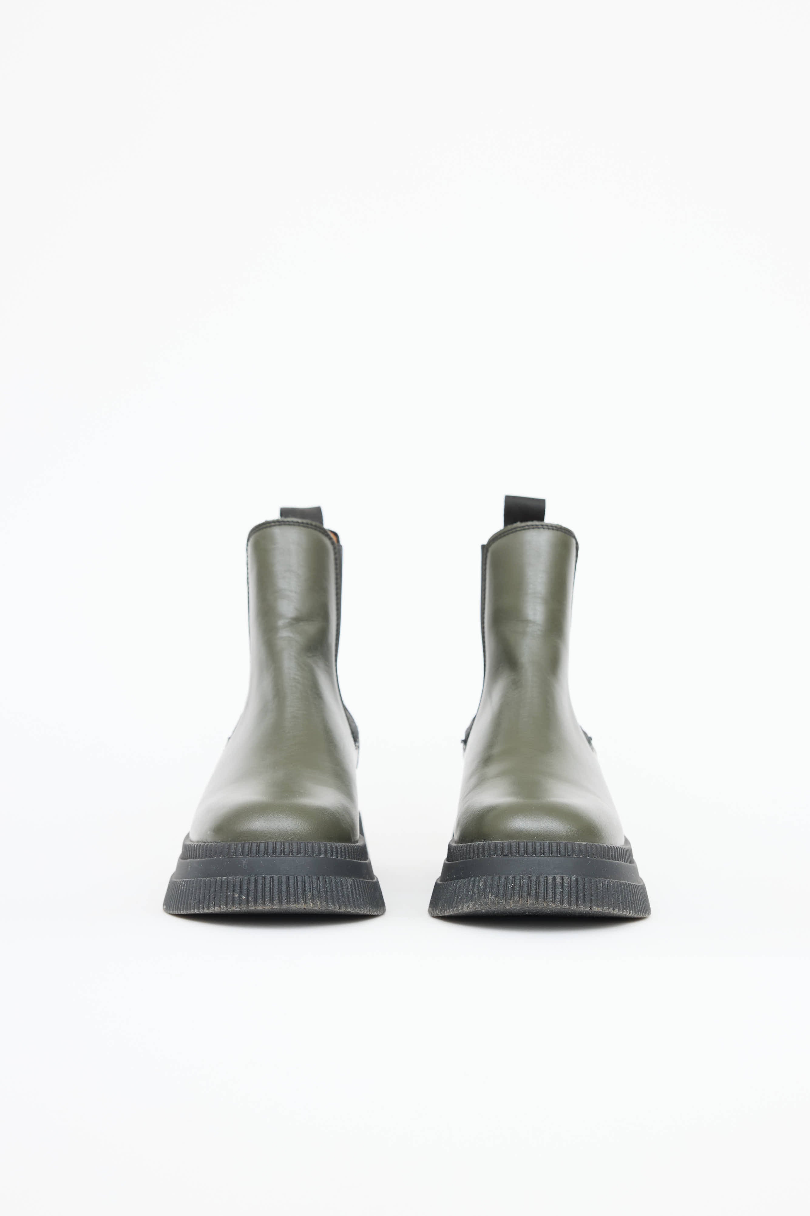Pre-owned Ganni green and black creeper Chelsea boot featuring rounded toe, creeper midsole, embossed logo at heel, elasticized gore at sides, and pull tab at shaft.