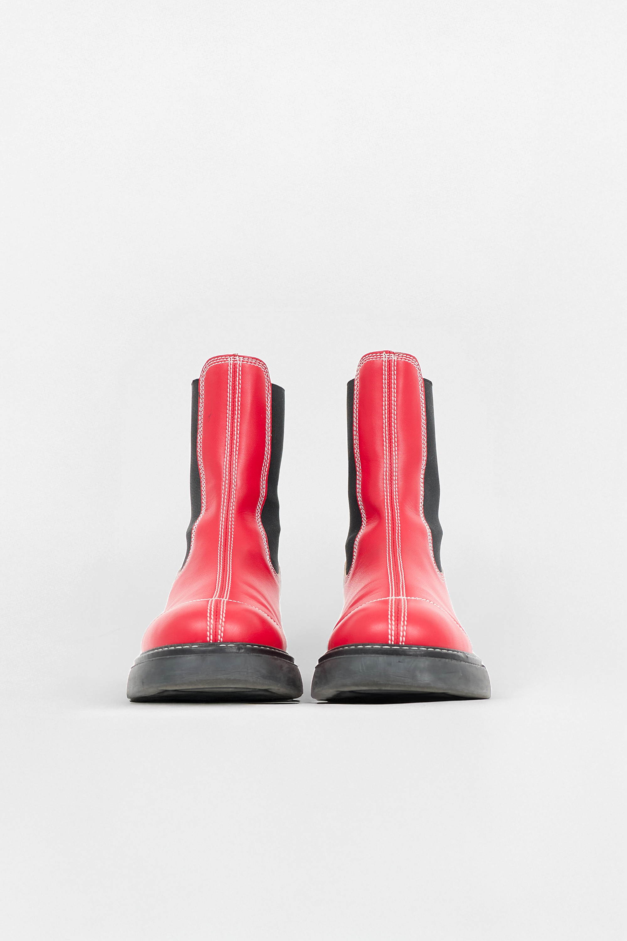 Pre-owned Ganni red leather Everyday Mid Chelsea boots featuring white contrast stitching, rounded toe, black elastic shaft, pull tabs at counter, tonal rubberized logo at back stay, and black rubber sole with embossed logo at heel.