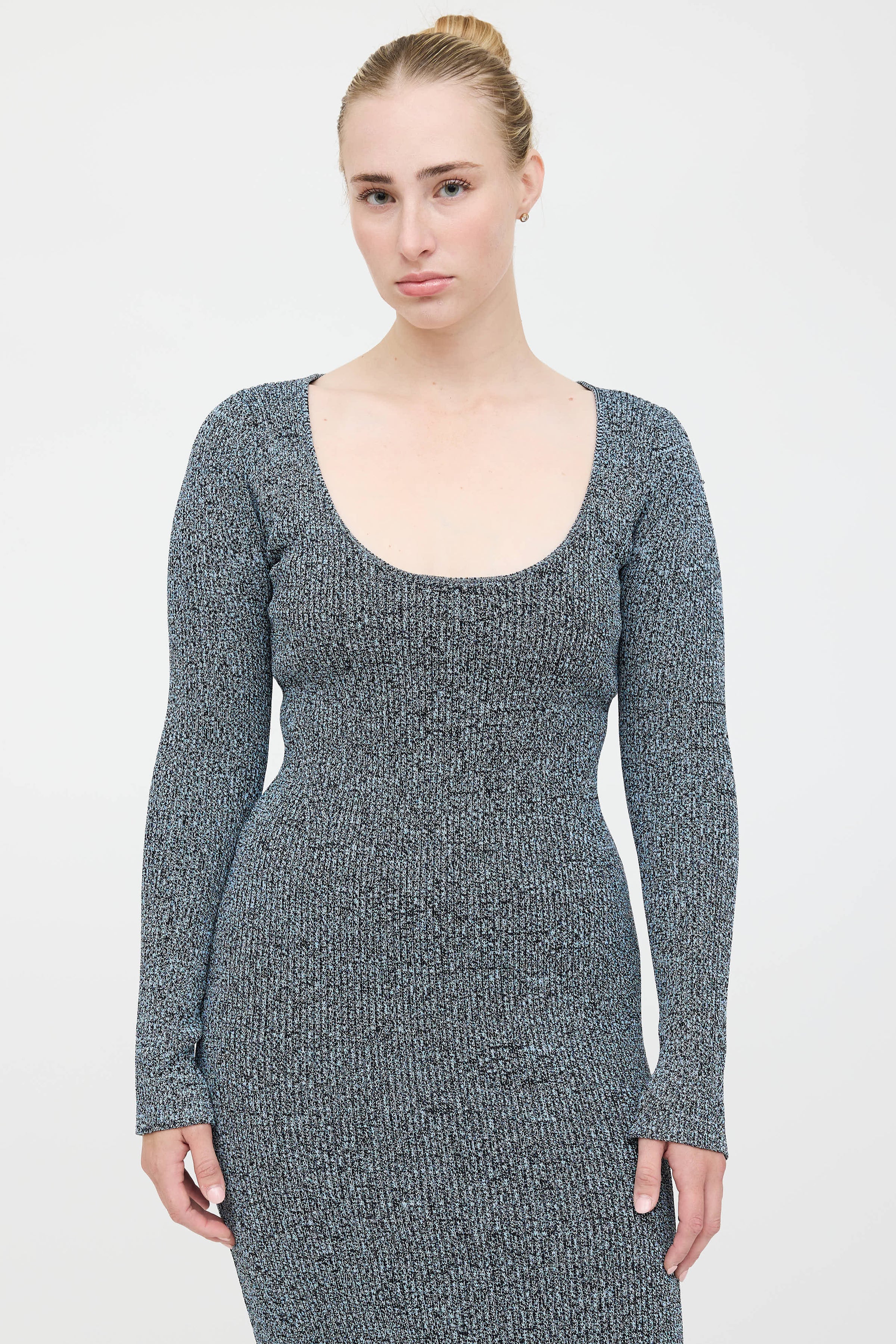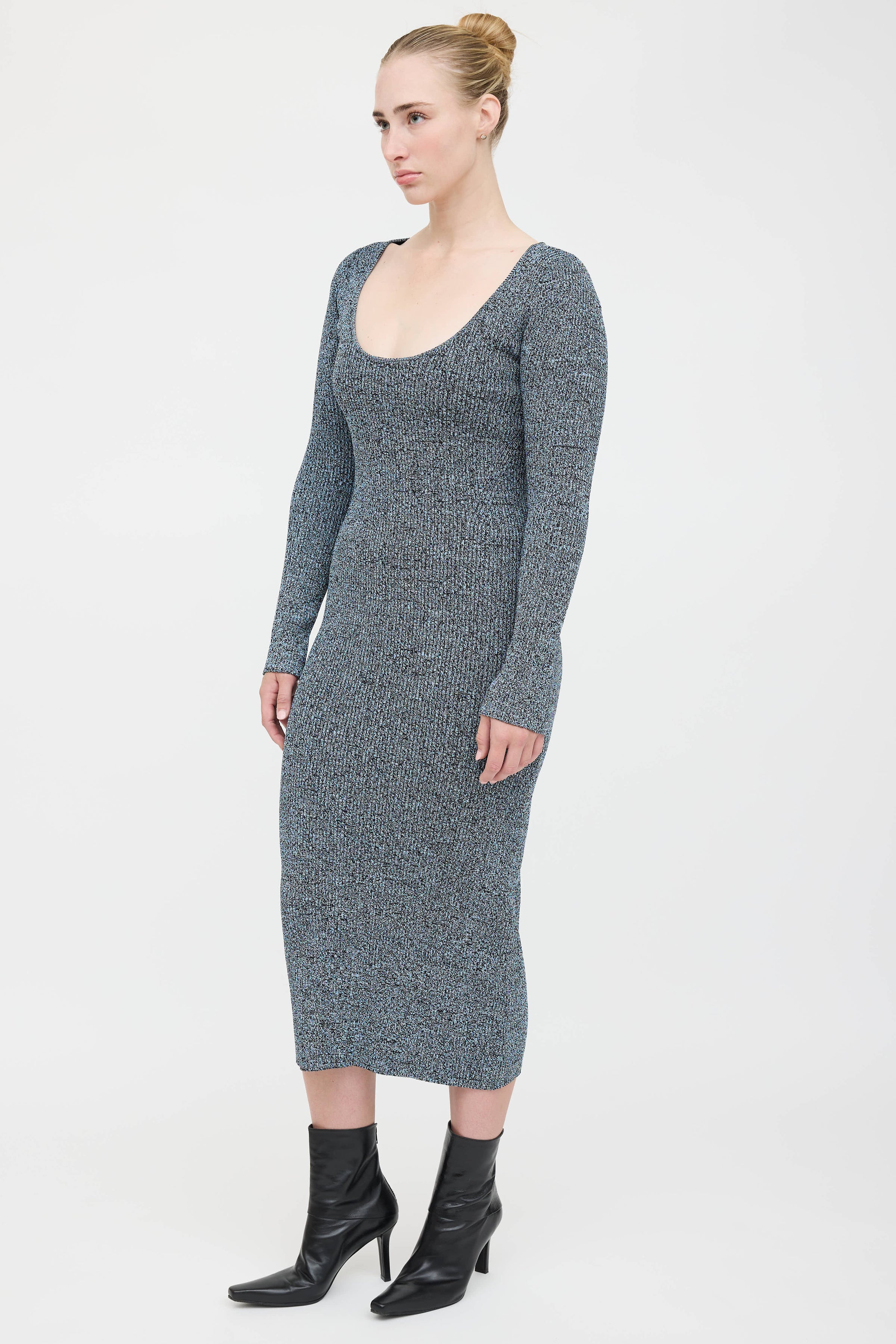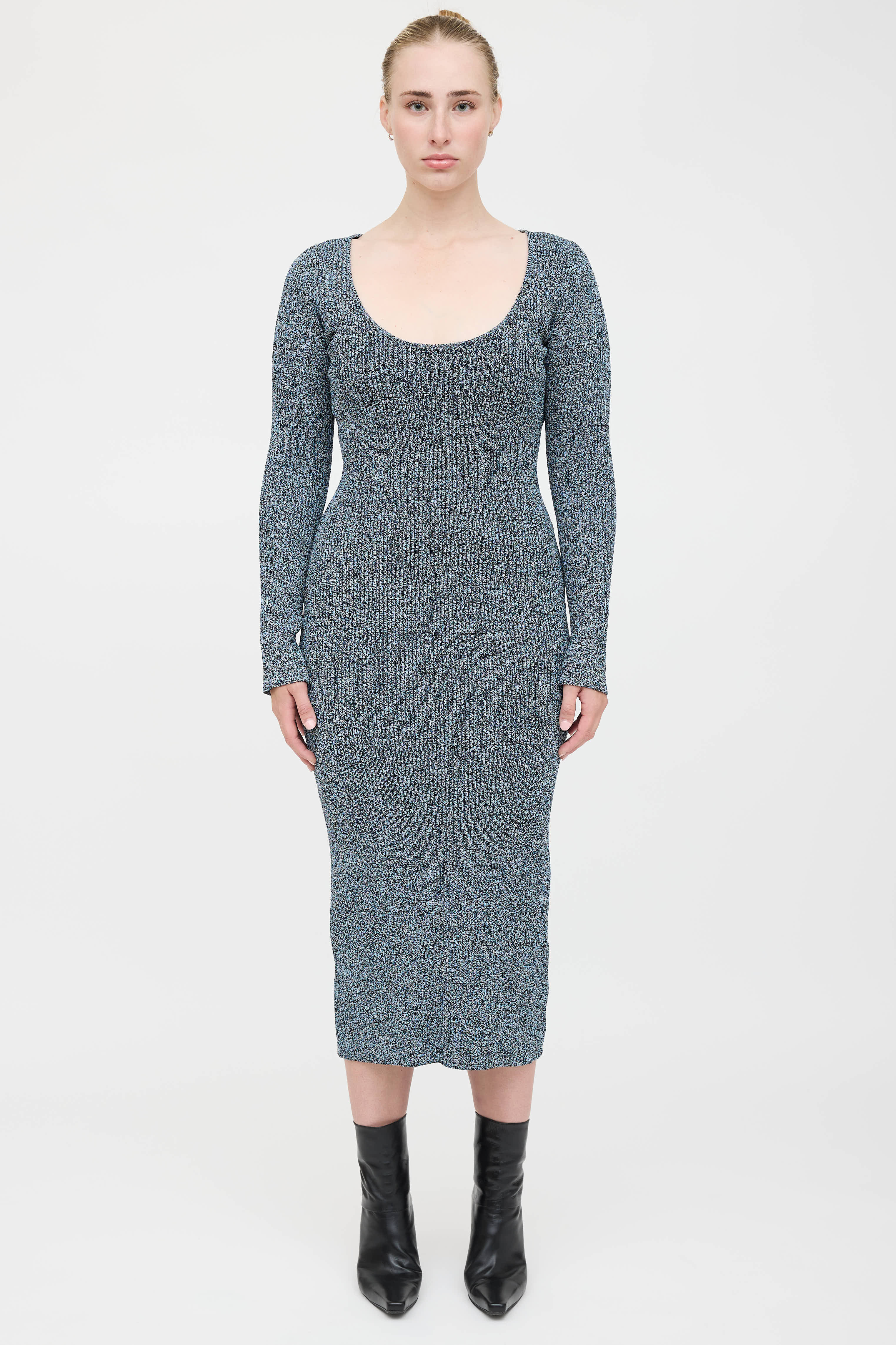 Pre-owned Ganni blue and black long sleeve dress featuring scoop neckline, slit at cuffs, and ribbing throughout.