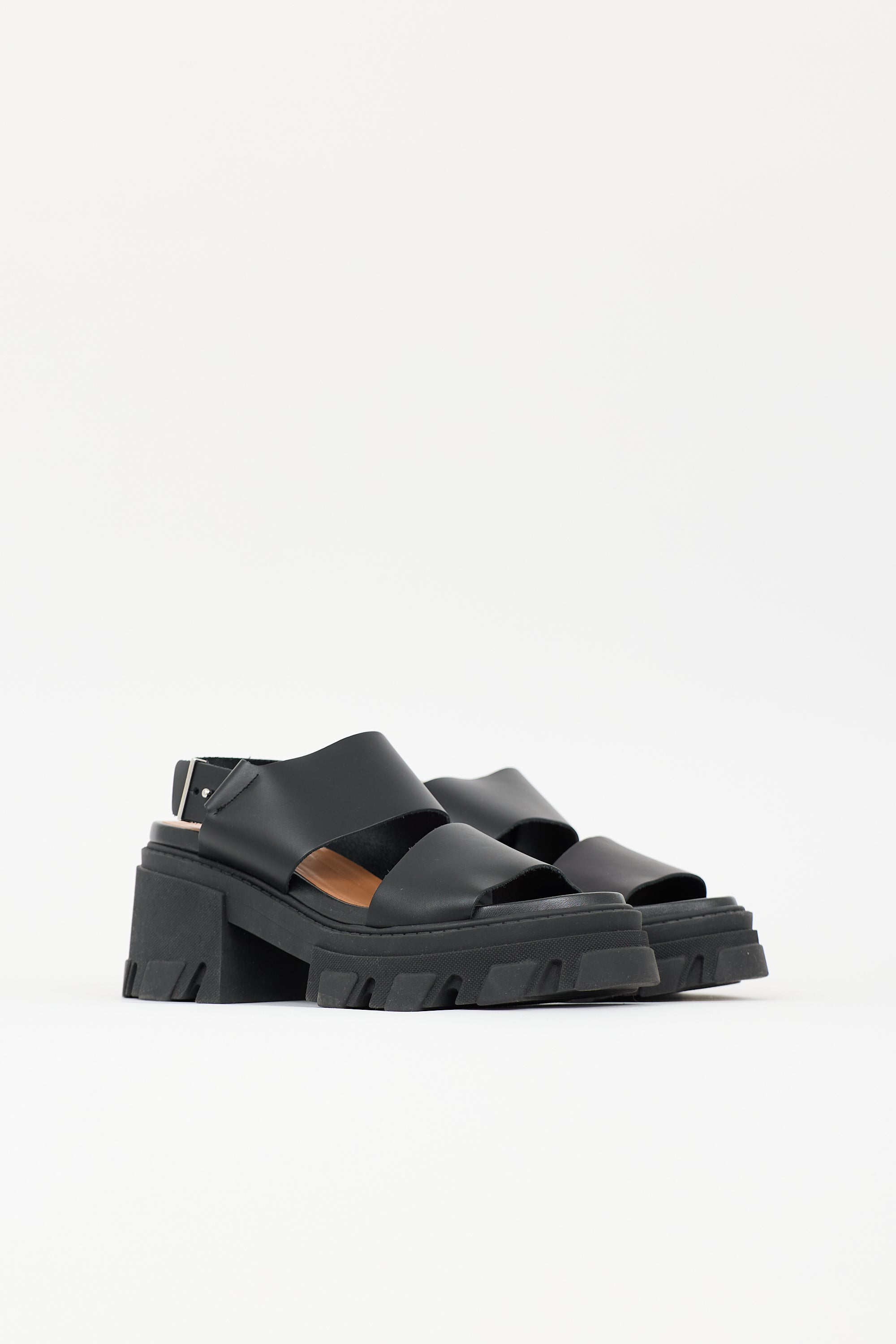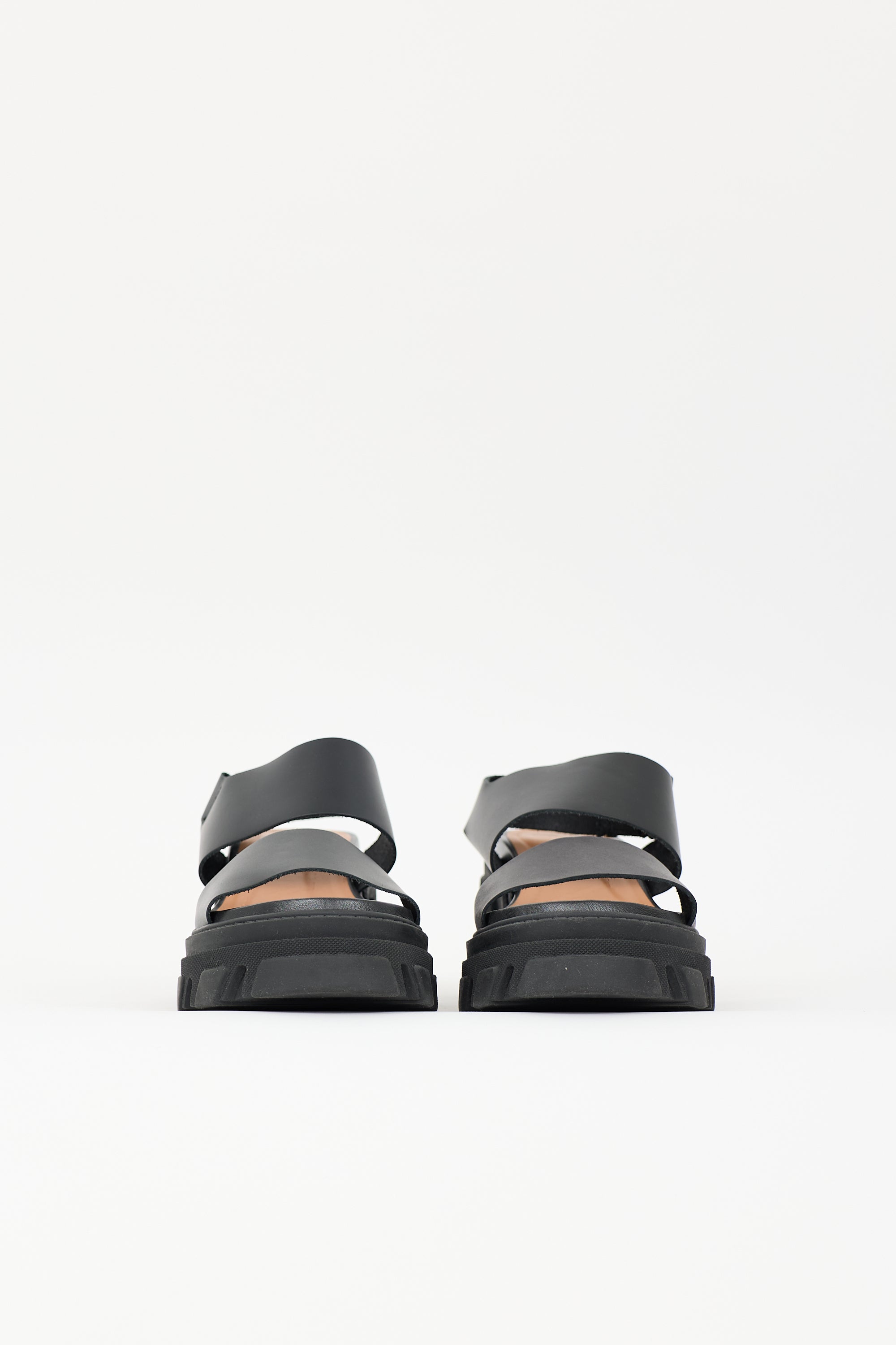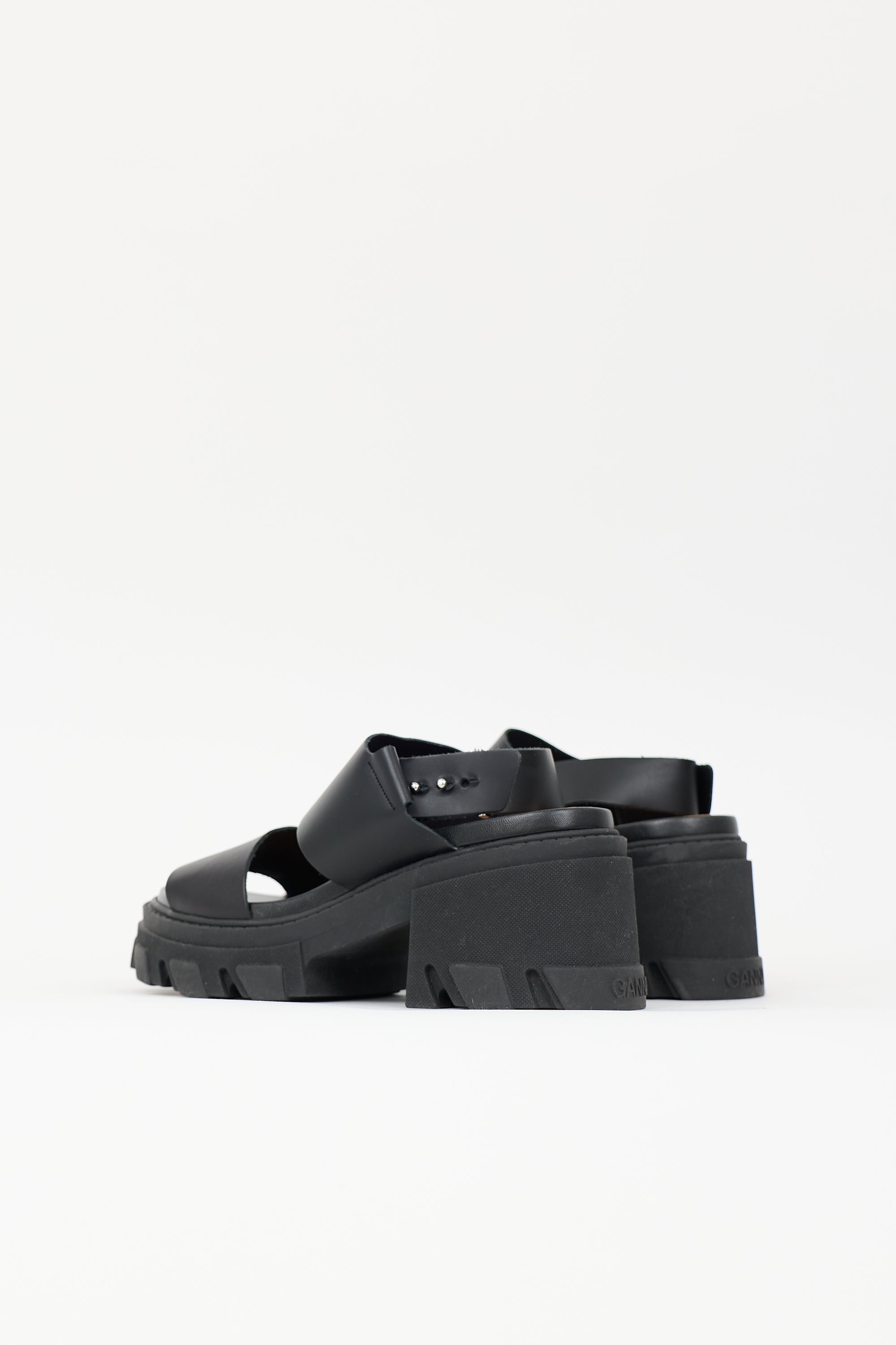 Pre-owned Ganni black leather sandals featuring open rounded toe, adjustable ankle strap, and chunky rubber outsole. Includes original dust bag.