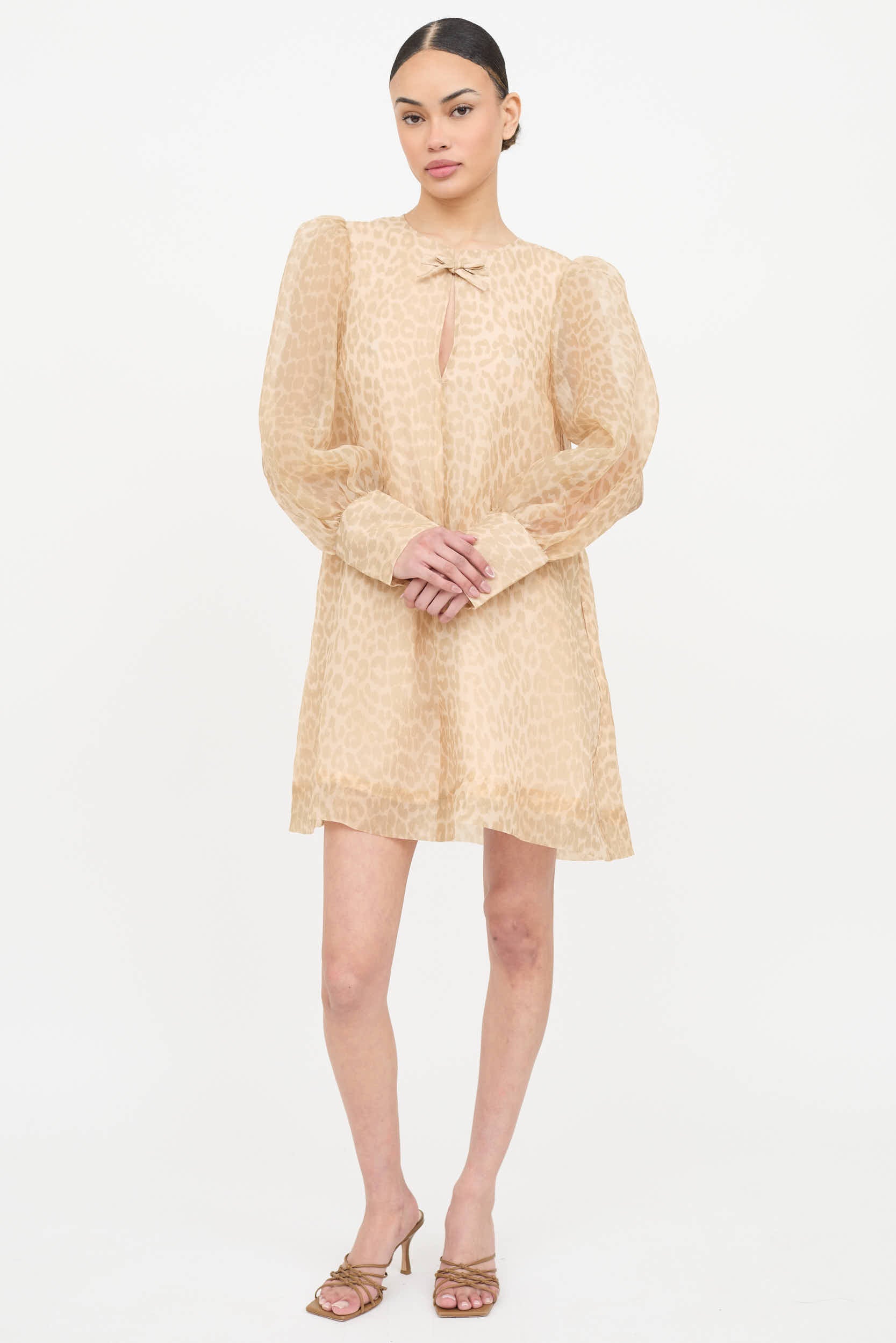 Pre-owned Ganni beige dress featuring a tonal leopard pattern throughout, layered bust, tie keyhole neckline, long puffed sleeves with buttoned cuffs, two slip pockets at hip, and darted bust. Lined.