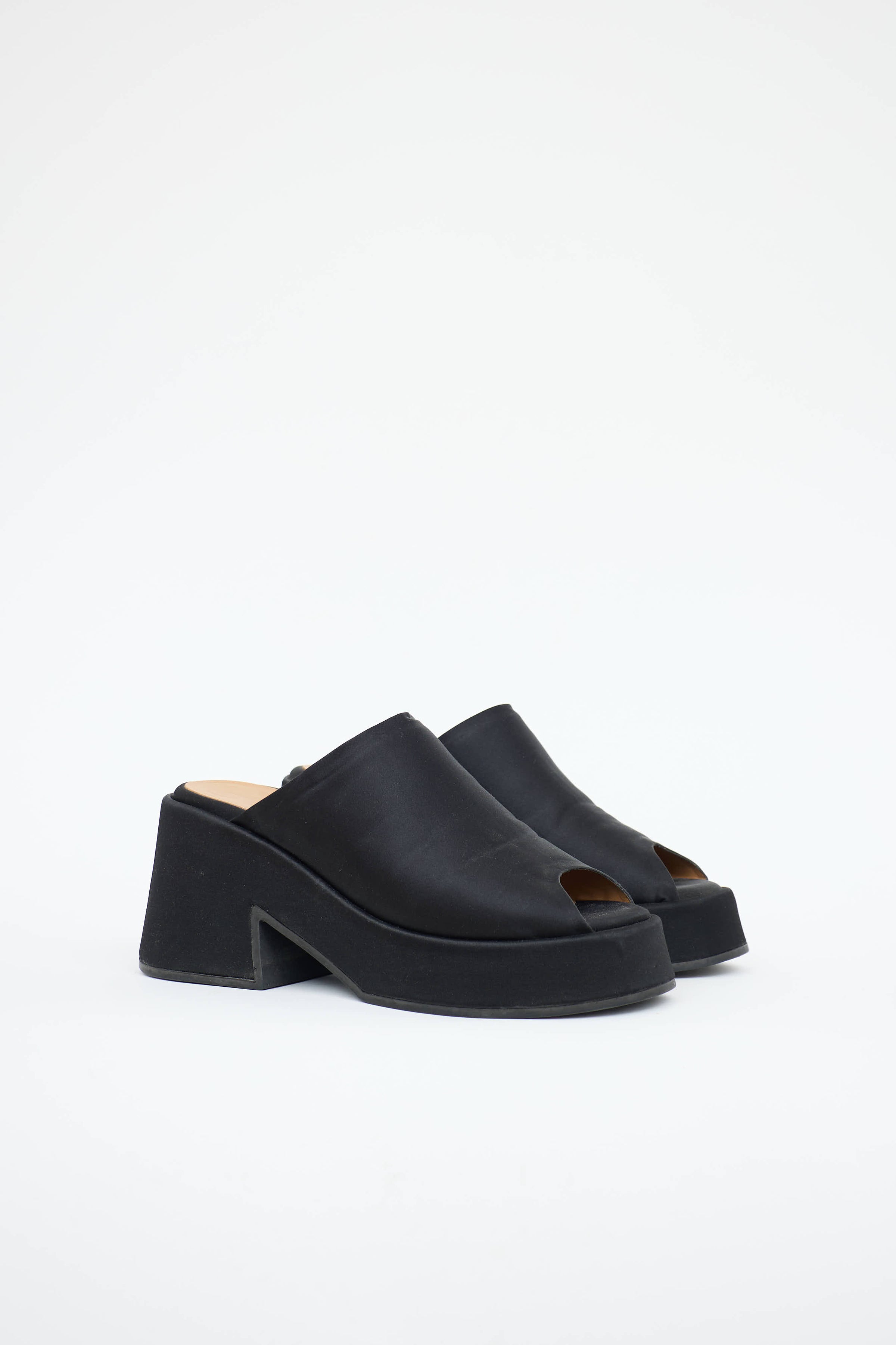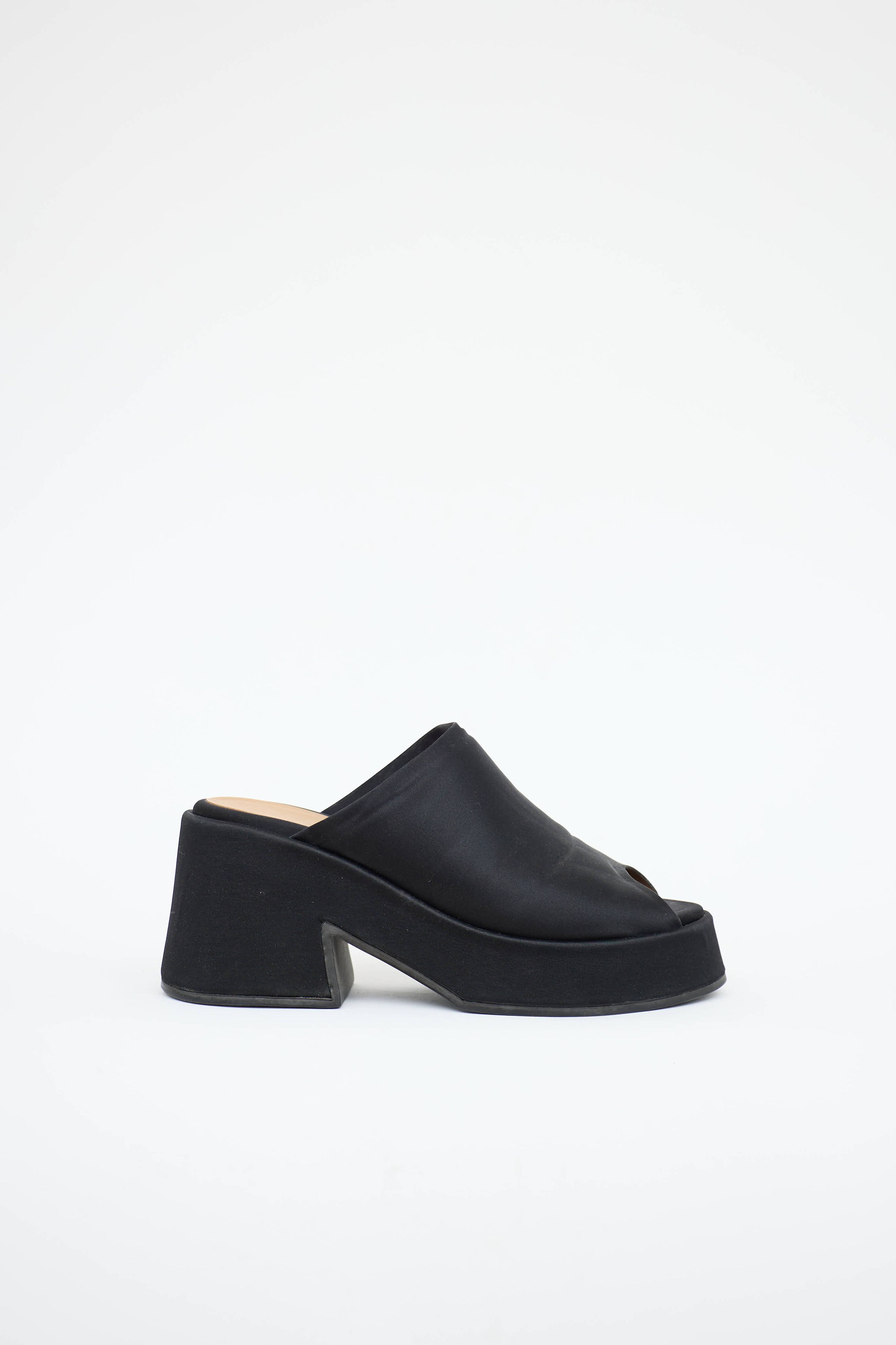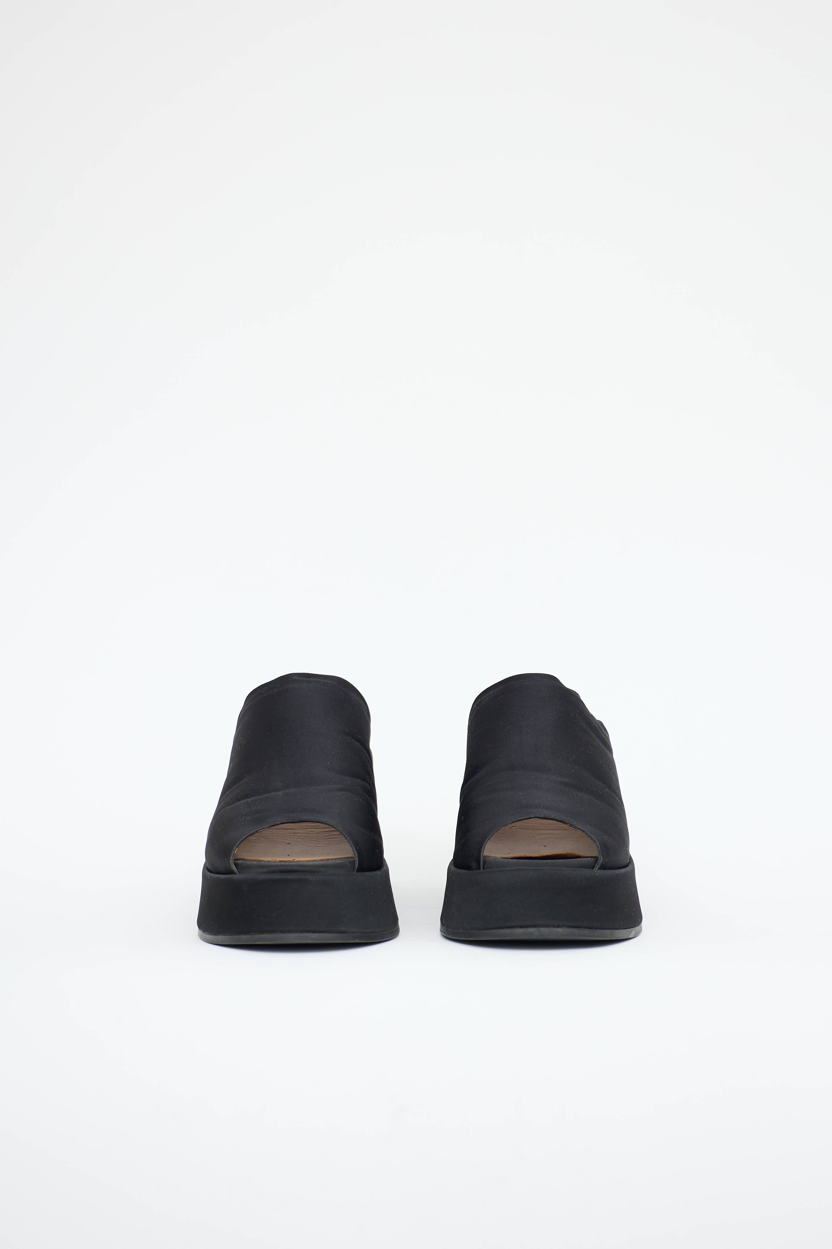 Pre-owned Ganni black mules featuring a rounded open toe, slip on entry, satin uppers, platform sole, and a block heel.