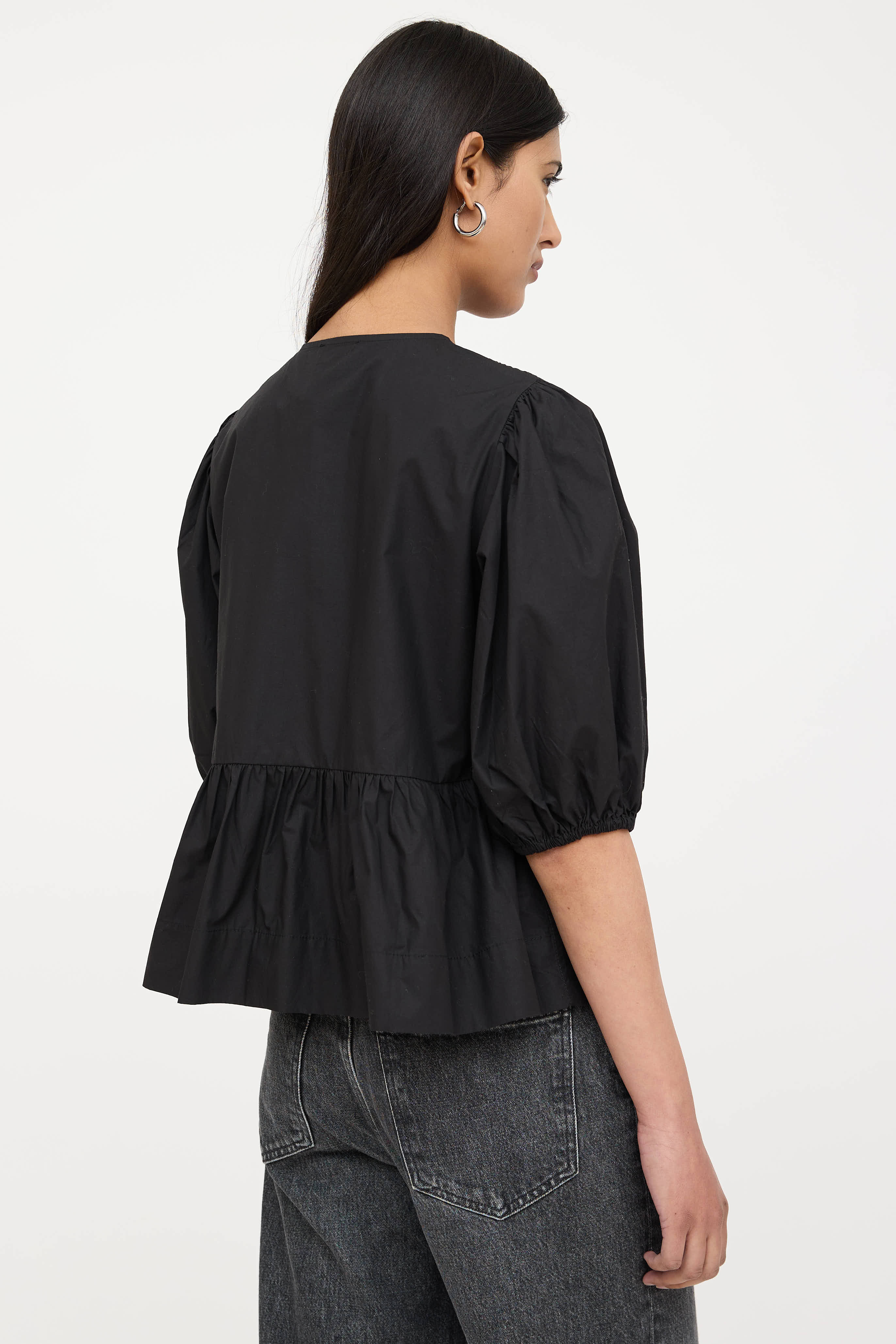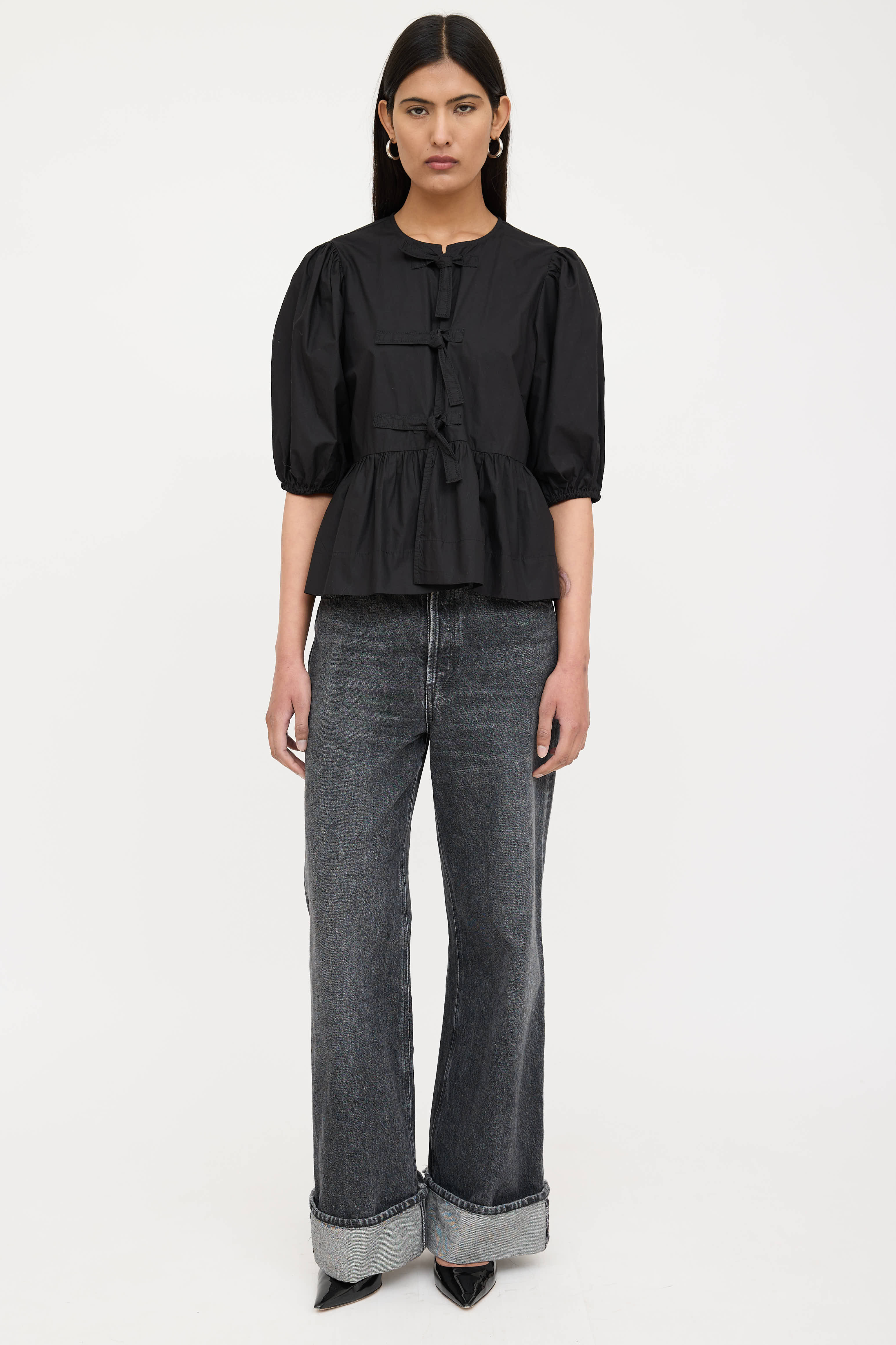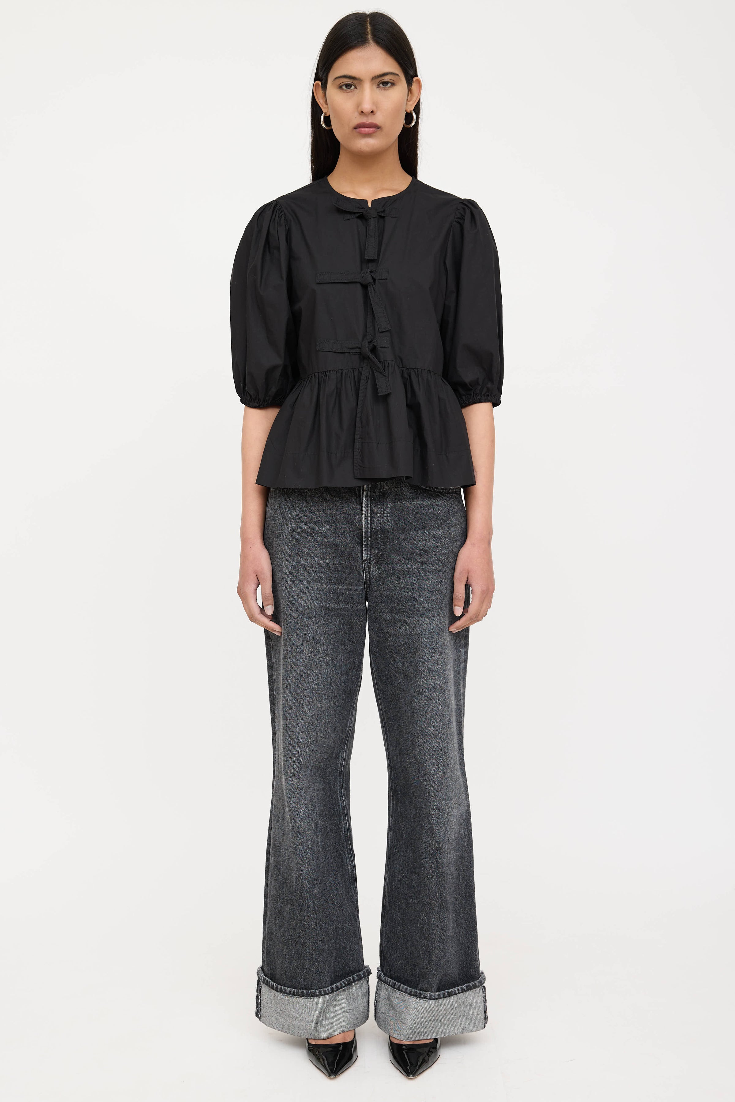 Pre-owned Ganni black cotton top featuring a round neckline, short puffed sleeves, peplum hem, and tie closure.