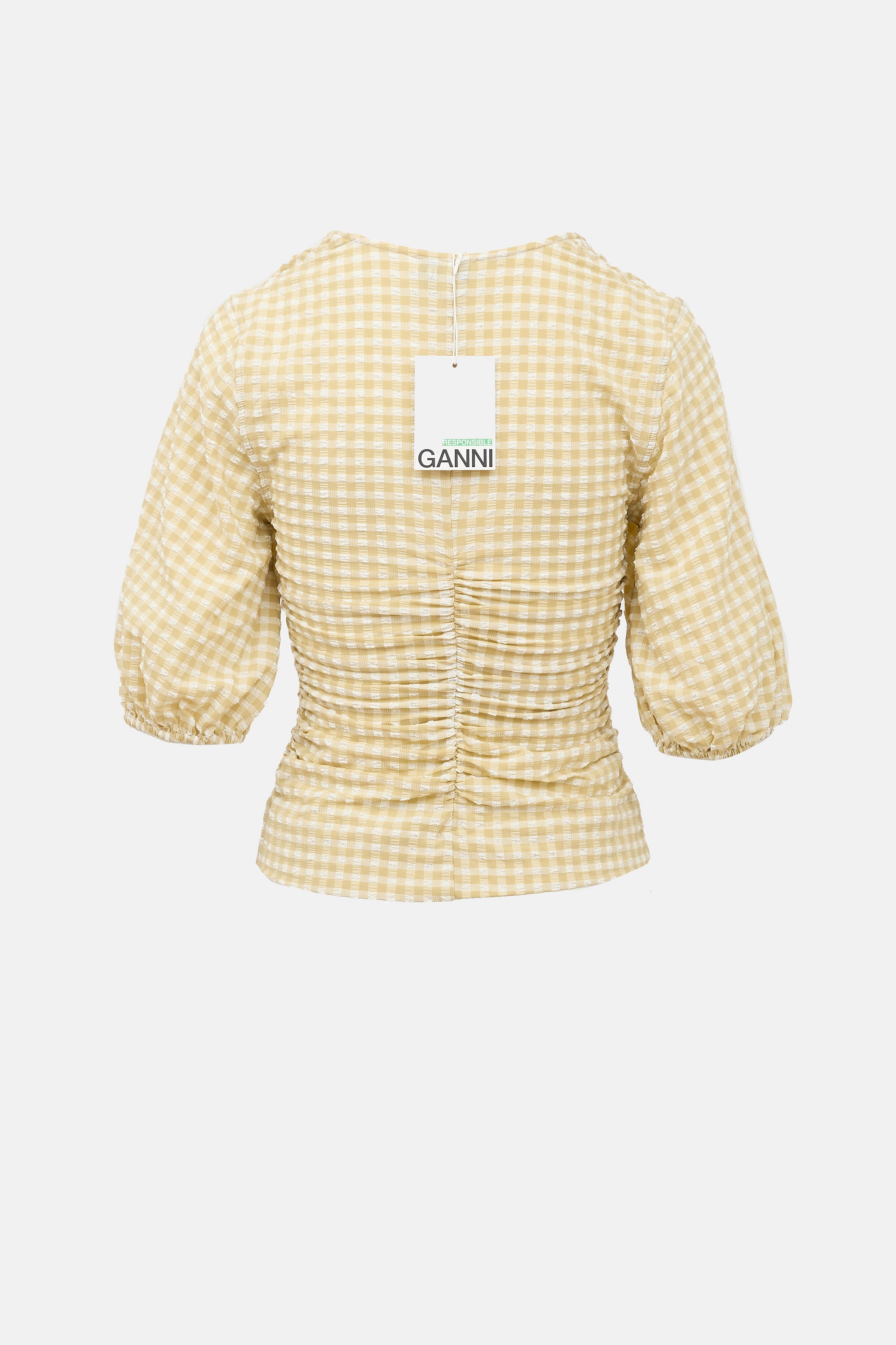 Pre-owned Ganni seersucker top featuring a white and beige check pattern, square neckline, button front, half length puff sleeves, and ruched bodice.