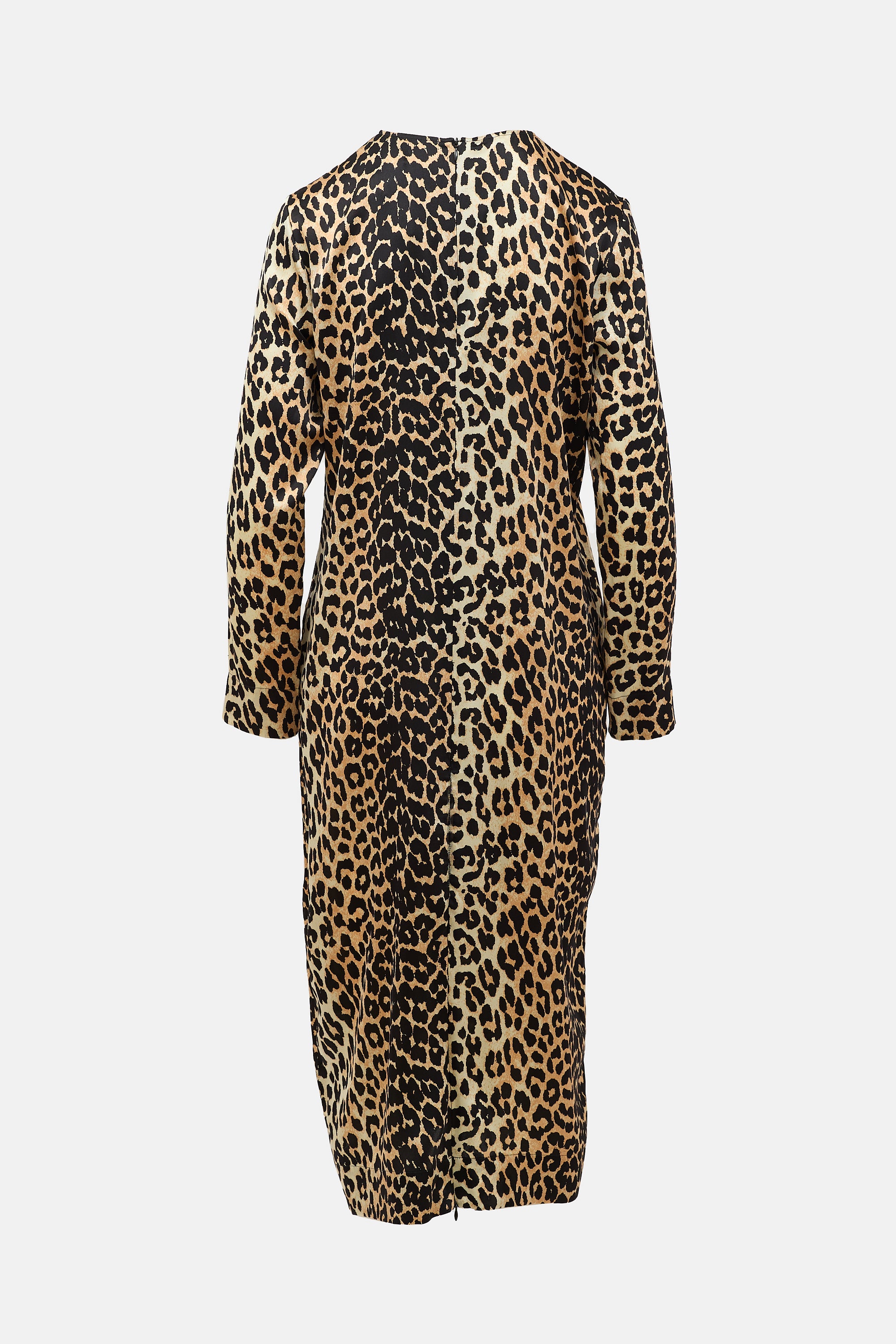 Pre-owned Ganni silk blend satin midi dress featuring a brown and black leopard print, round neckline, long sleeve styling, and concealed back zip.