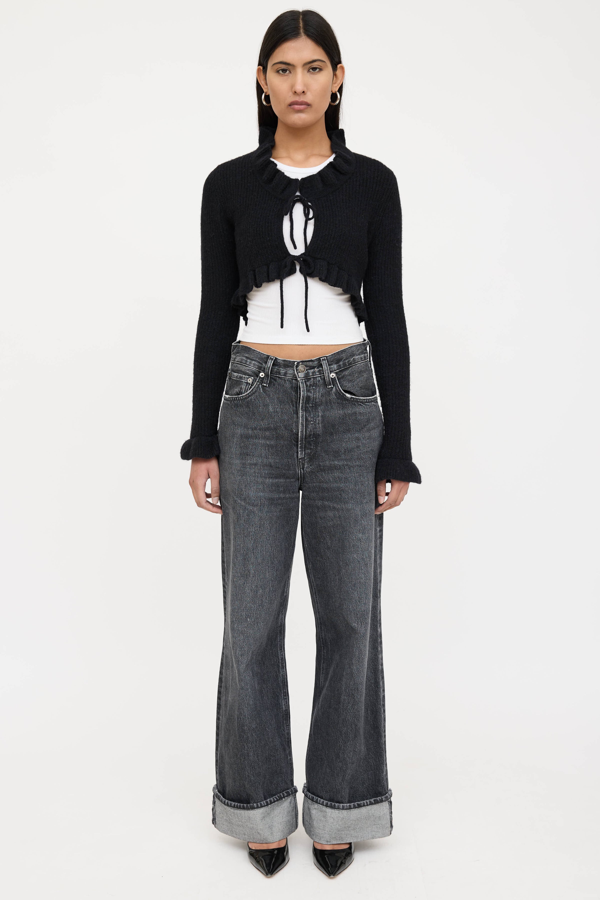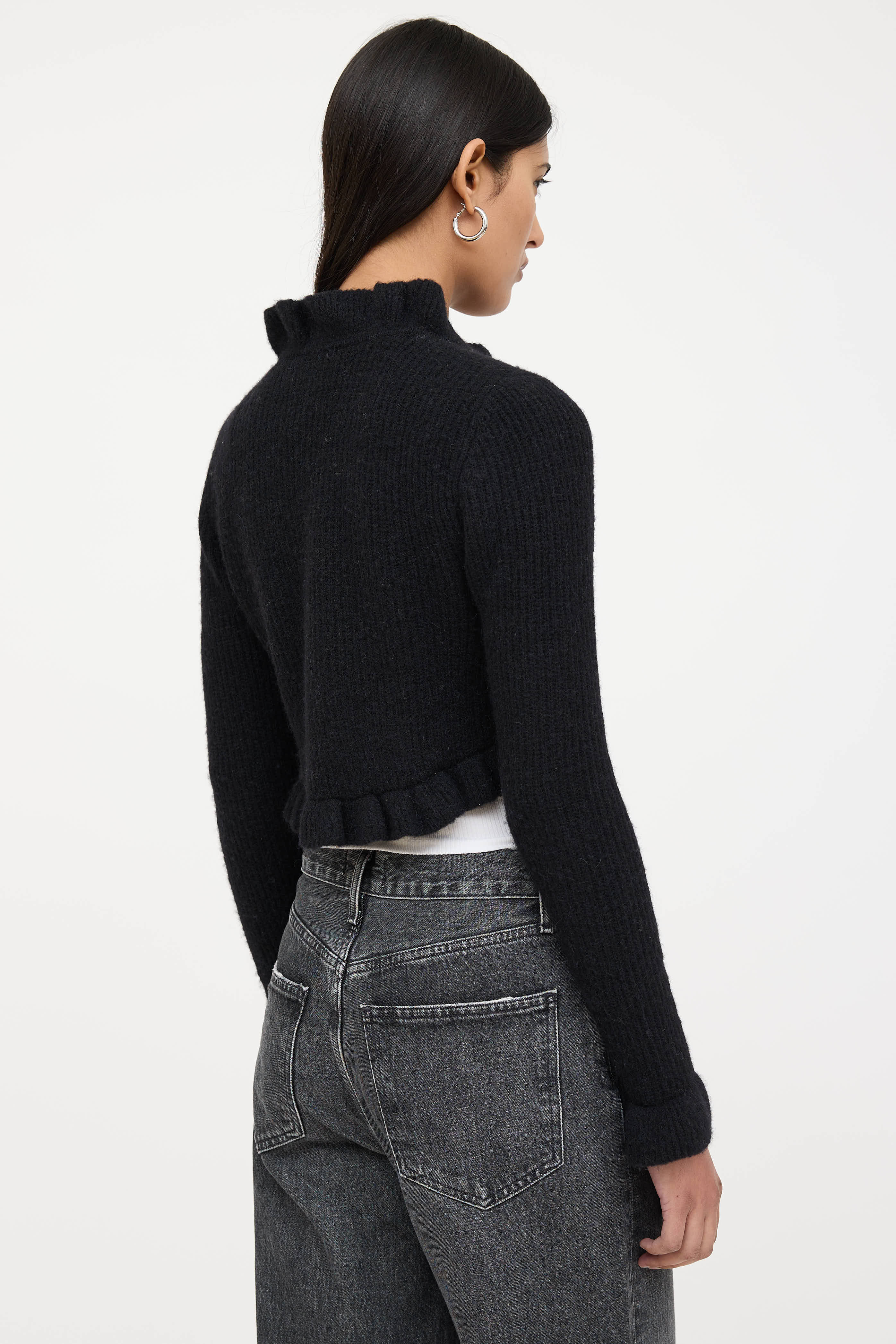 Pre-owned Ganni black wool knit cardigan featuring a ruffled V-neckline, long sleeves, cropped fit, and tie closure.