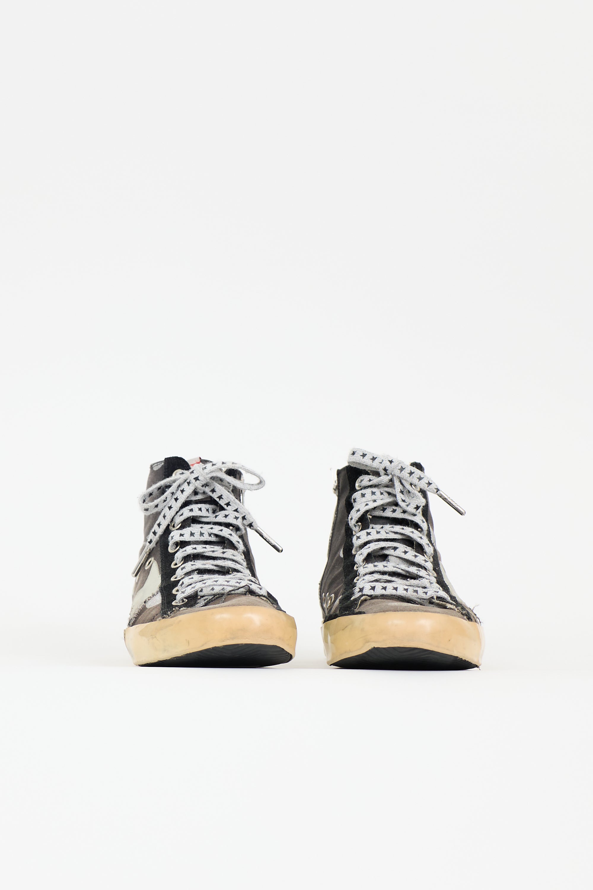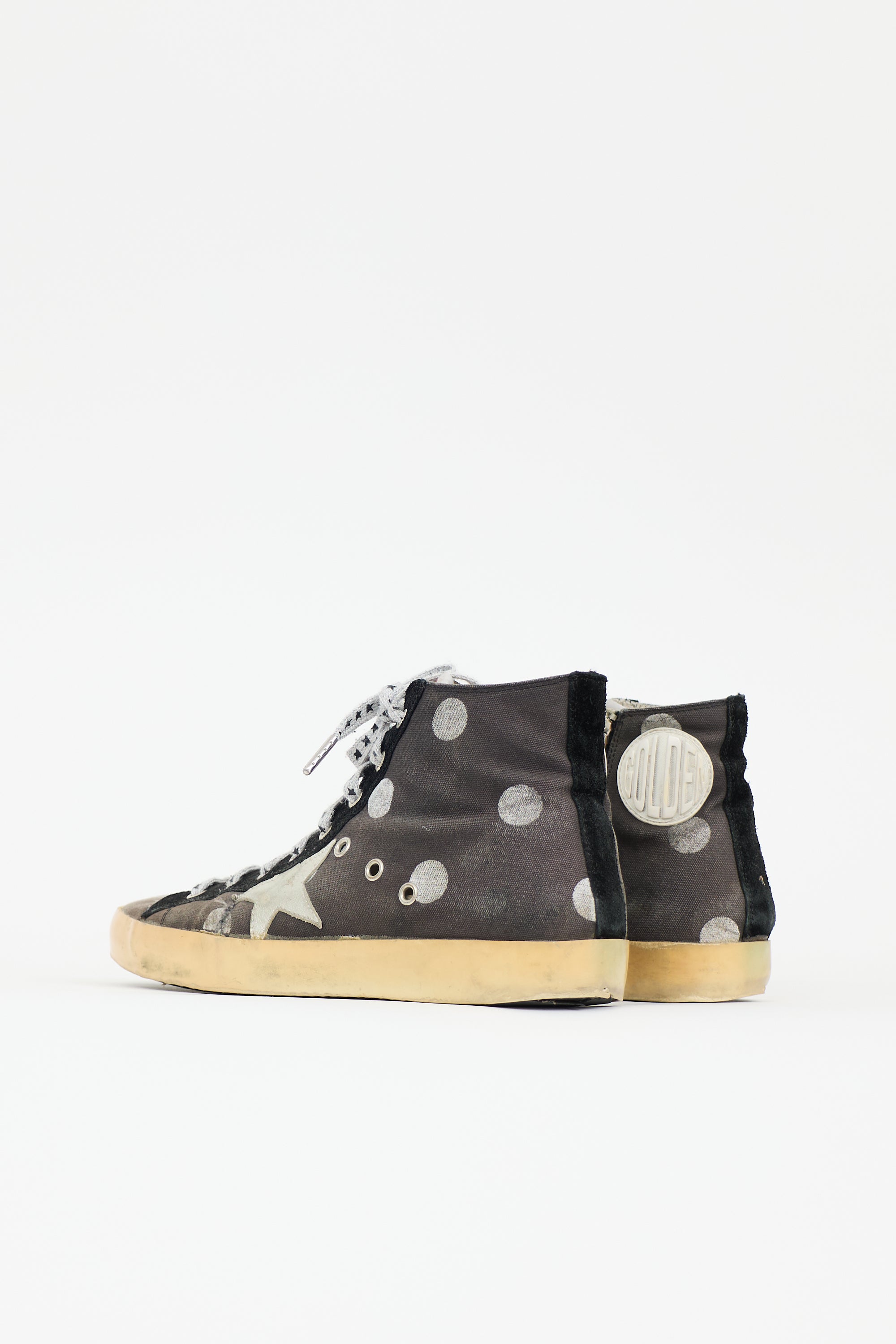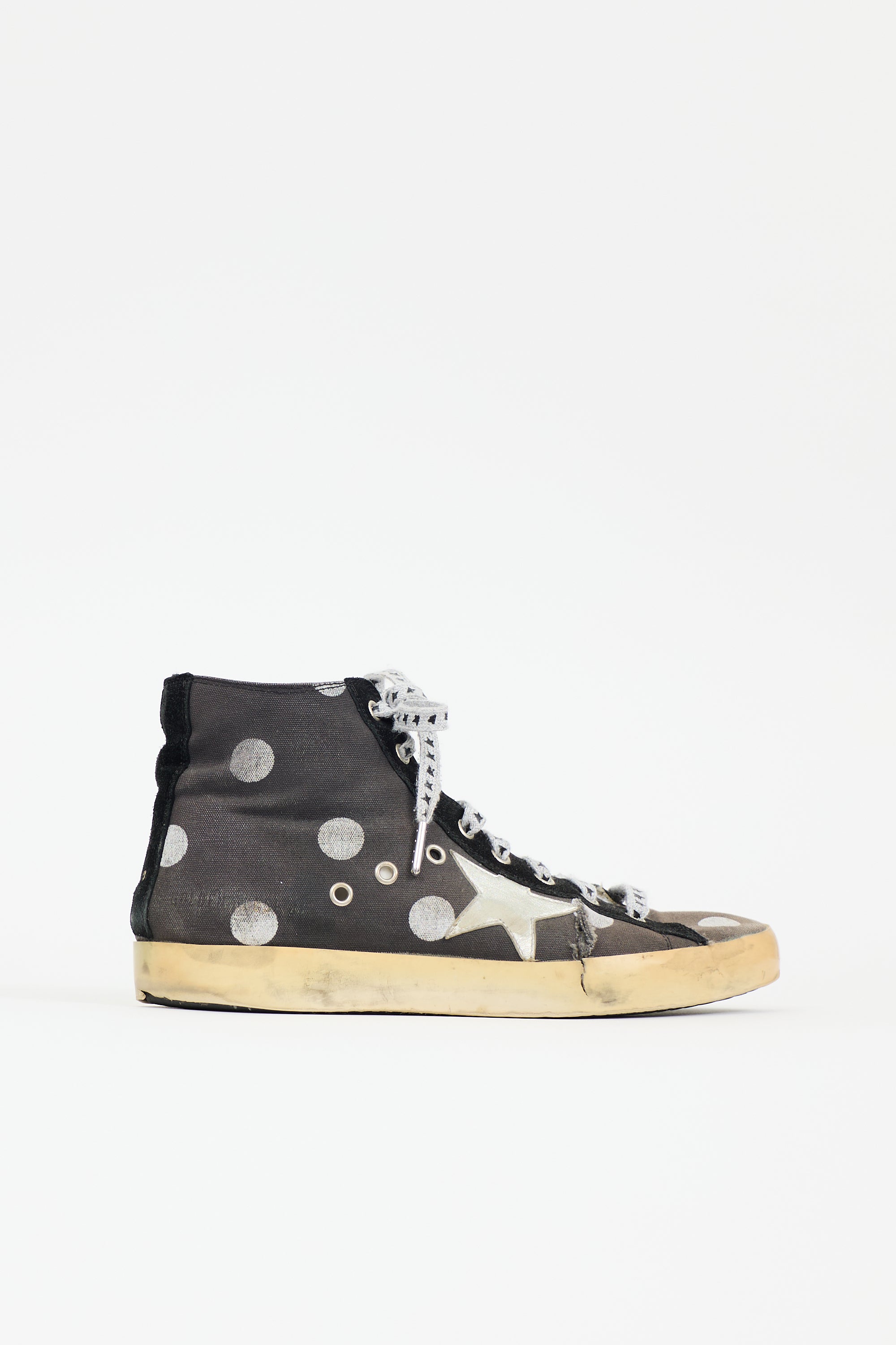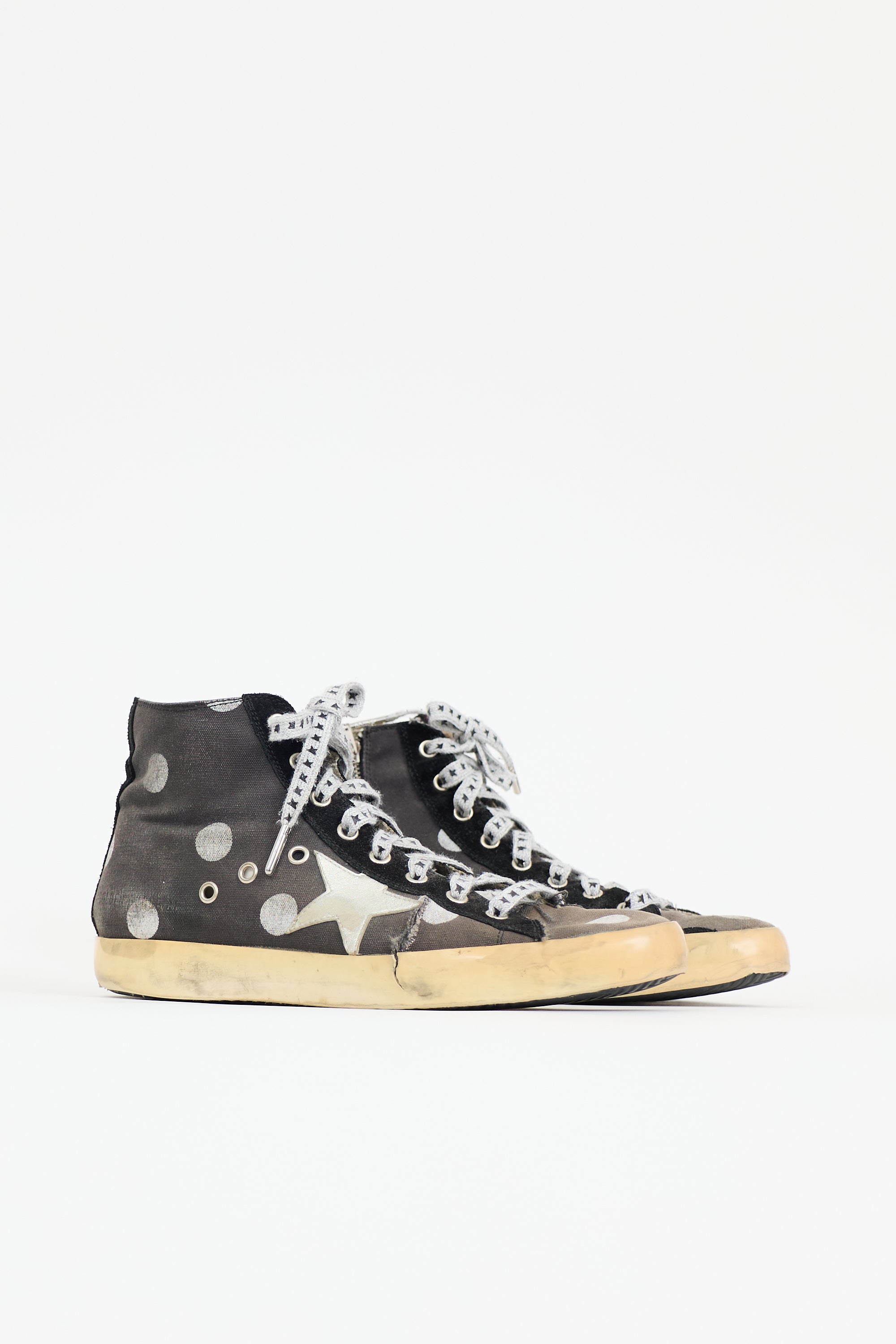 Pre-owned Golden Goose dark grey and silver Francy sneakers featuring rounded toe, purposeful distressing, lace up front, polkadot print, star patch, and zip closure at side.