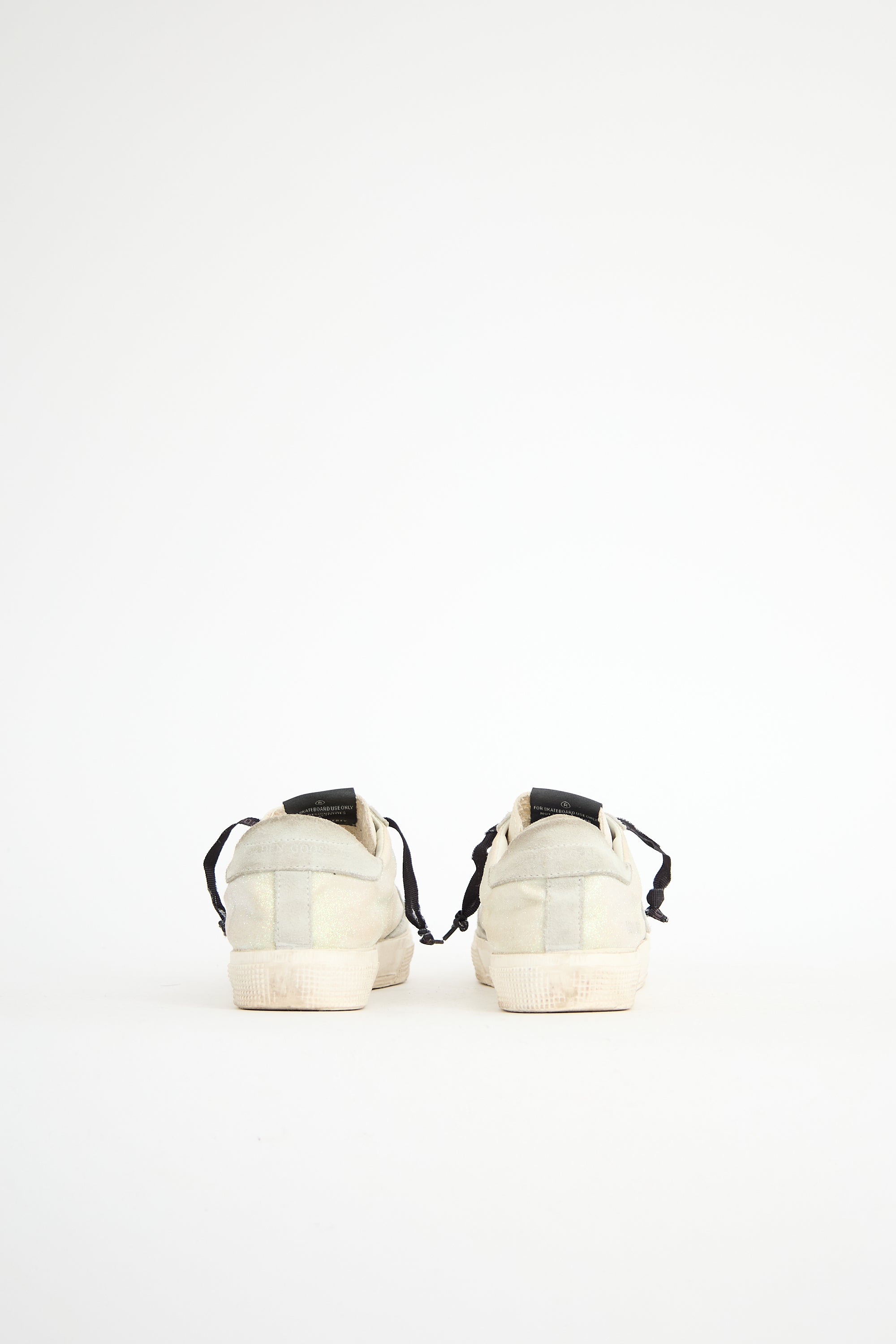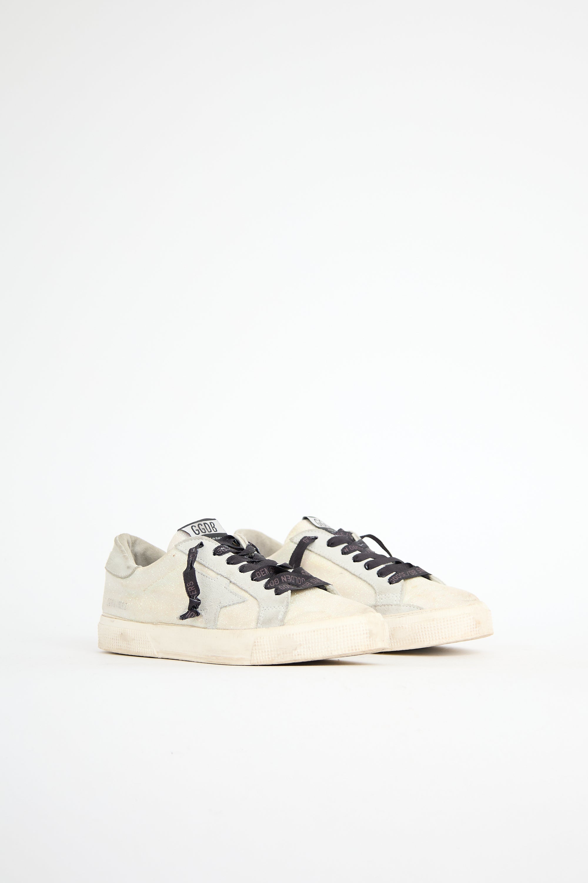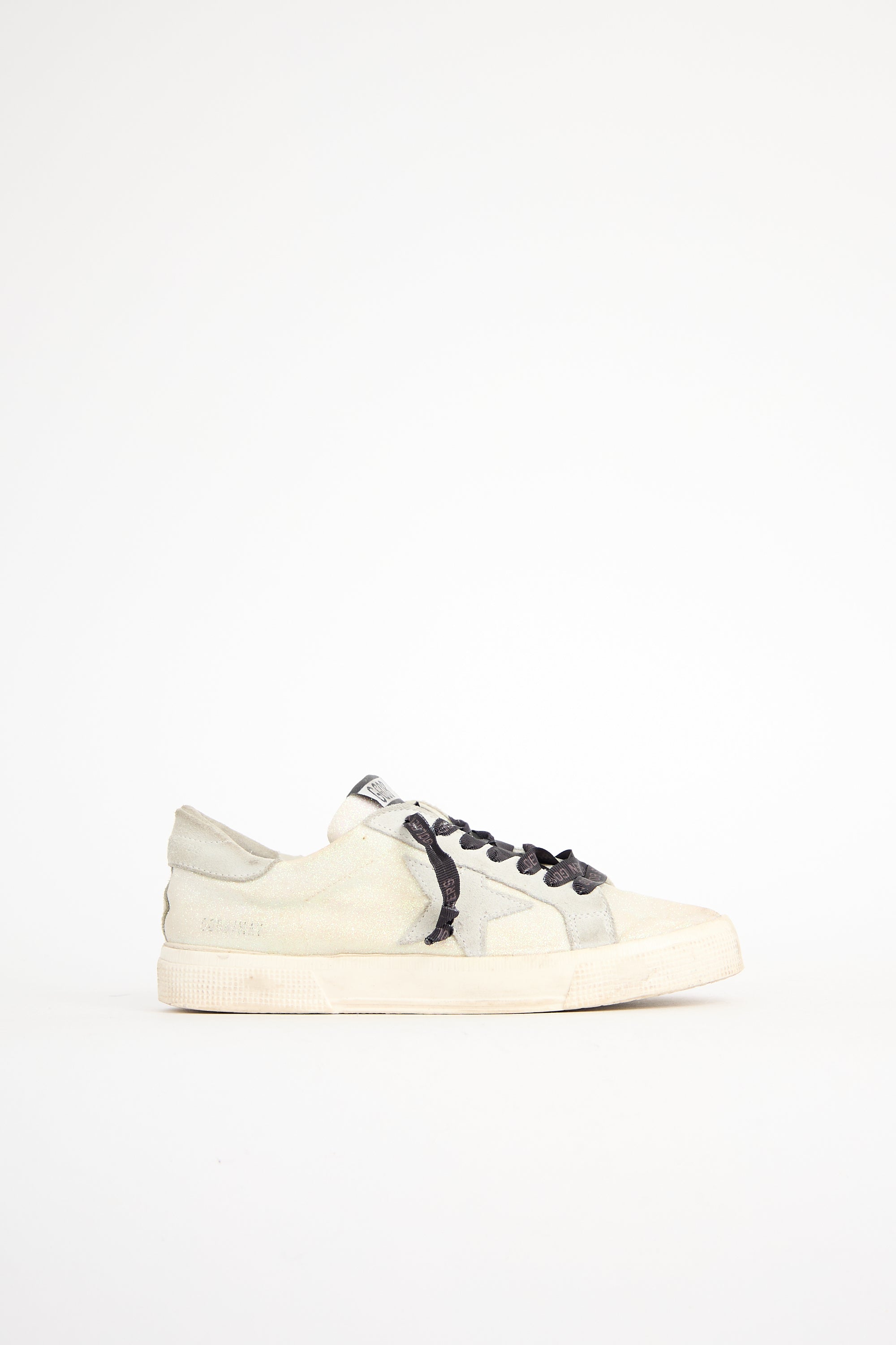 Pre-owned Golden Goose cream and grey May sneakers featuring rounded toe, glitter upper, logo lace up vamp, label at tongue, grey suede signature star patch and printed lettering at outer side, stamped logo at counter, rubber sole, and distressing.