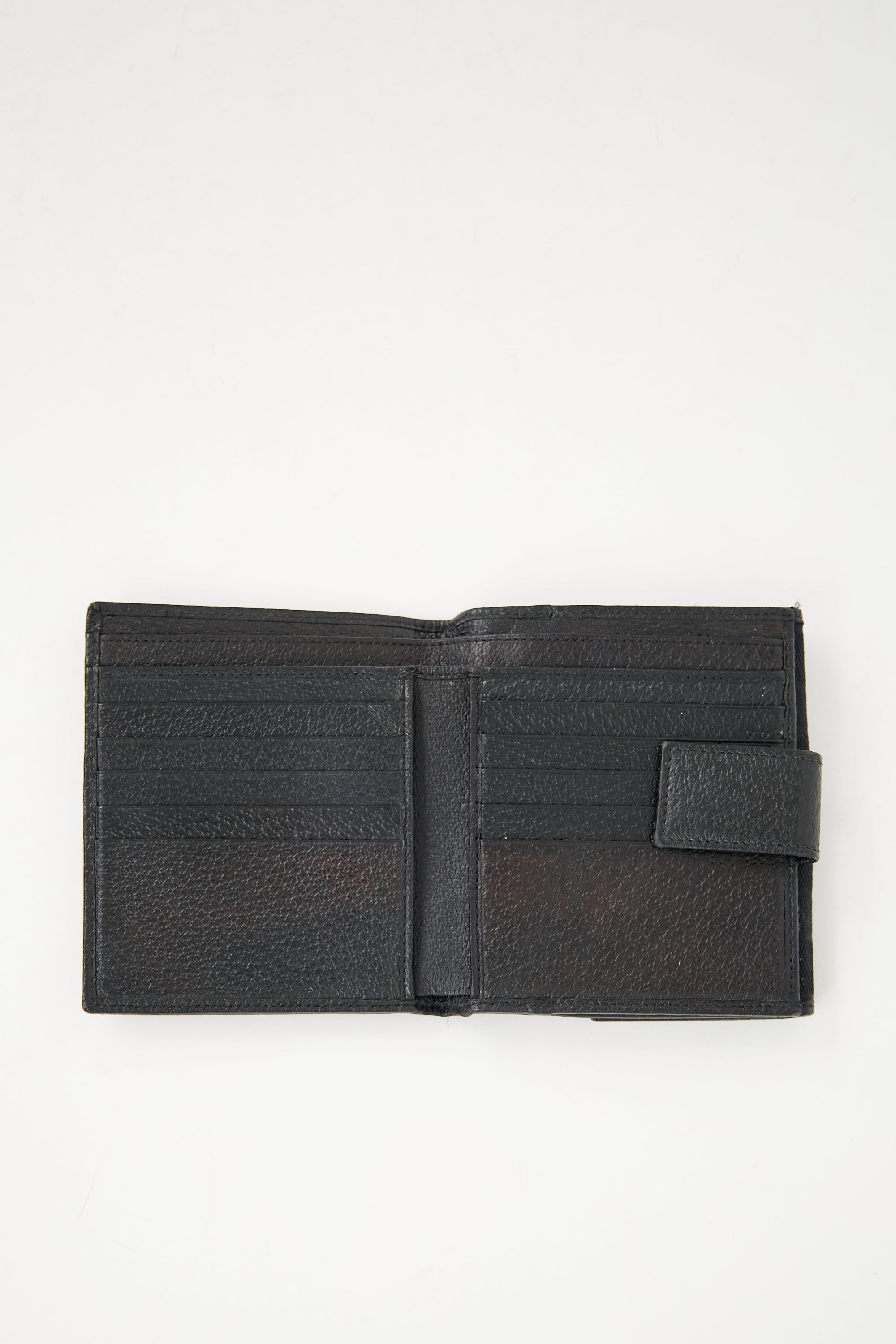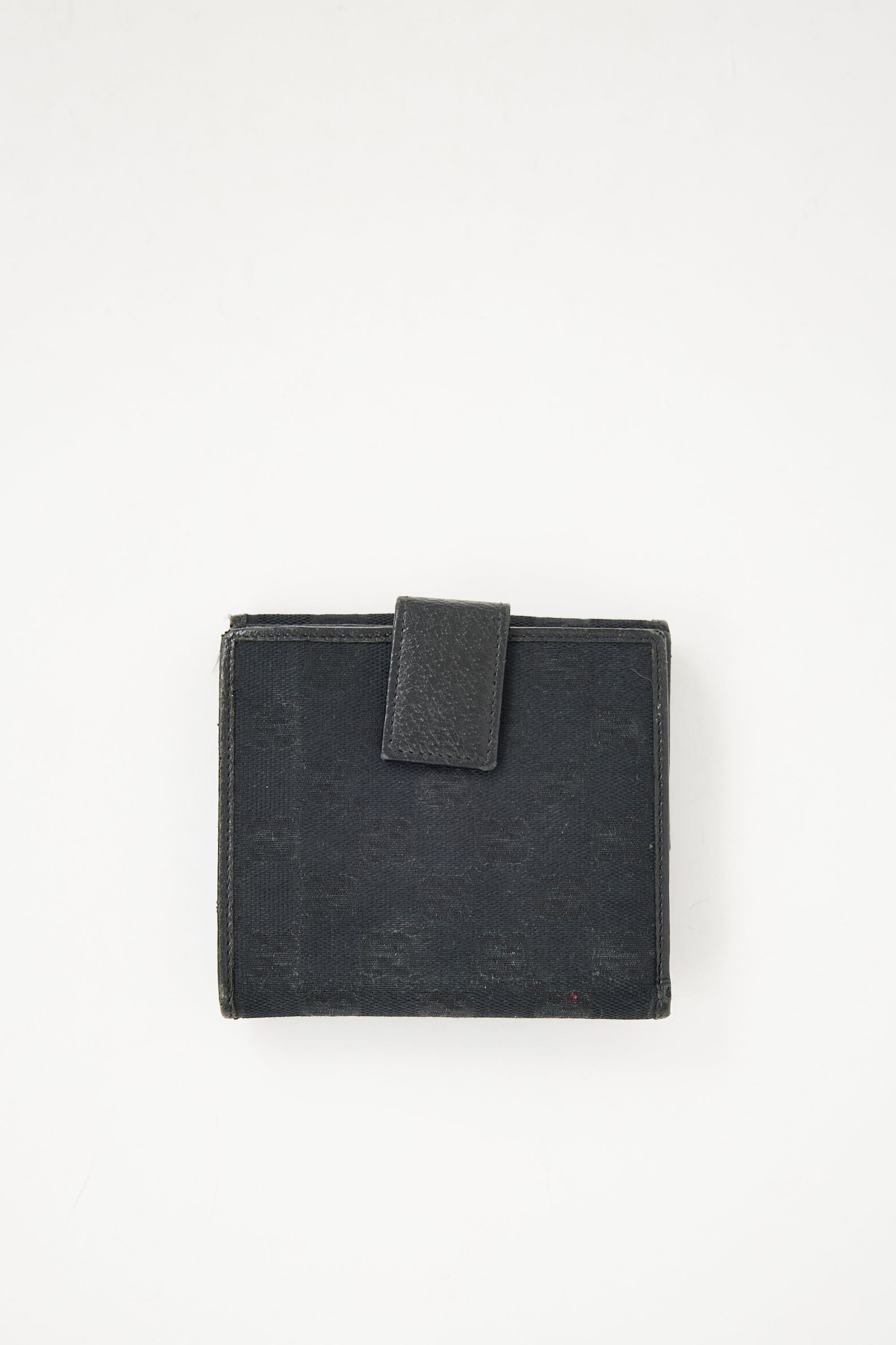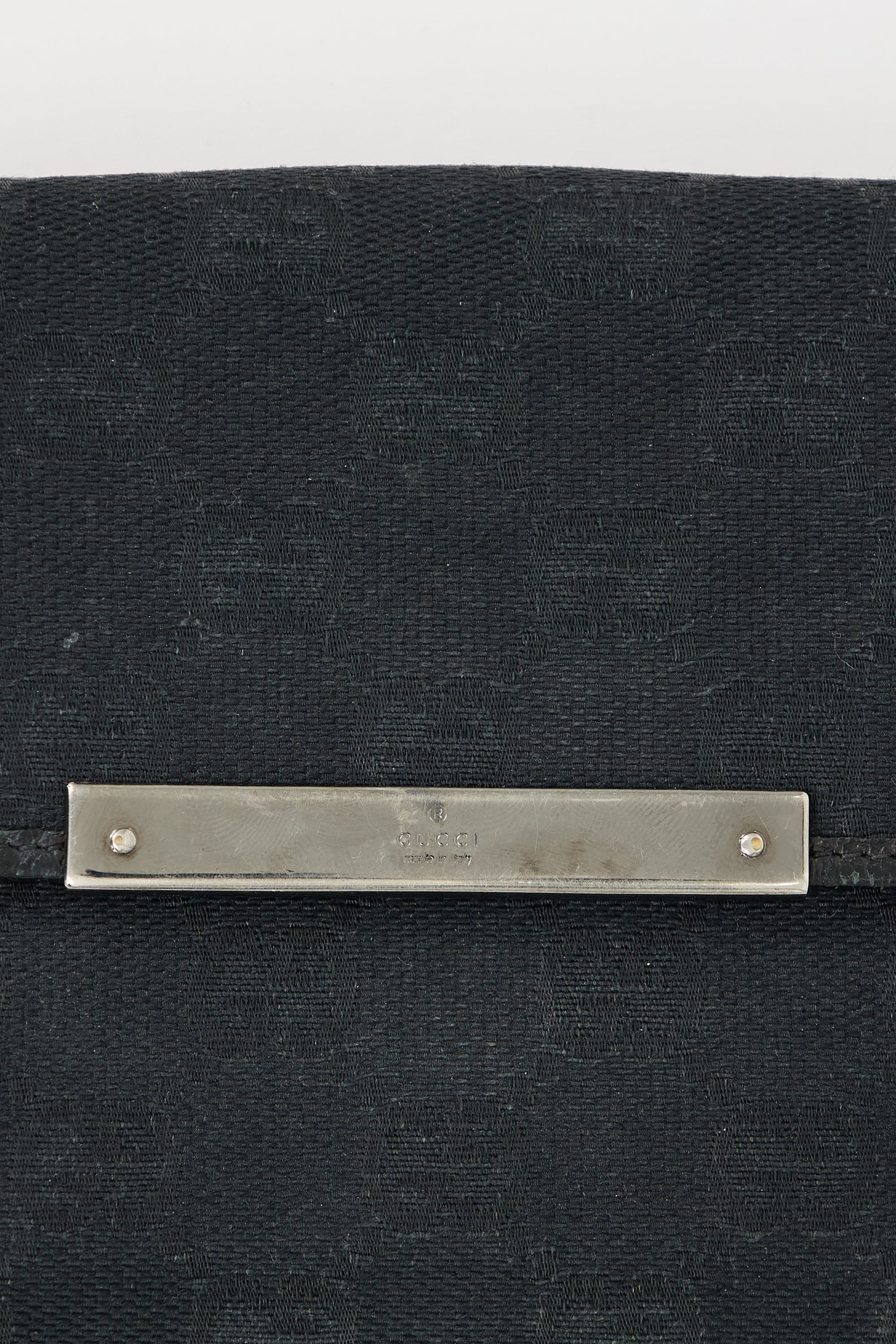 Pre-owned Gucci black canvas GG monogram wallet featuring silver tone hardware, leather trim, engraved logo at front, snap closure at main compartment and back fold, leather lined interior with ten card slots, and two slip pockets.