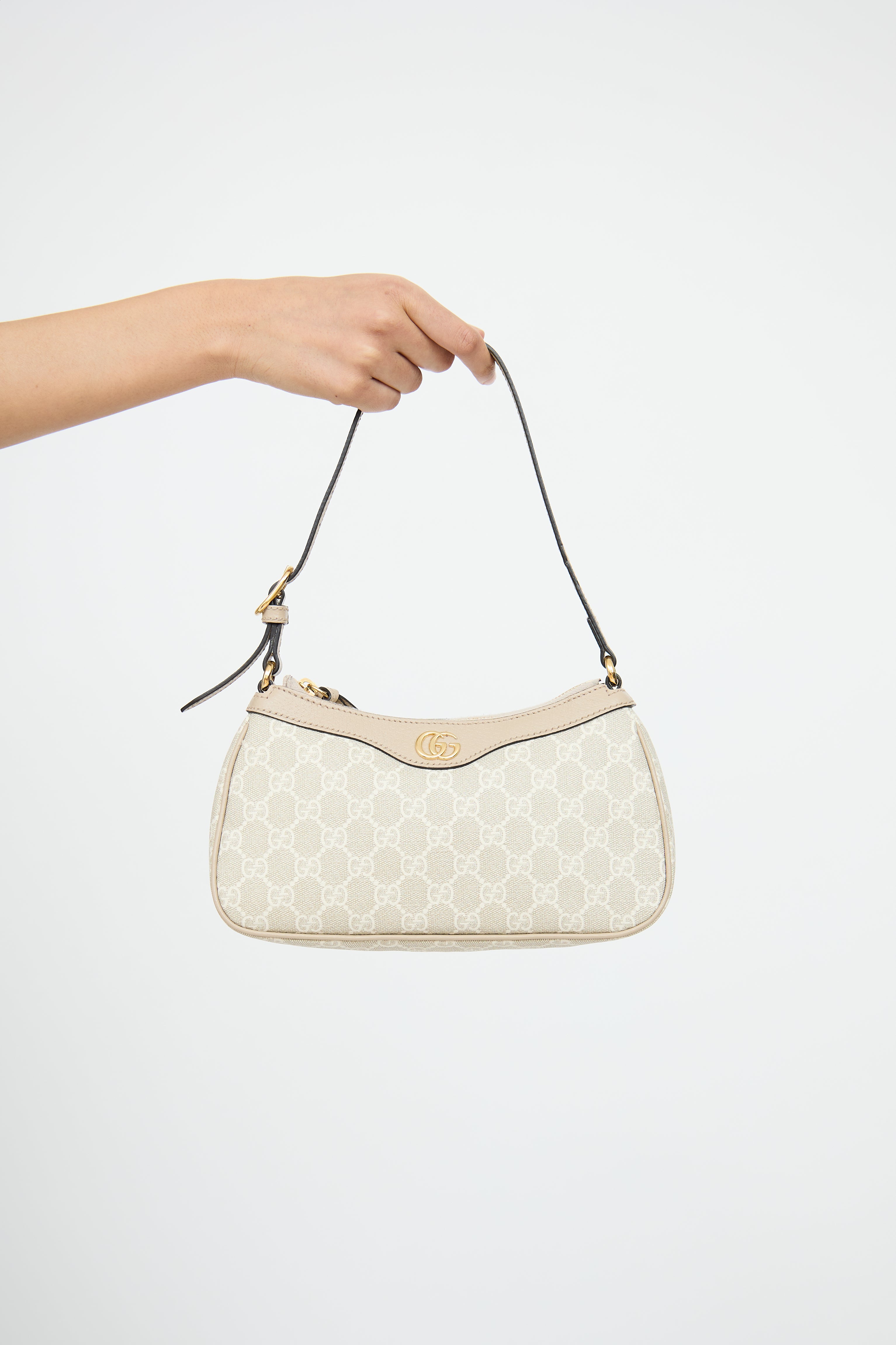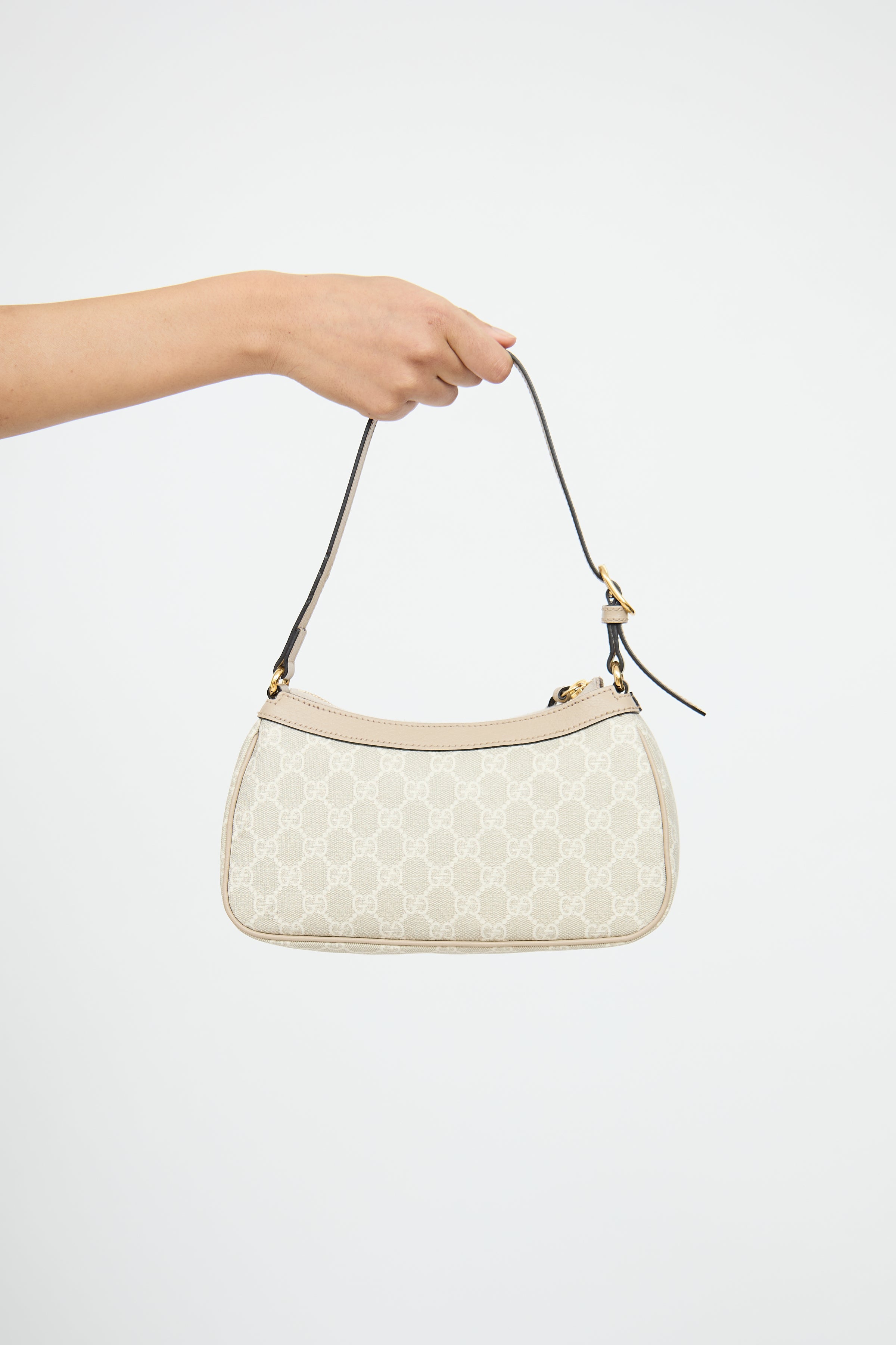 Pre-owned Gucci cream Supreme Ophidia bag featuring single flat adjustable shoulder strap, gold tone hardware, GG monogram throughout, rolled edge trim, GG logo plaque on front and zip closure top with tassel. Canvas lined main compartment and single slip pocket.