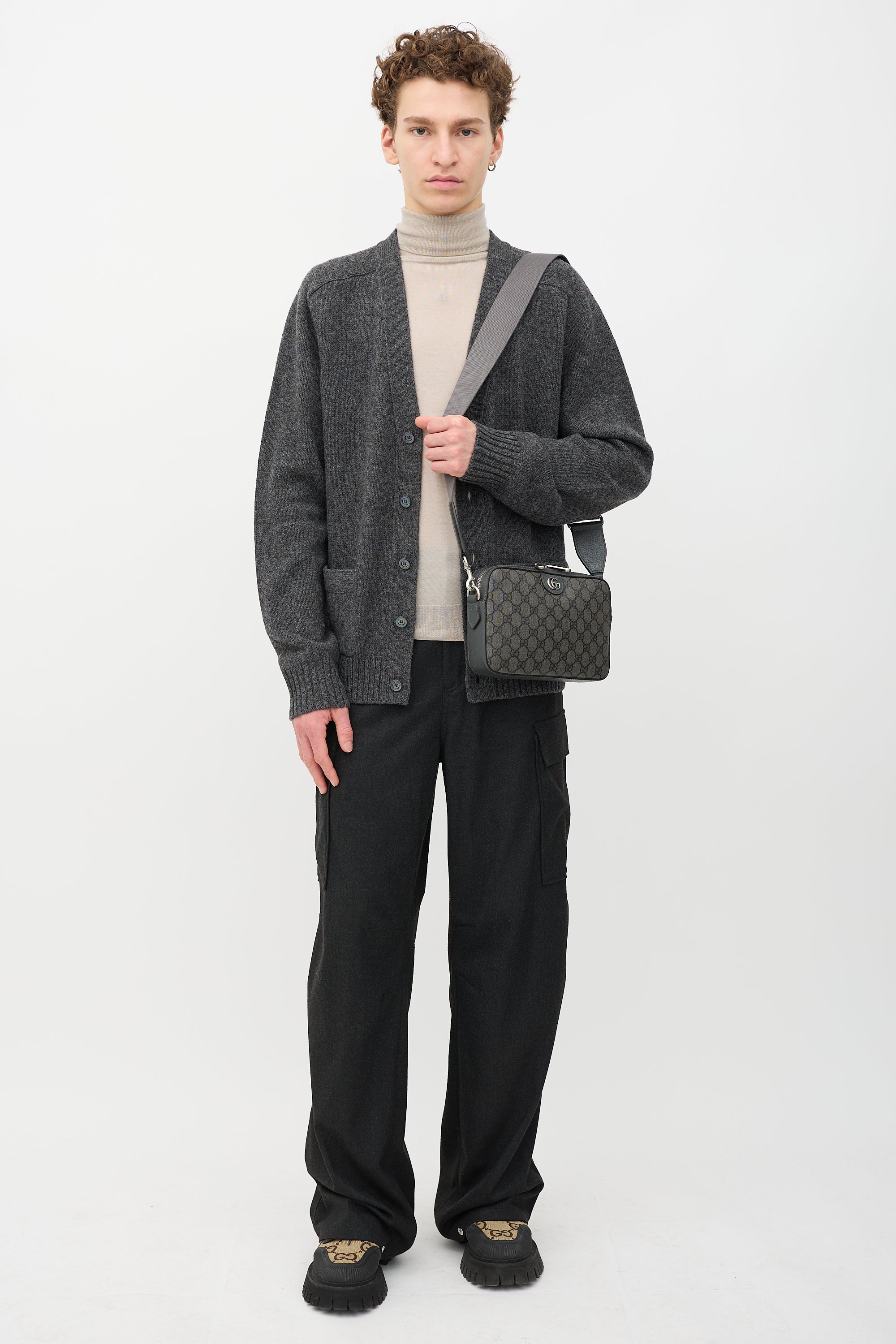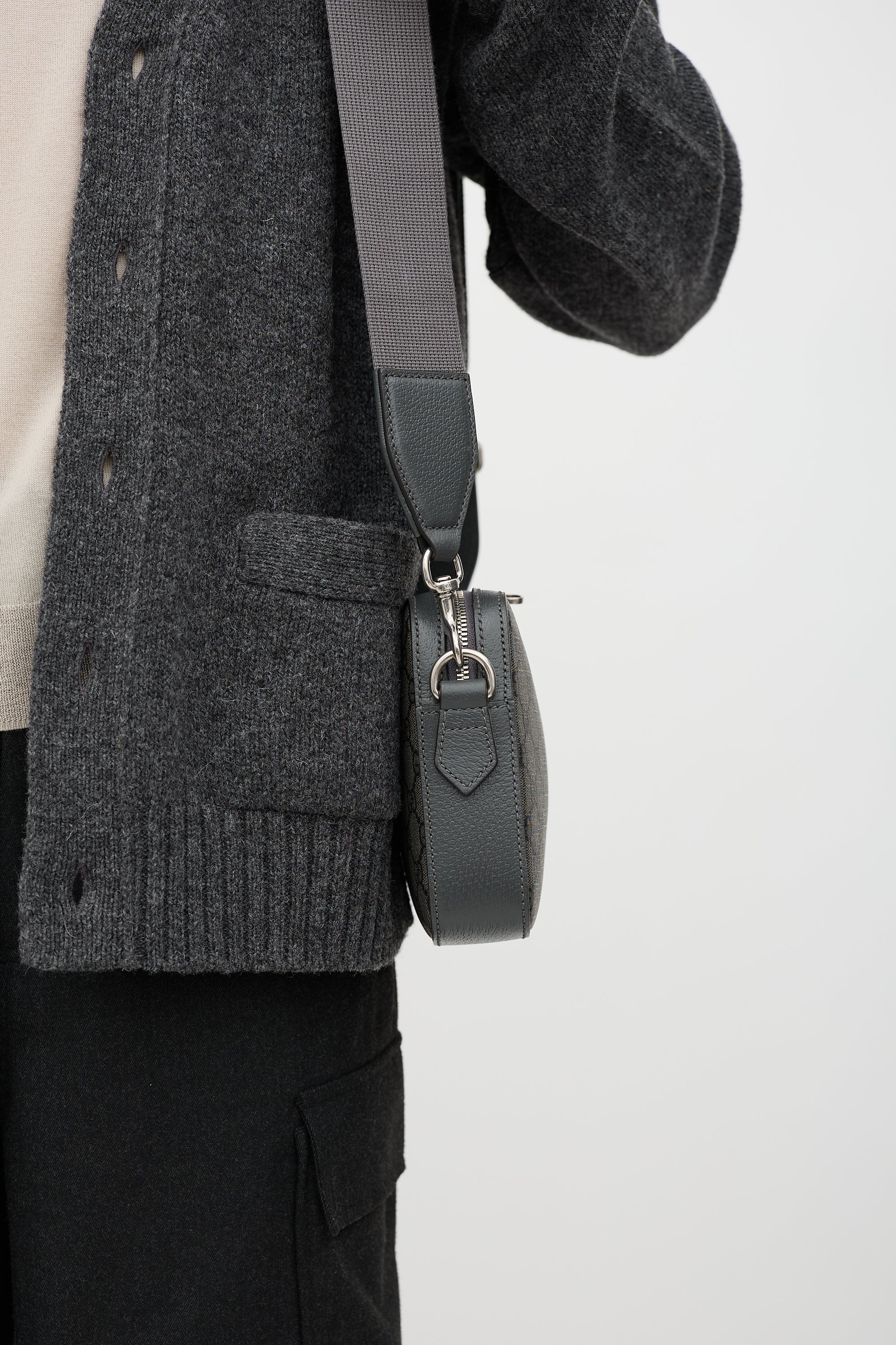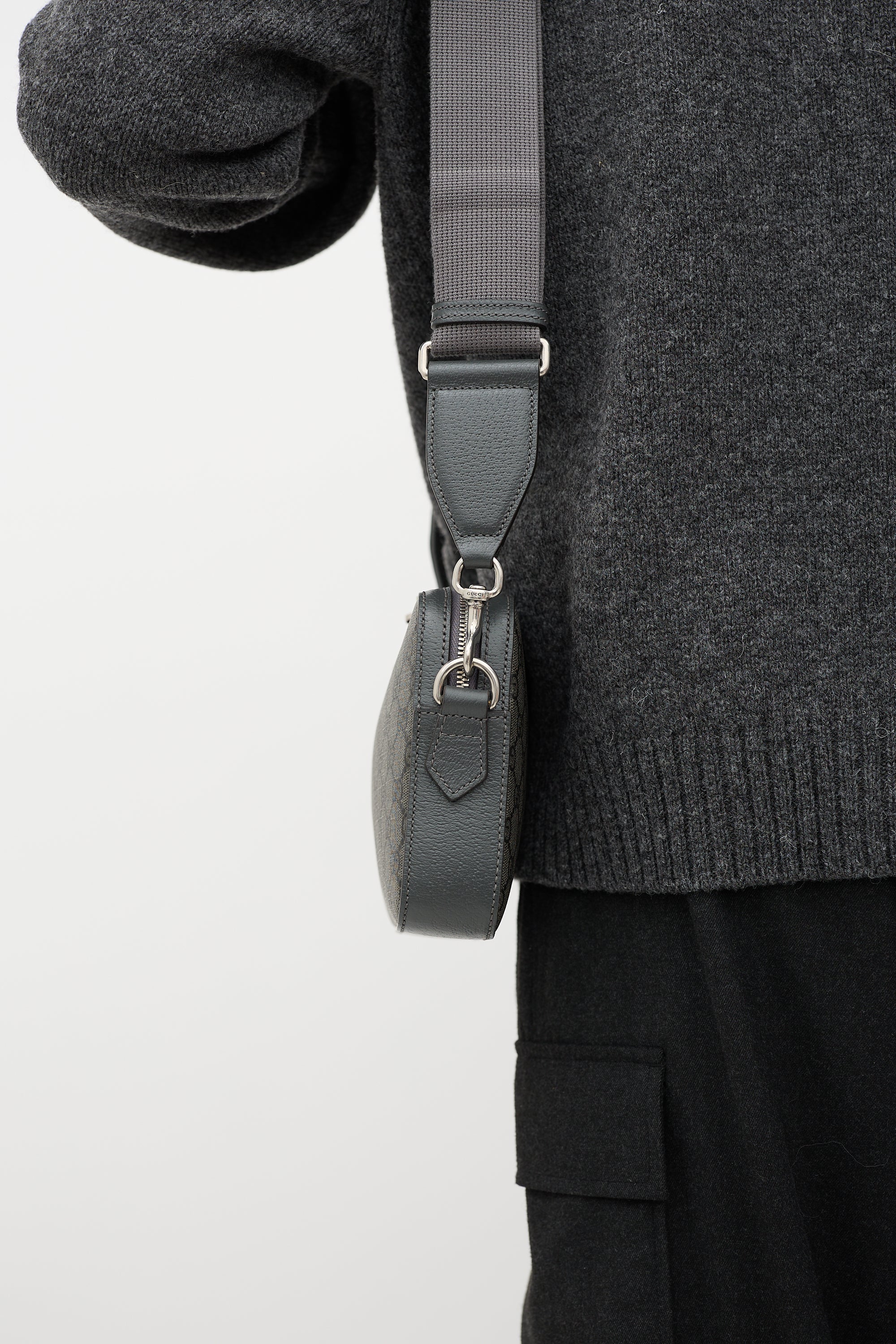Pre-owned Gucci grey GG Supreme Canvas Ophidia crossbody bag featuring tonal leather panels, silver tone hardware, GG embellishment at top front, adjustable and removable shoulder strap, removable wrist strap, top zip closure, and one lined main compartment with one zip pocket. Comes with original care guide.