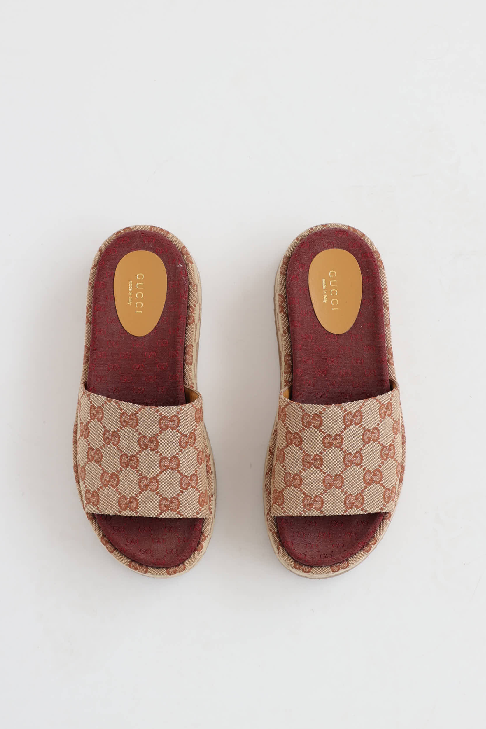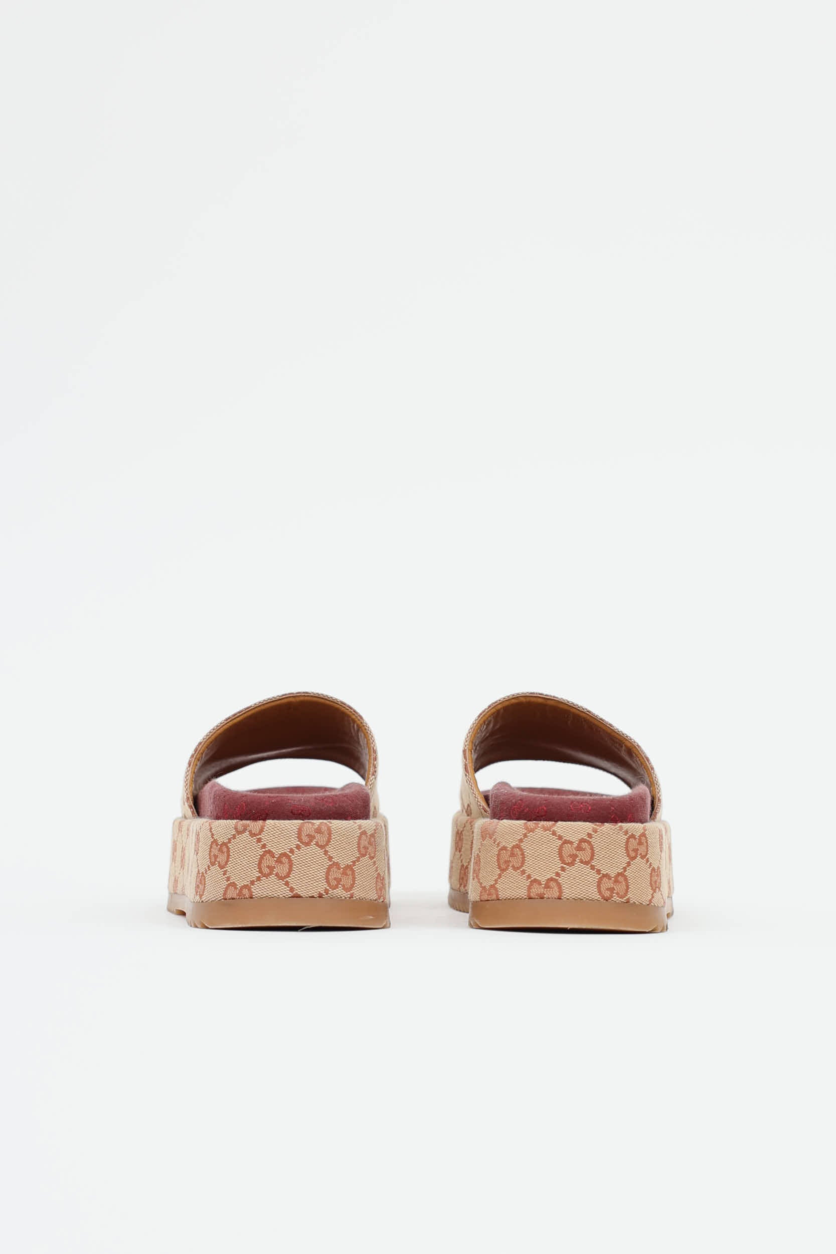 Pre-owned Gucci beige sandals in GG supreme monogram canvas featuring an open round toe, strap at vamp, and platform sole.