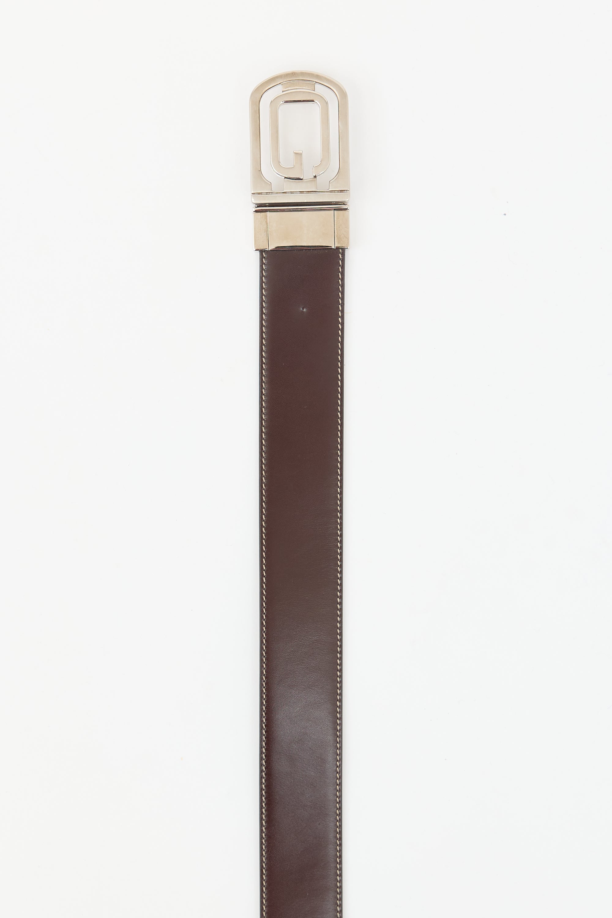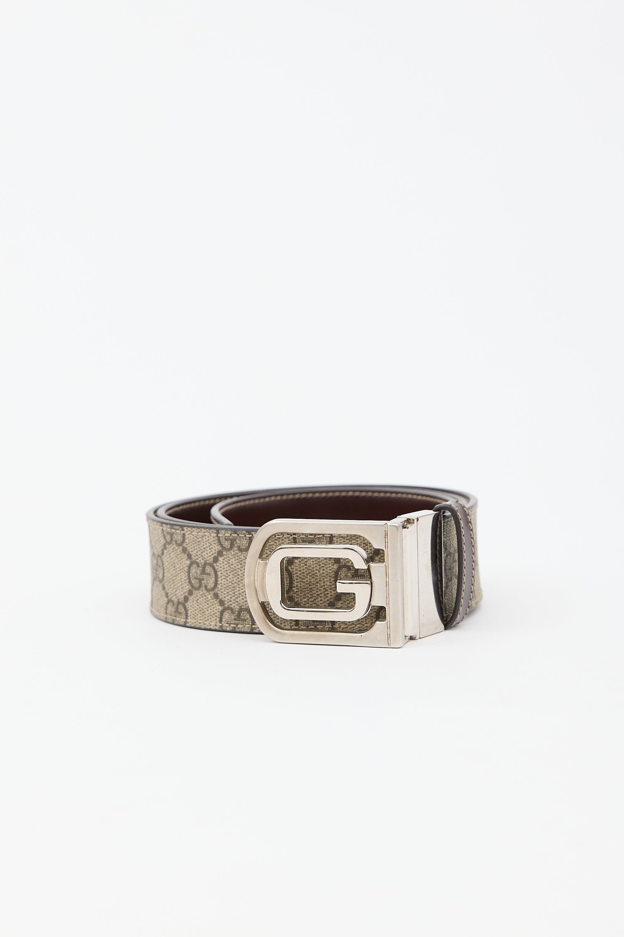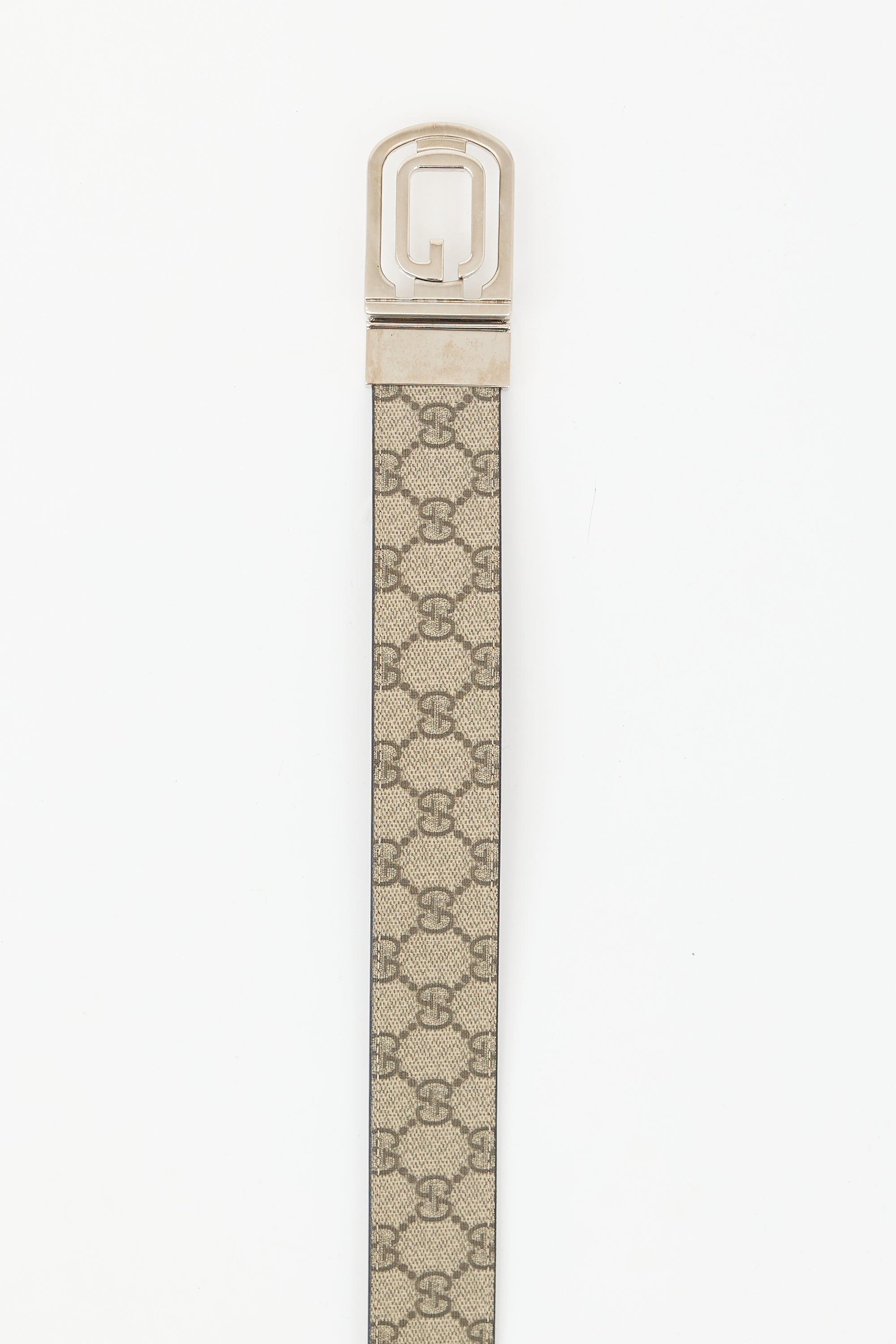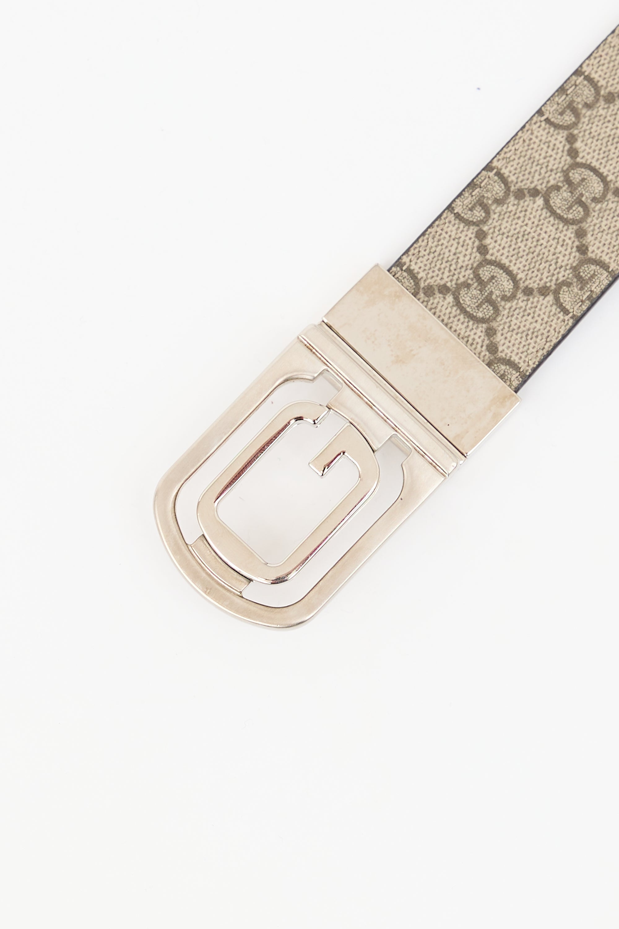 Pre-owned Gucci brown reversible belt featuring silver tone G rotating buckle, Monogram GG Supreme at one side, brown leather with contrast stitching at other, and push pin closure. Includes original dust bag.