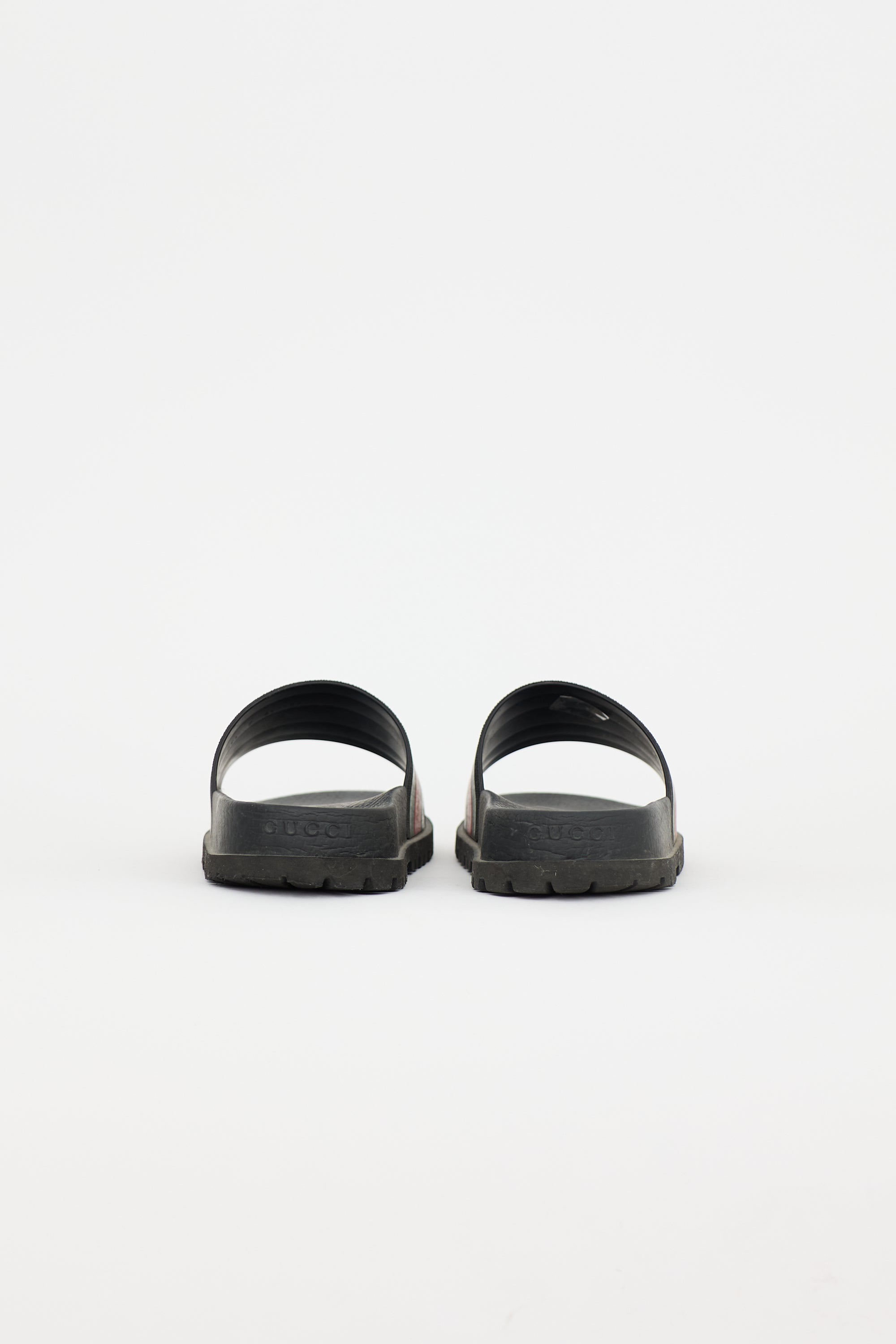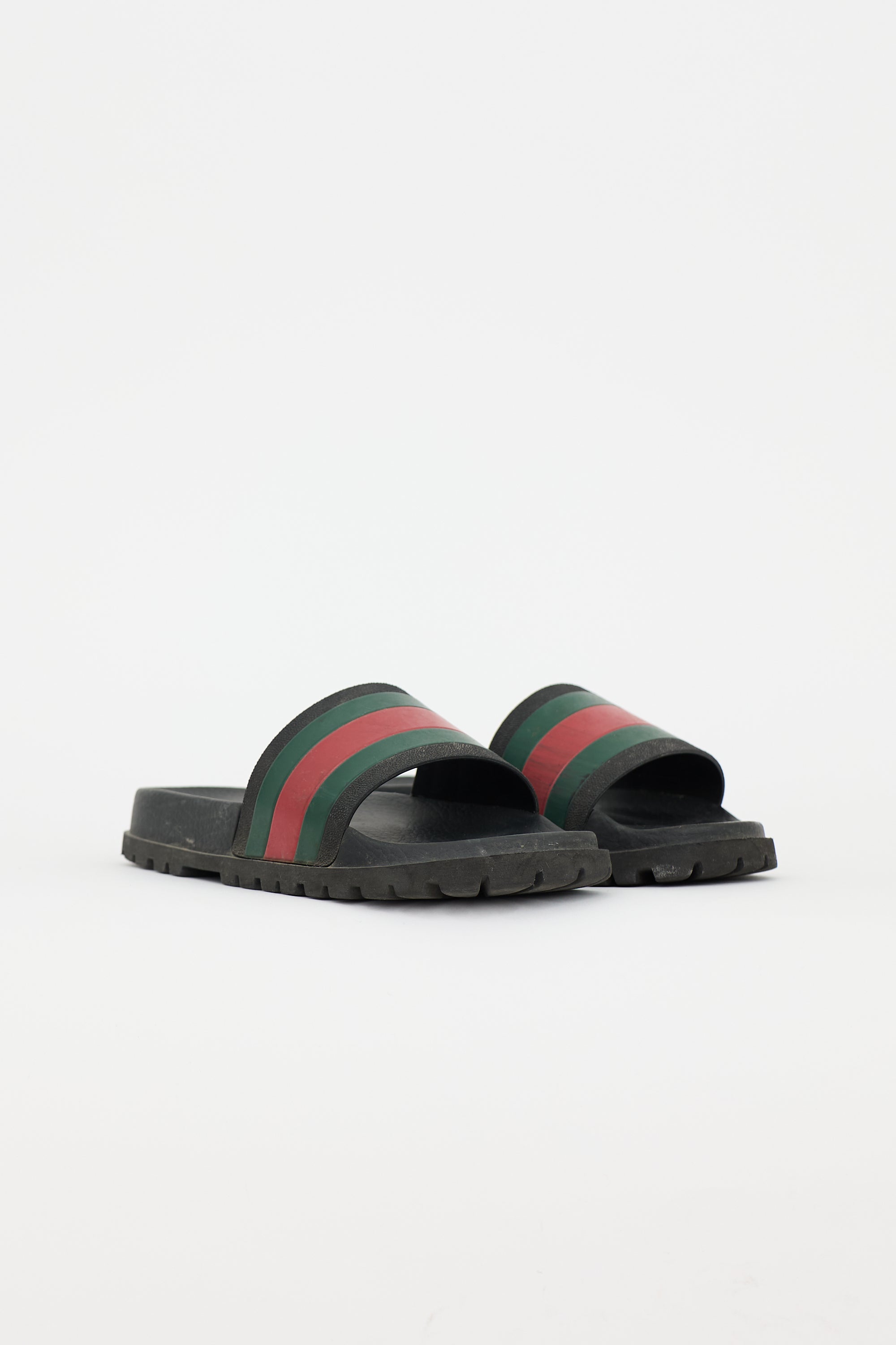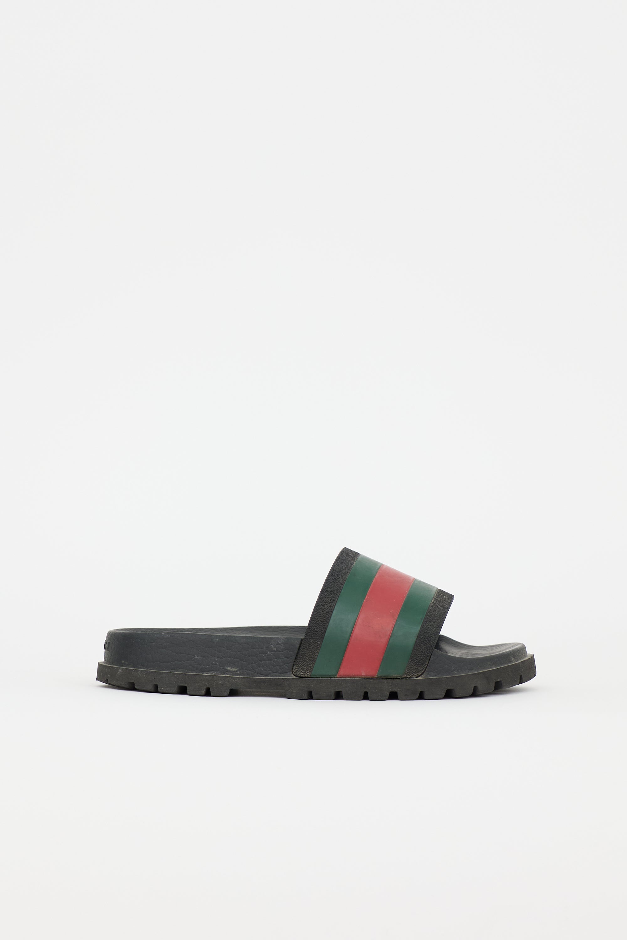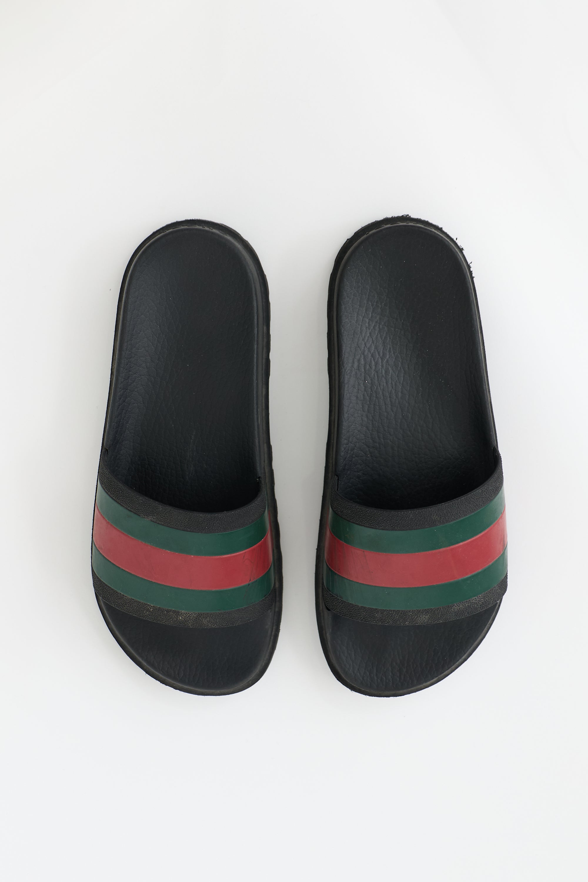 Pre-owned Gucci black rubber slides featuring rounded toe, green and red Web stripe design, embossed logo at counter, and treaded outsole.
