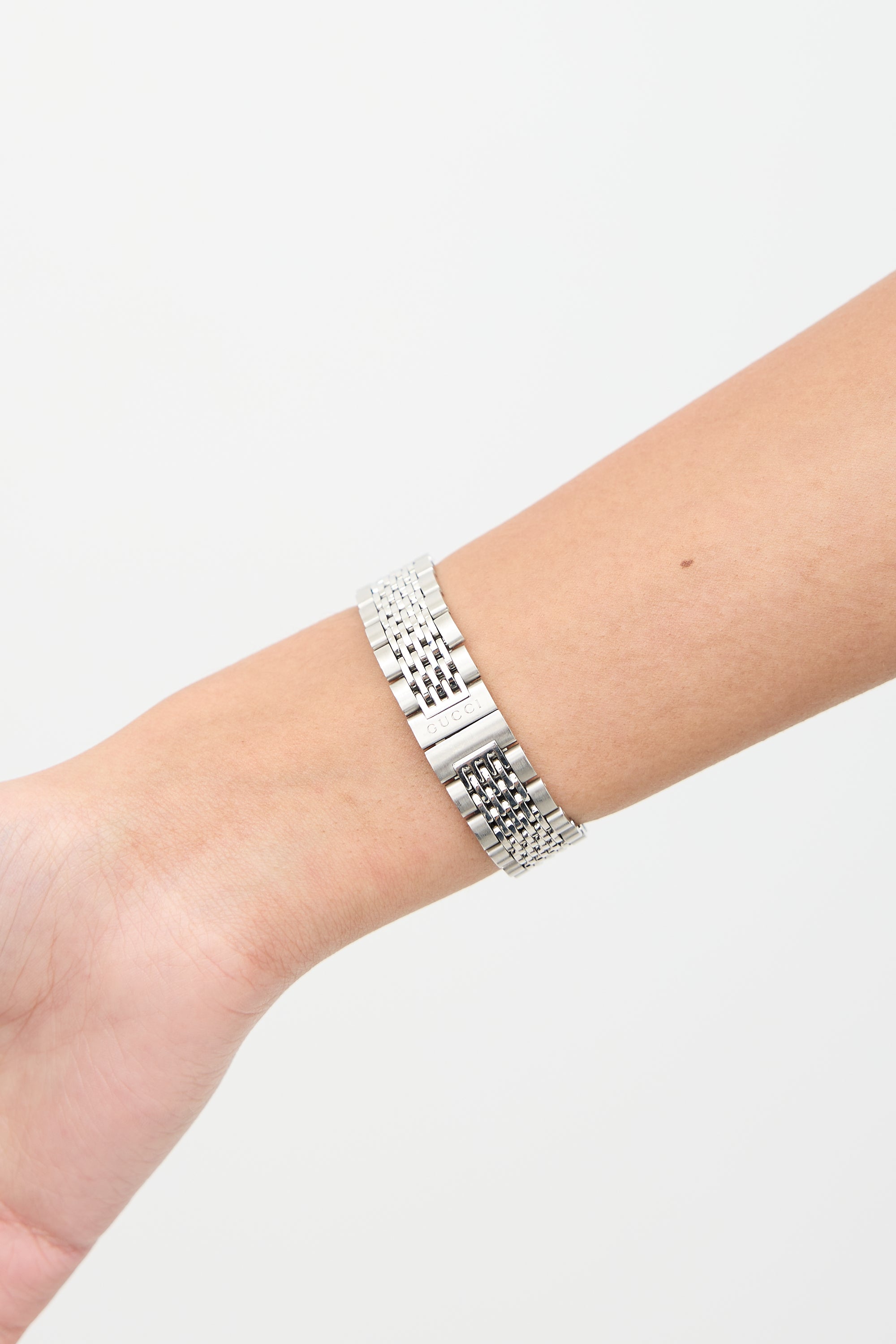 Pre-owned Gucci G-Timeless wristwatch featuring a 28mm wide stainless steel case, black dial with silver tone logos, hands, and hour markers, date display at 4 o'clock, and stainless steel band with deployment clasp. Comes with pouch.
