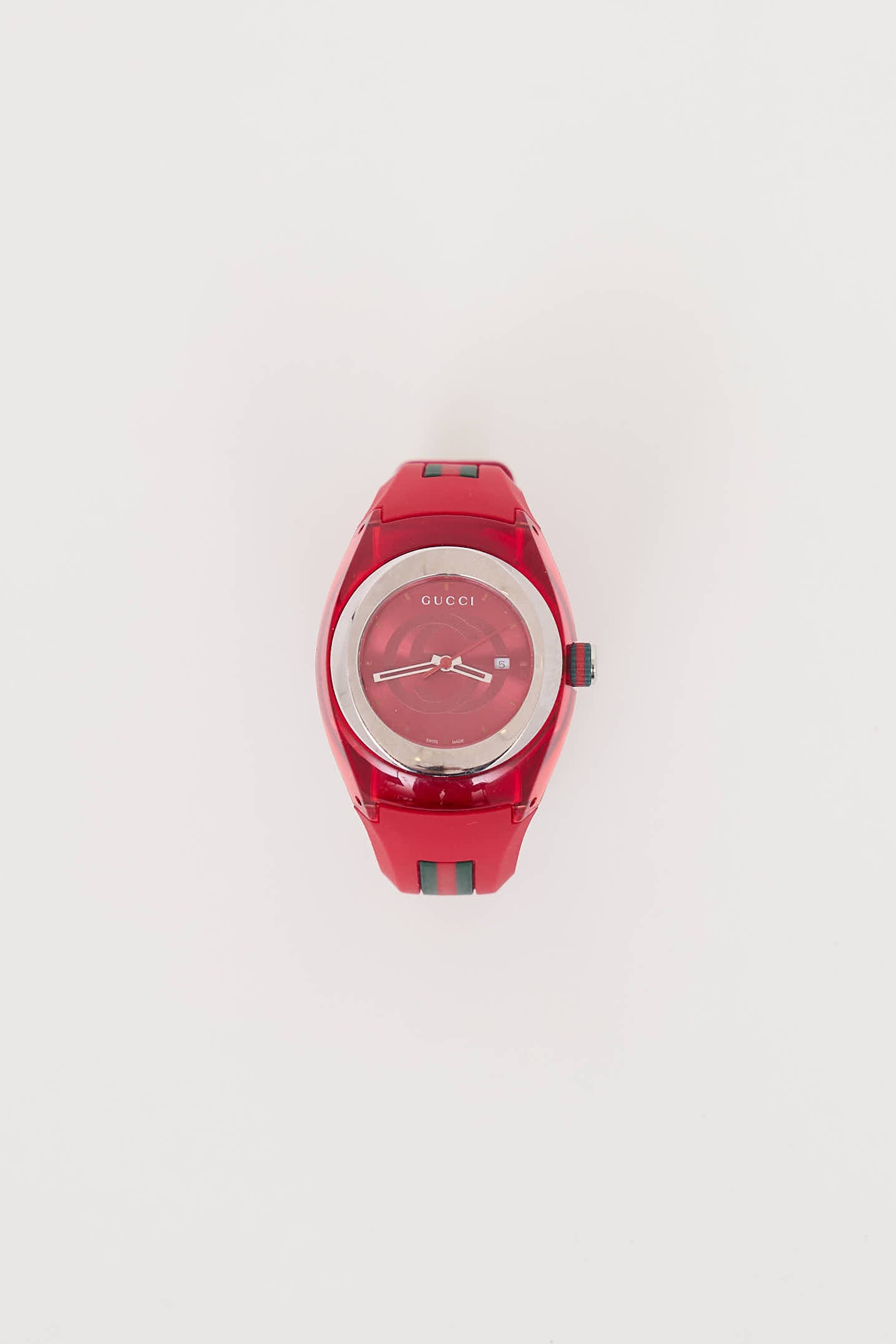 Pre-owned Gucci red Sync Web rubber watch featuring multicolour striped trim at sides, round bezel with silver tone trim, tonal face with GG logo detailing, quartz movement, date display, rubber bracelet, and buckle closure.