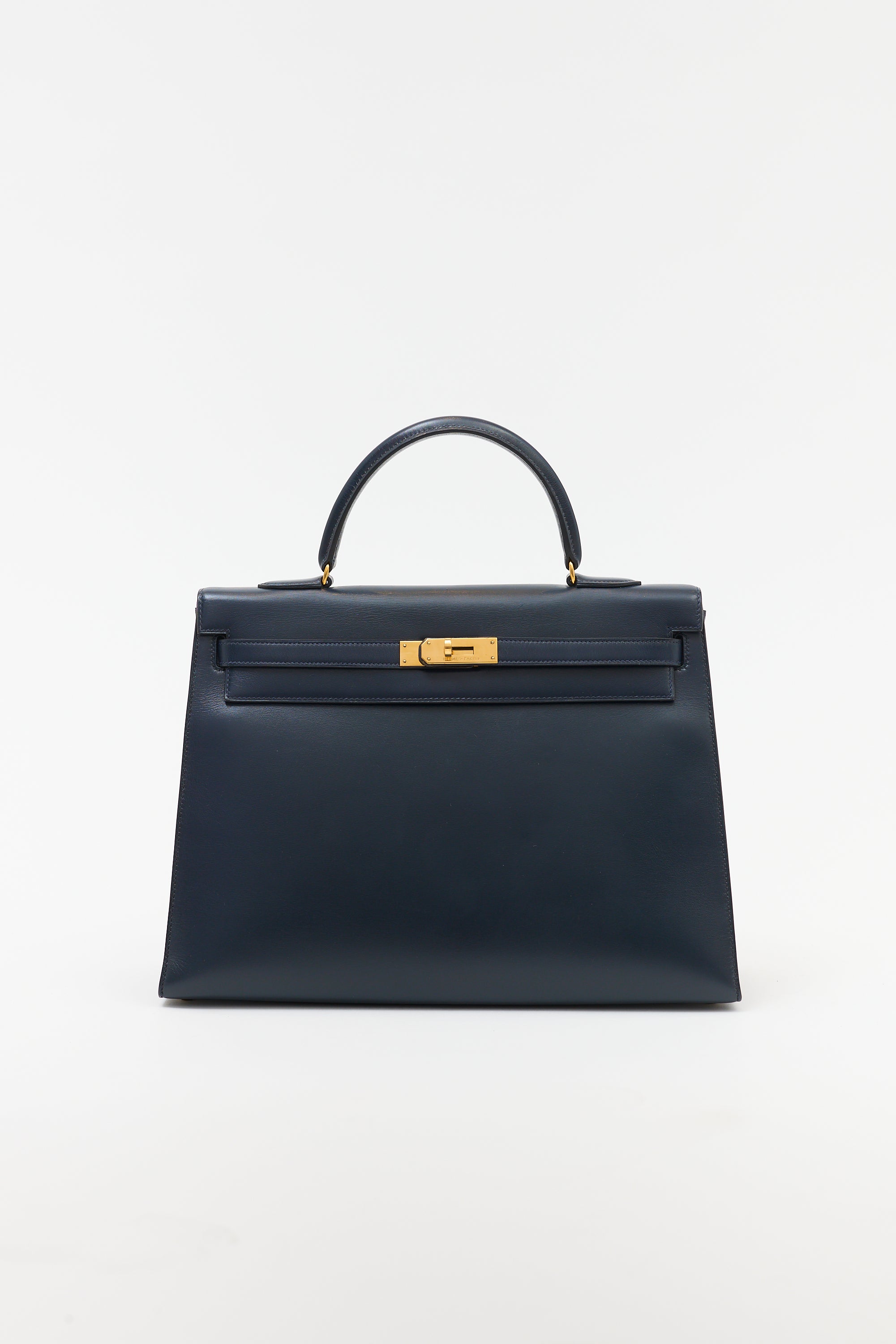 Pre-owned Hermès 1990 Kelly Sellier 35 bag in navy Box leather featuring single rolled top handle, gold plated hardware, gold stamped logo under flap, side belt detail, signature twist lock closure, logo engraved plaque, four clou, detachable webbed shoulder strap, and one main compartment with two slip pockets and one zip pocket.