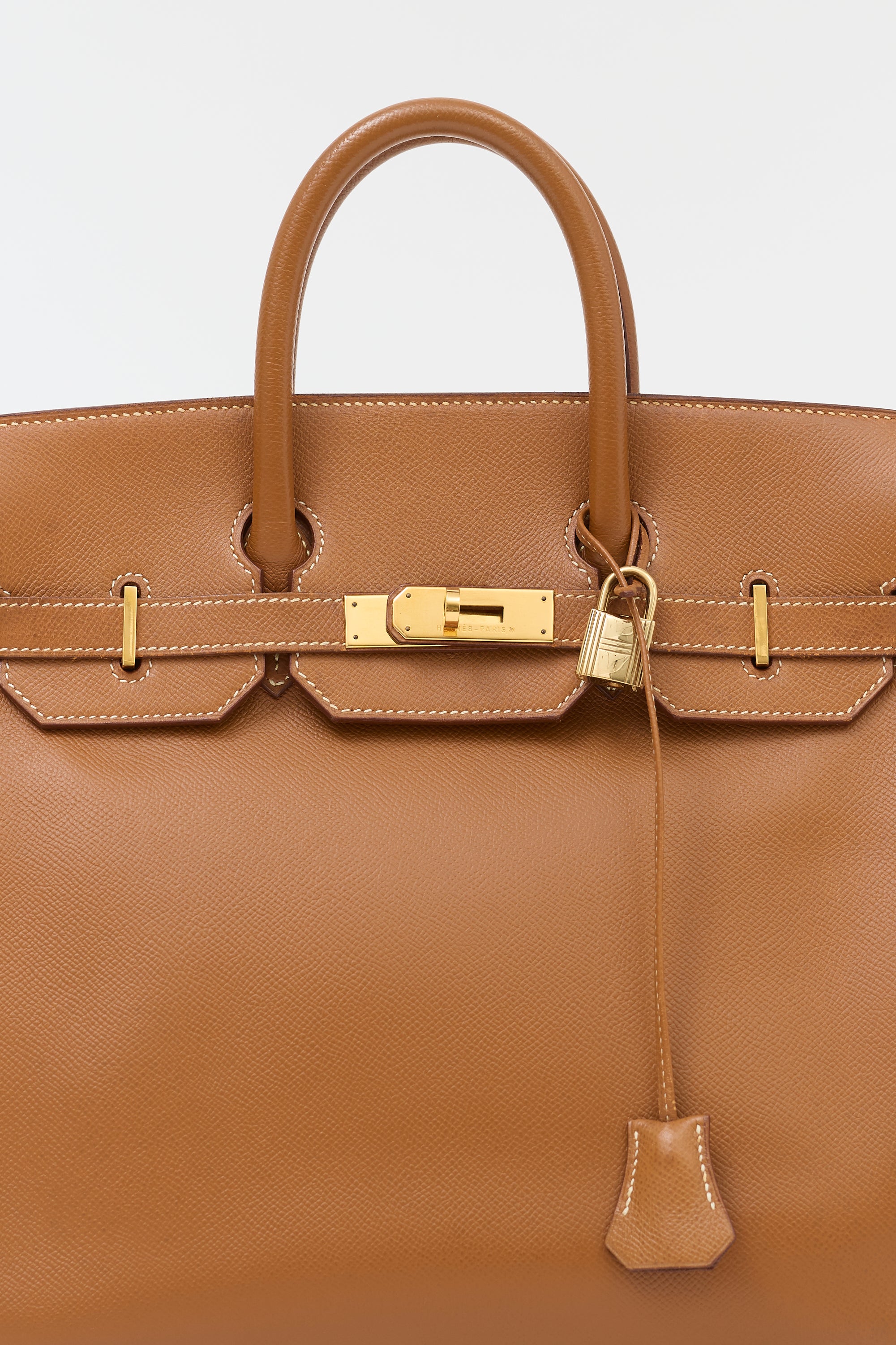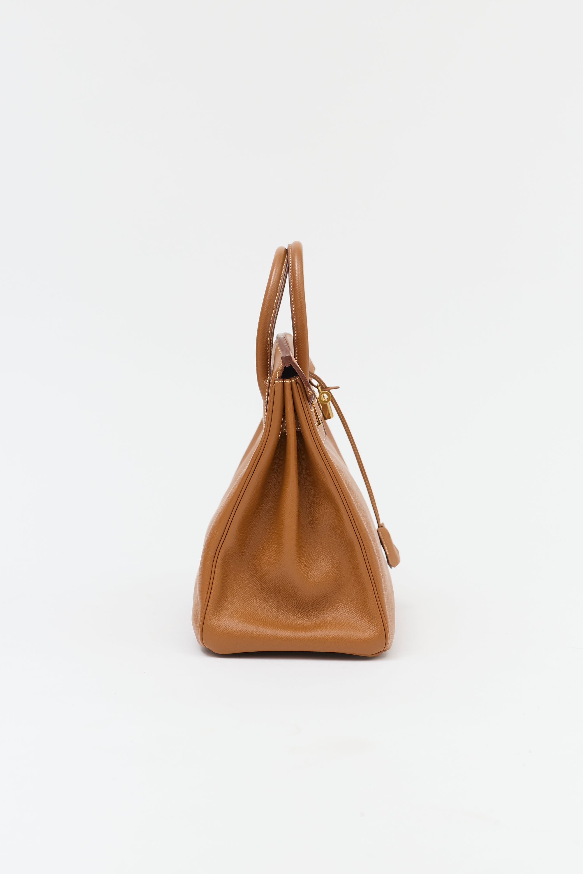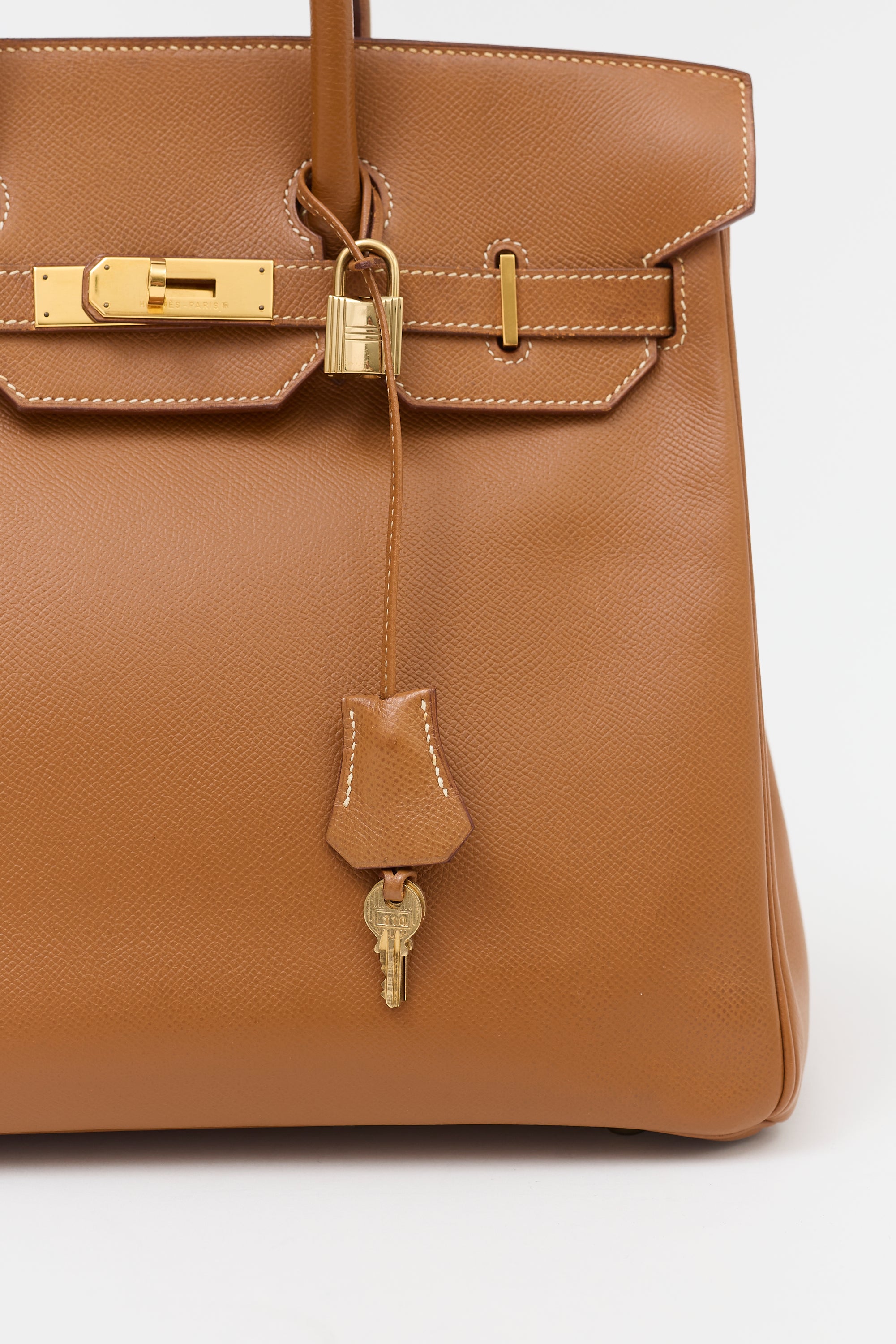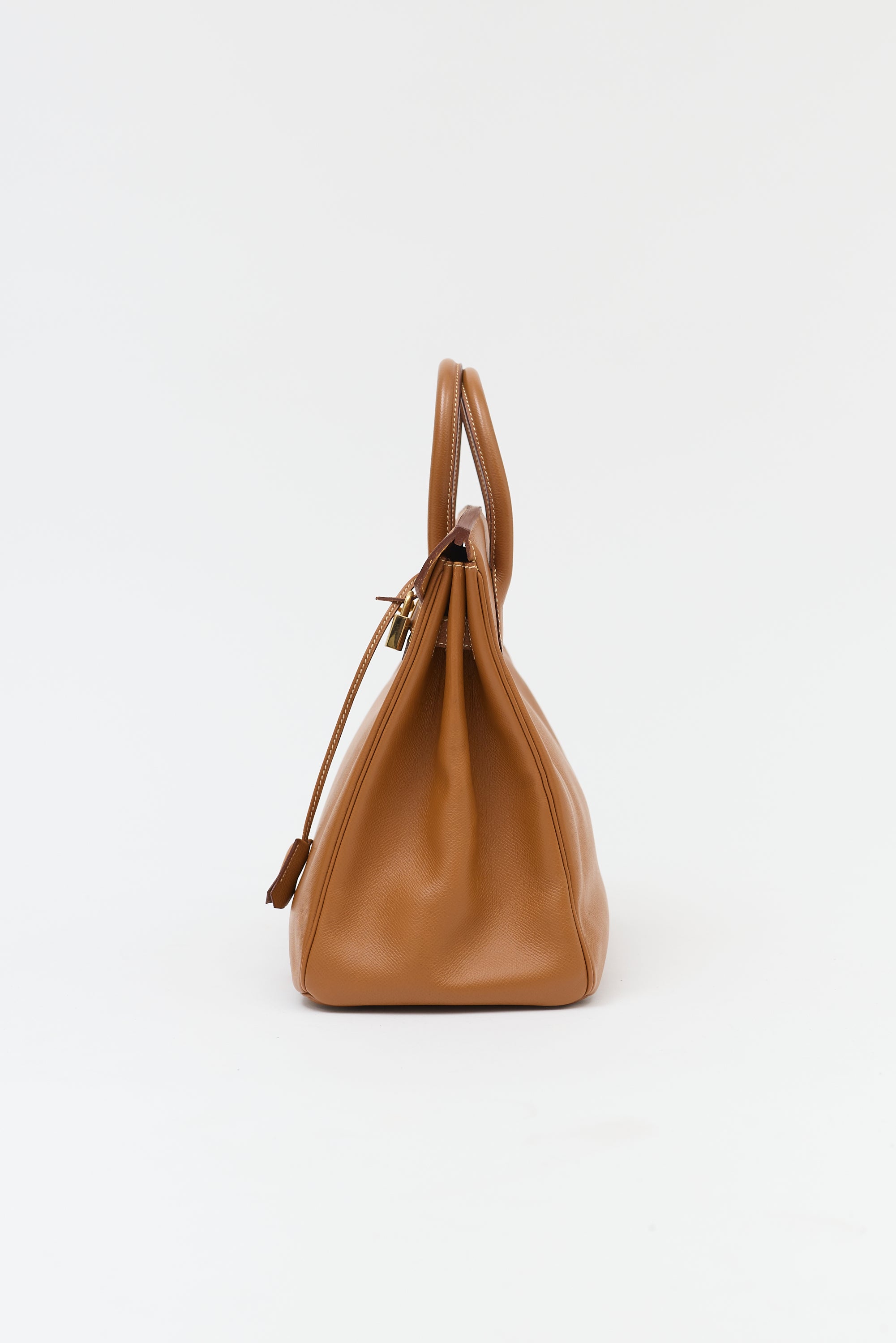 Pre-owned Hermès 1994 Haut à Courroies Birkin 32 bag in Gold Courchevel leather featuring dual rolled top handles, contrast stitching, gold plated hardware, sangles, logo engraved plaque, signature touret closure, stamped logo under top flap, four clou, detachable key and padlock clochette, and one main compartment with one zip pocket and one slip pocket. Comes with original dust bag.