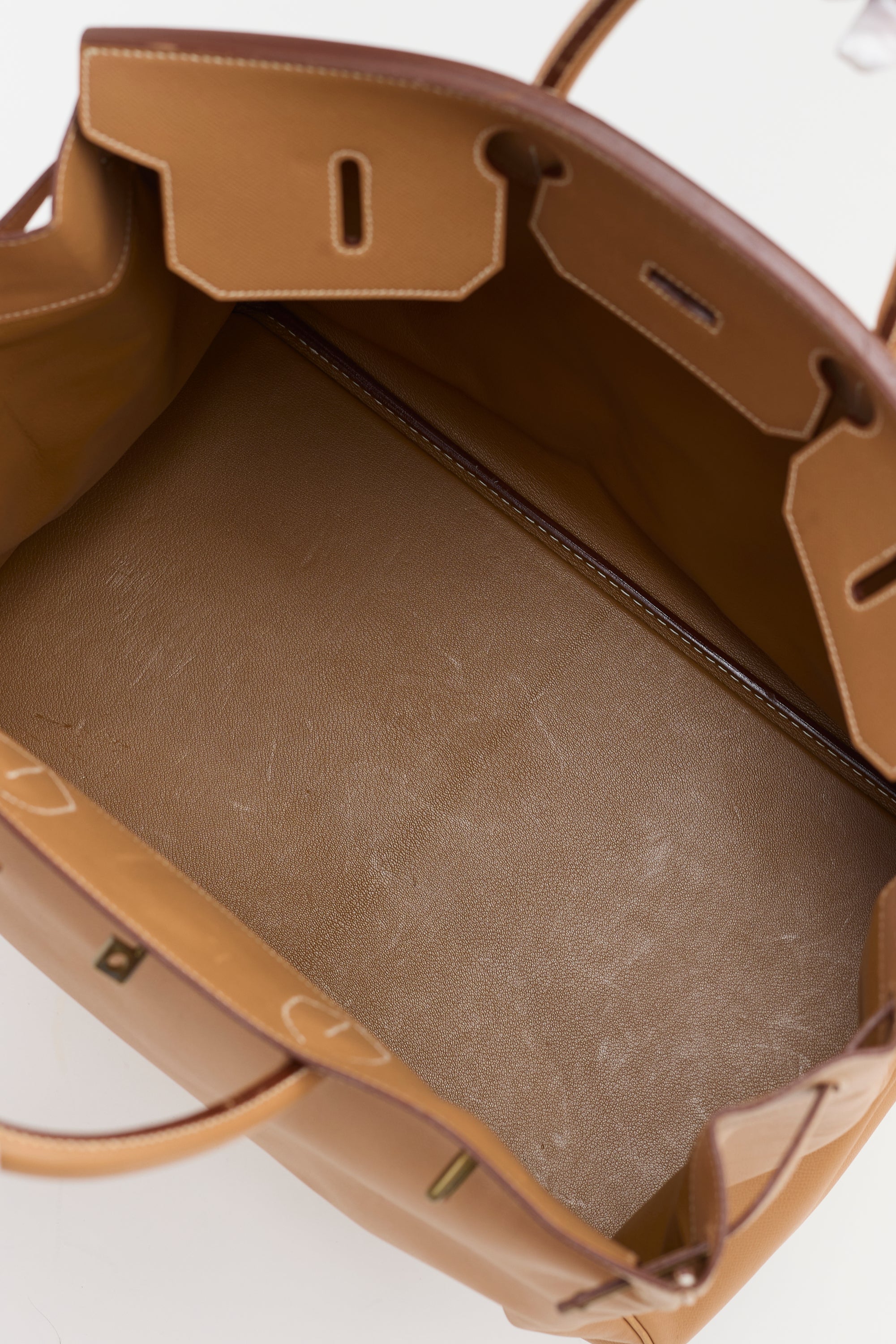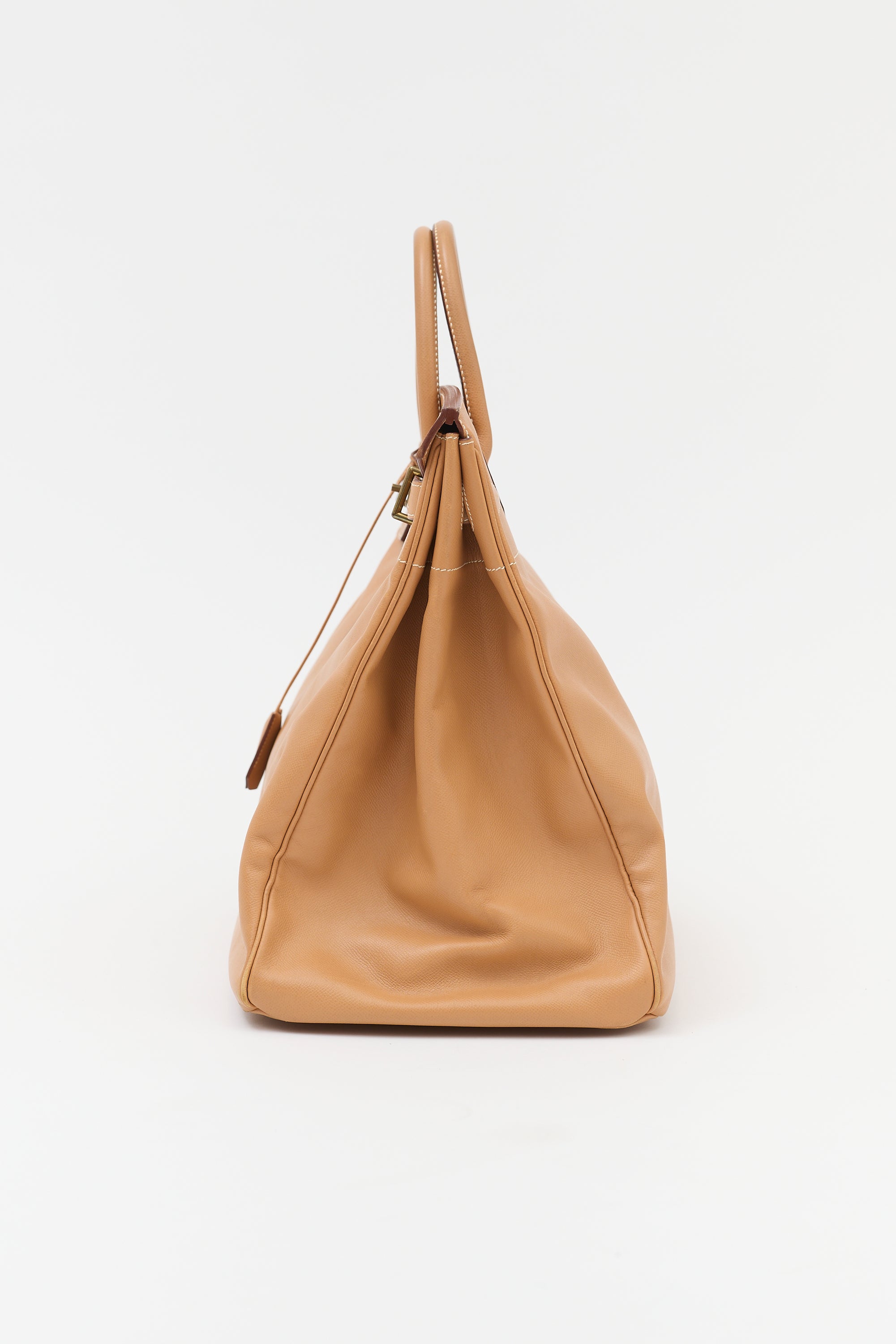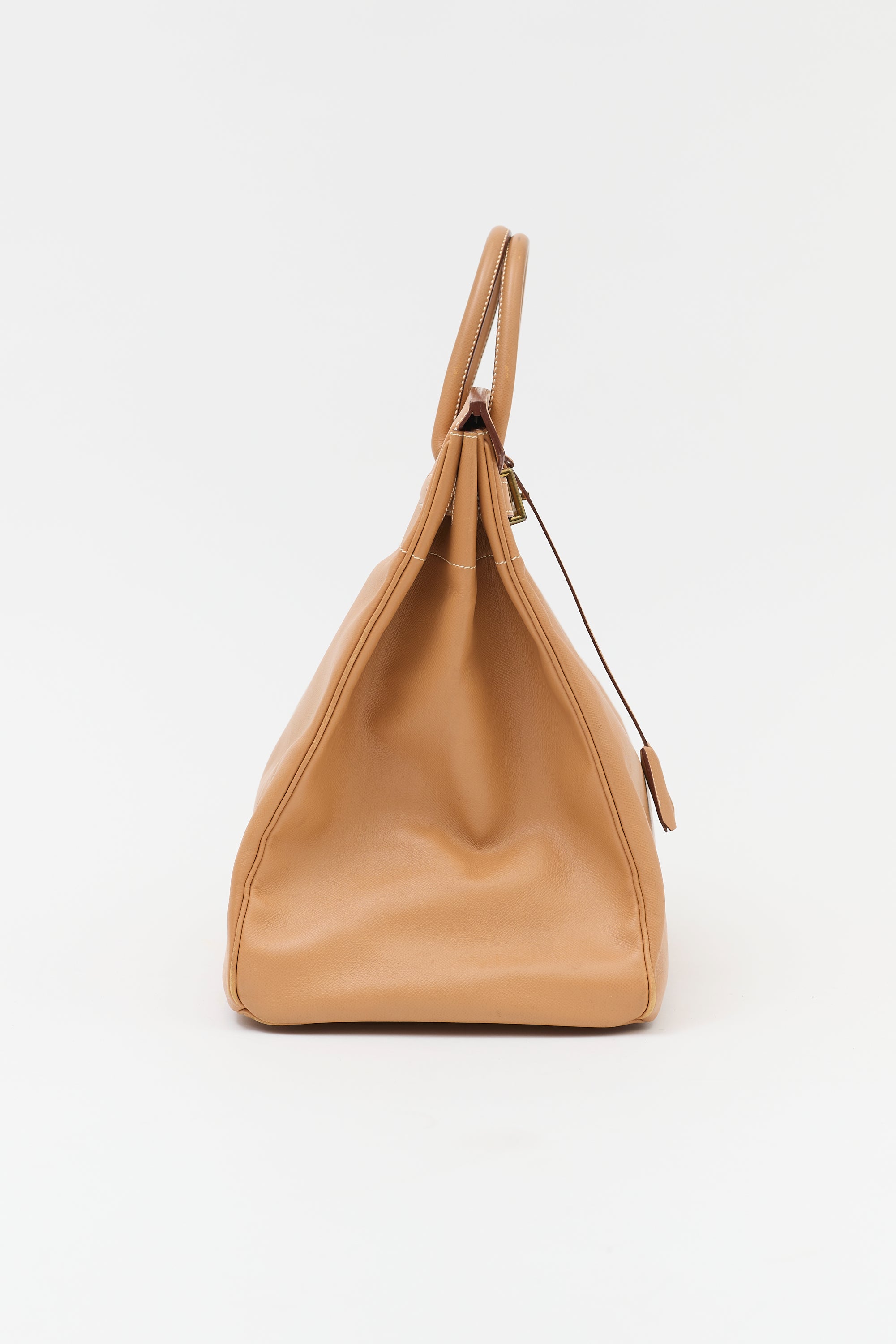 Pre-owned Hermès 1996 Haut à Courroies Birkin 45 bag in Natural Courchevel leather featuring dual rolled top handles, contrast stitching, gold plated hardware, sangles, logo engraved plaque, signature touret closure, stamped logo under top flap, four clou, detachable padlock and clochette, and one main compartment.
